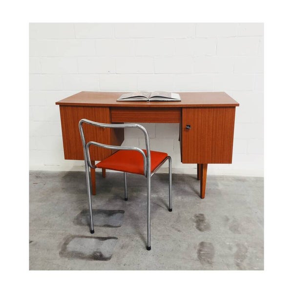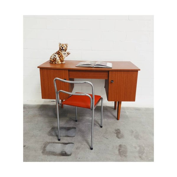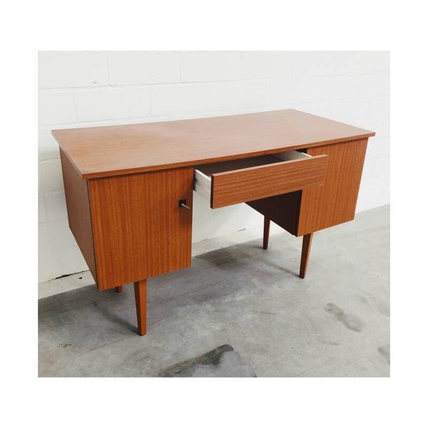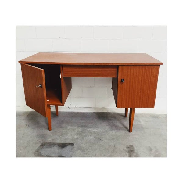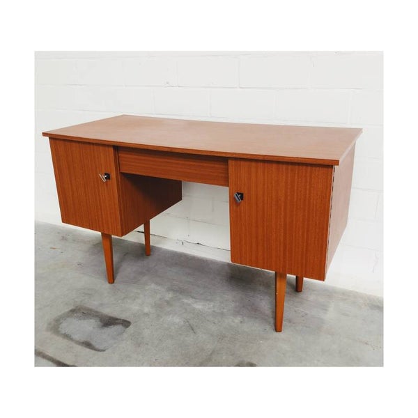 Dit prachtige vintage bureau is het ideale studeer- of werk meubel. Het bureau is vervaardigd in teak fineer. Het meubel heeft links en rechts twee kastjes die worden afgesloten met metalen sleutel en slot. Ook heeft het mid-century bureau een handige lade in het midden. Het meubel heeft wat zichtbare kringen op het bovenblad, (zie foto's voor details) maar is verder in goede staat!