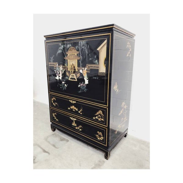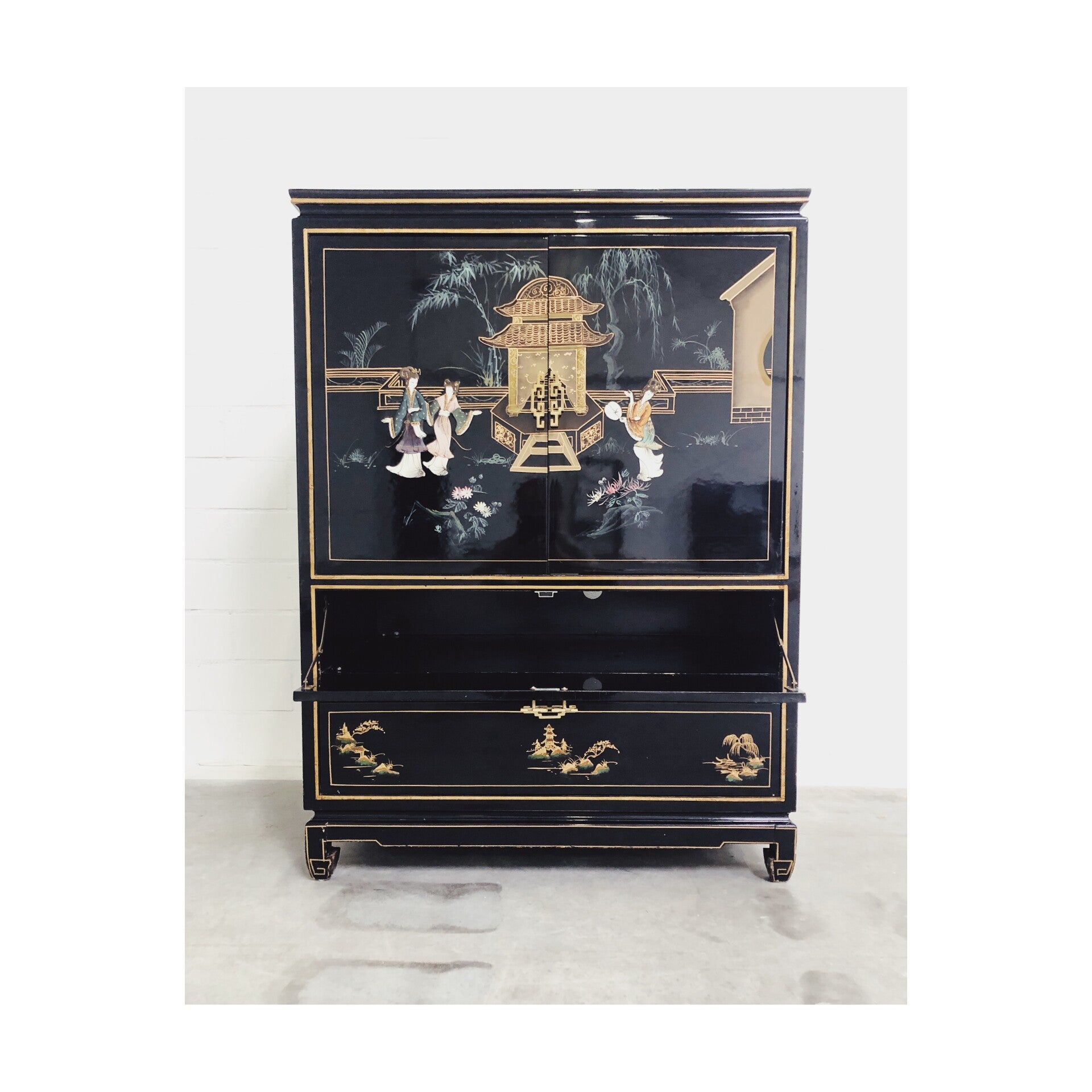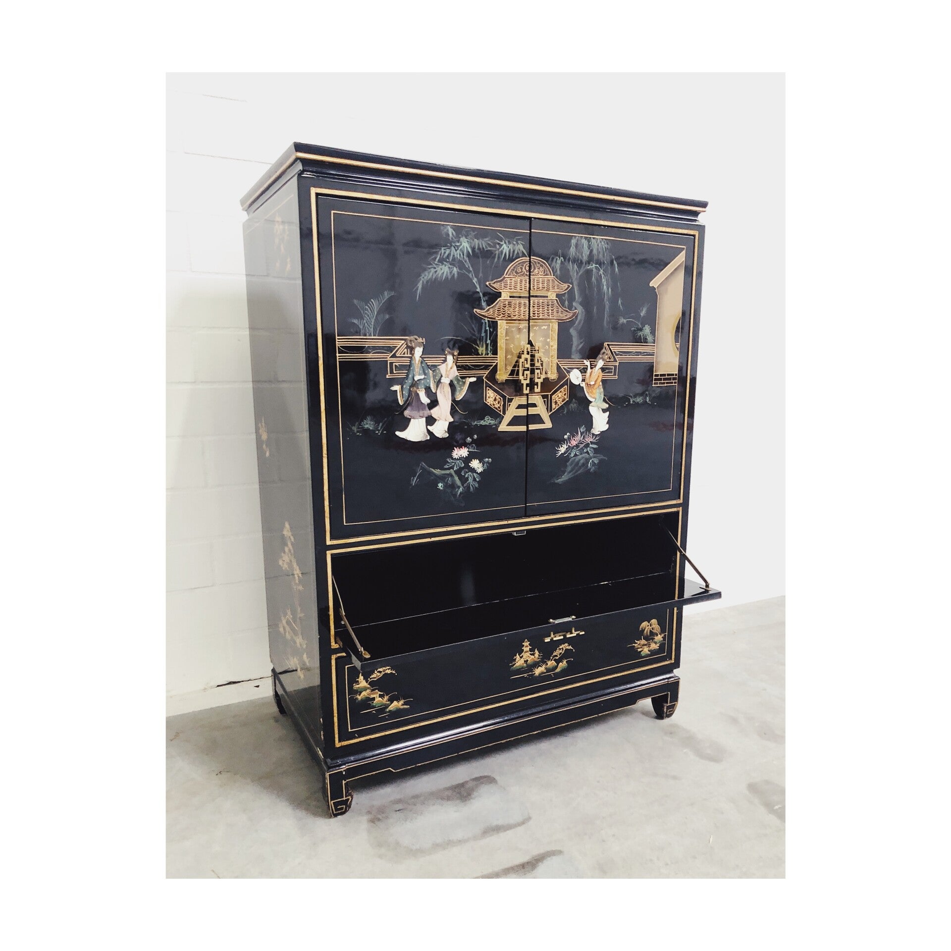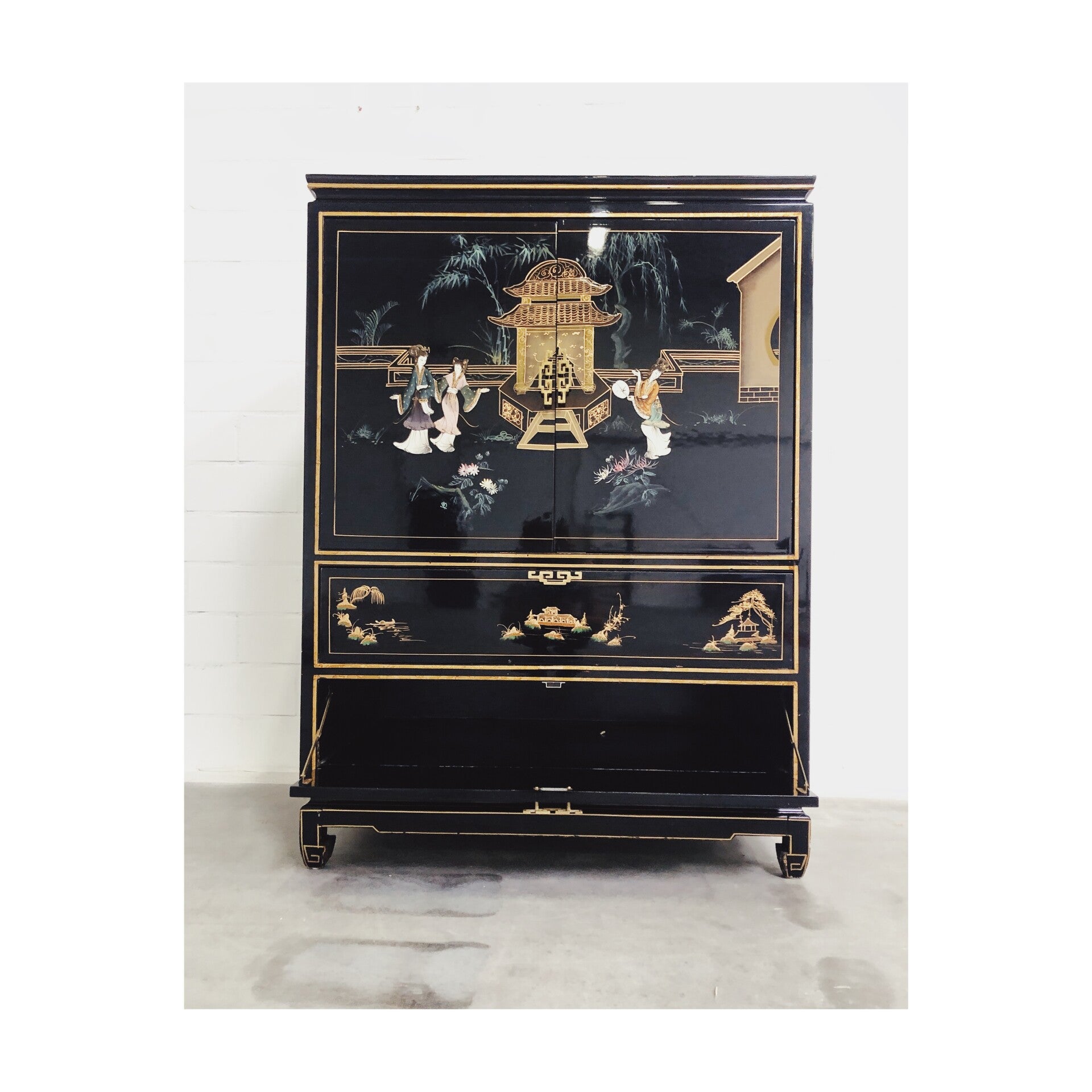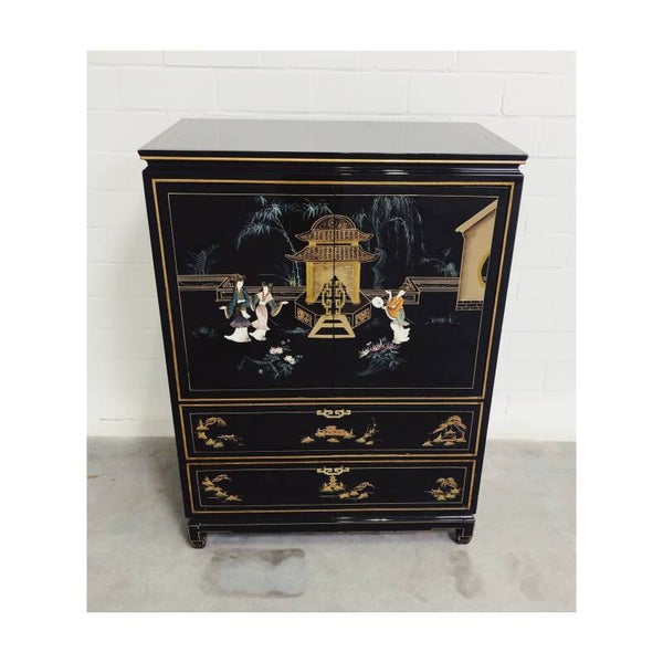 Zeer bijzondere met de hand geschilderde Chinese buffet/tv kast. De kast heeft een prachtig zwart gelakte achtergrond en heeft verschillende met de hand geschilderde plant, boom- en figuur motieven. Het meubel bestaat uit een groot boven compartiment wat wordt afgesloten met twee deuren. De onderzijde heeft twee brede kleplades die elk worden afgesloten met een messing handgreep. De kast heeft wat gebruikssporen naar leeftijd maar is nog hele goede conditie en zal een waanzinnige unieke toevoeging zijn aan je interieur.
