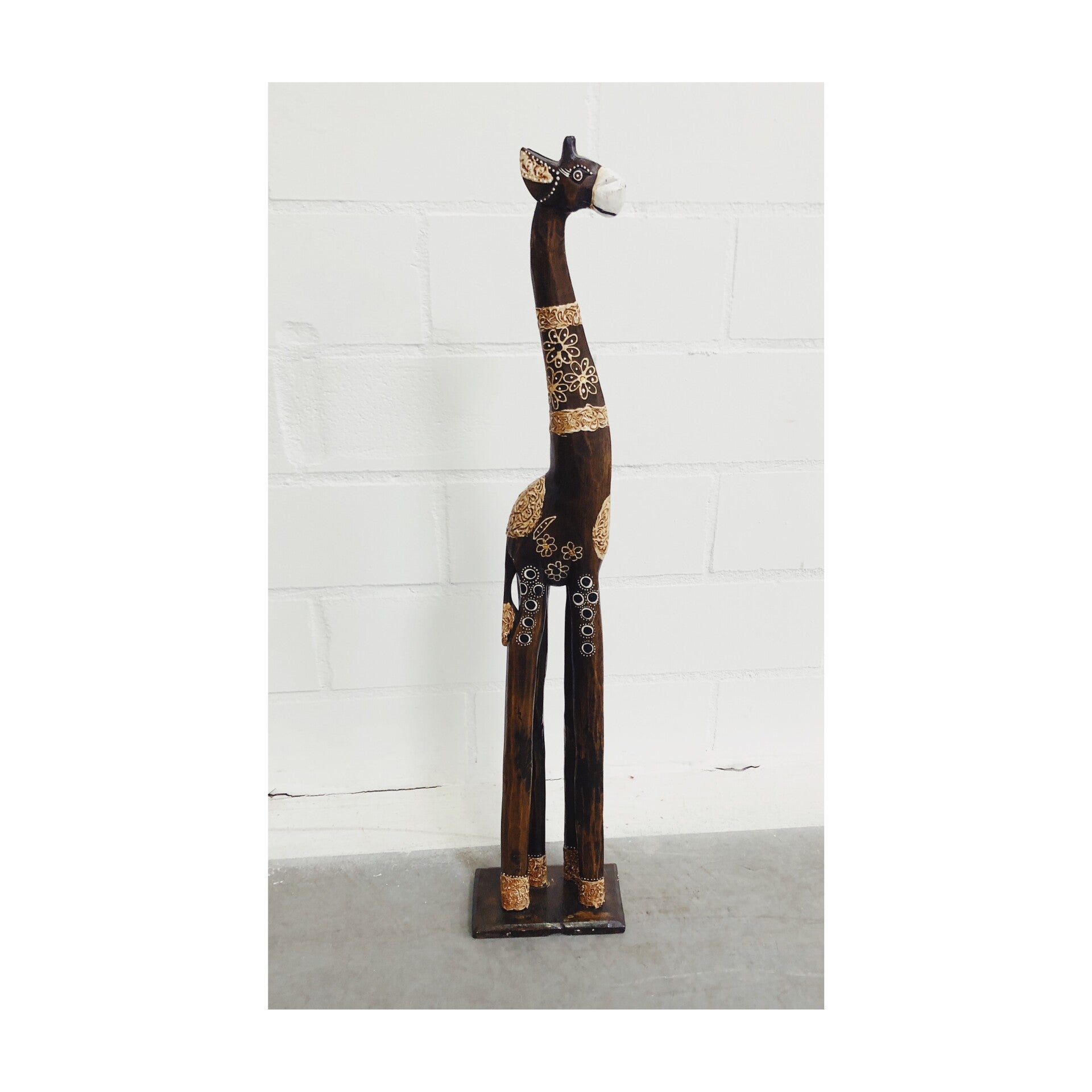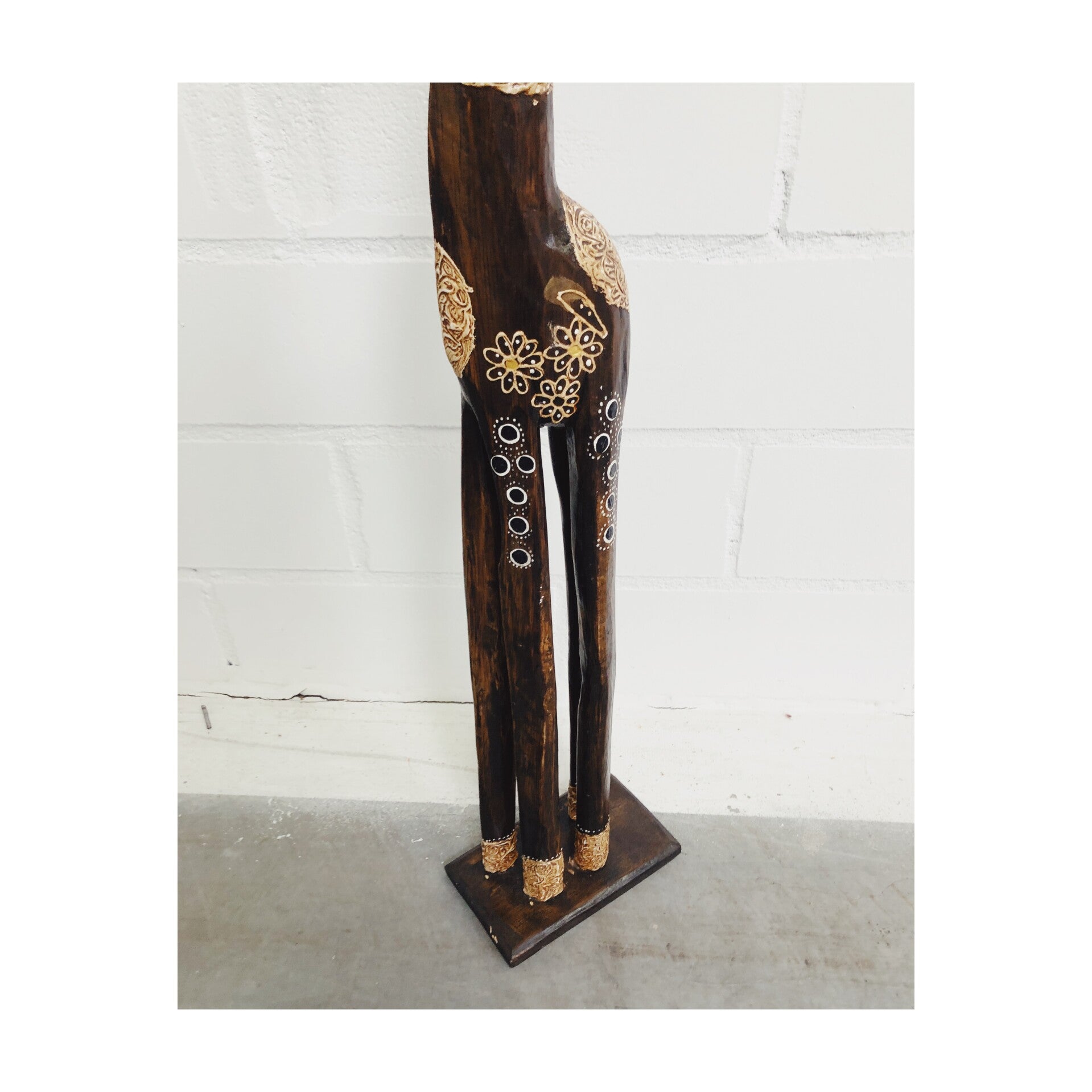 Houten sierbeeld van een giraffe met handgeschilderde sierlijke details. Deze uit hout gesneden giraffe zal een super leuke decoratie zijn voor het opleuken van je interieur. De giraffe is in goede staat en staat stevig op zijn houten voetstuk.