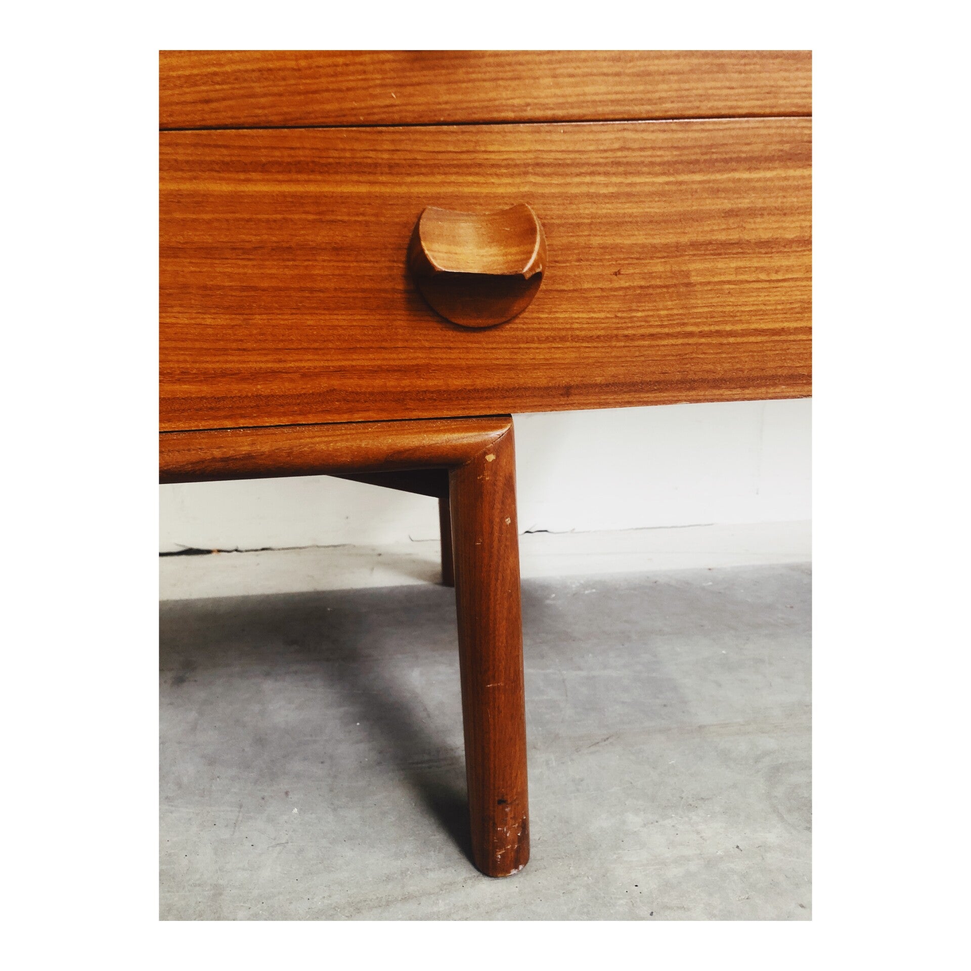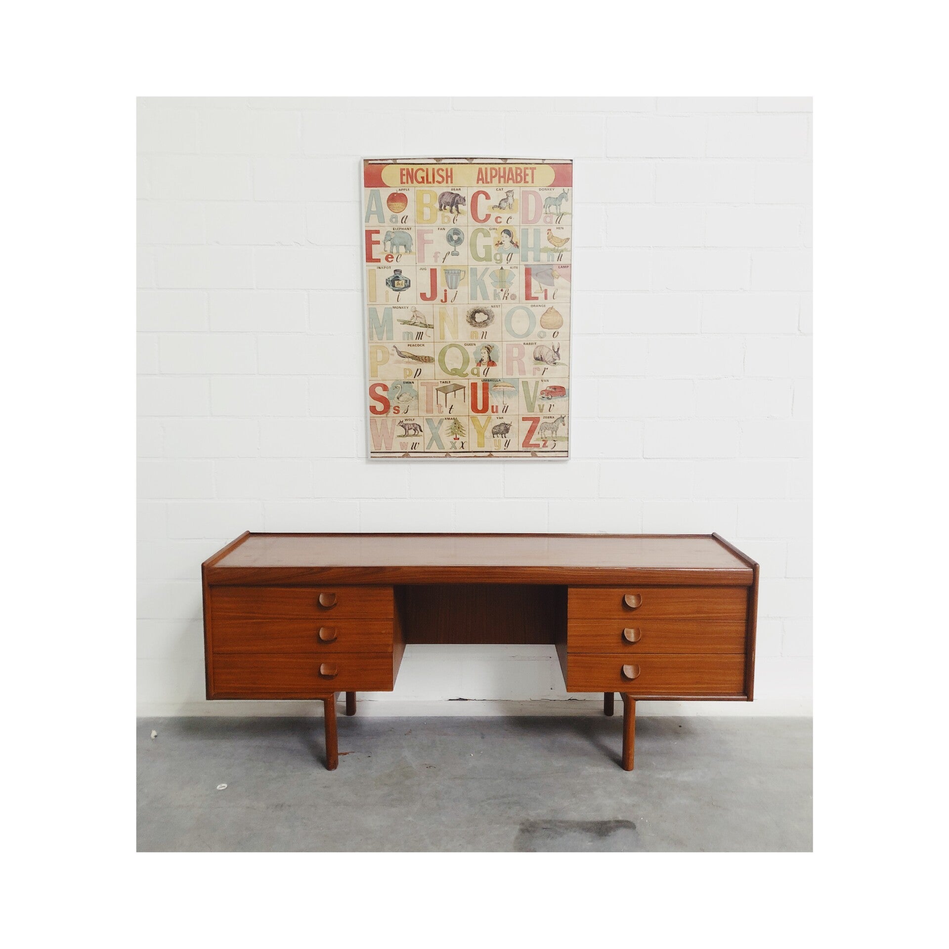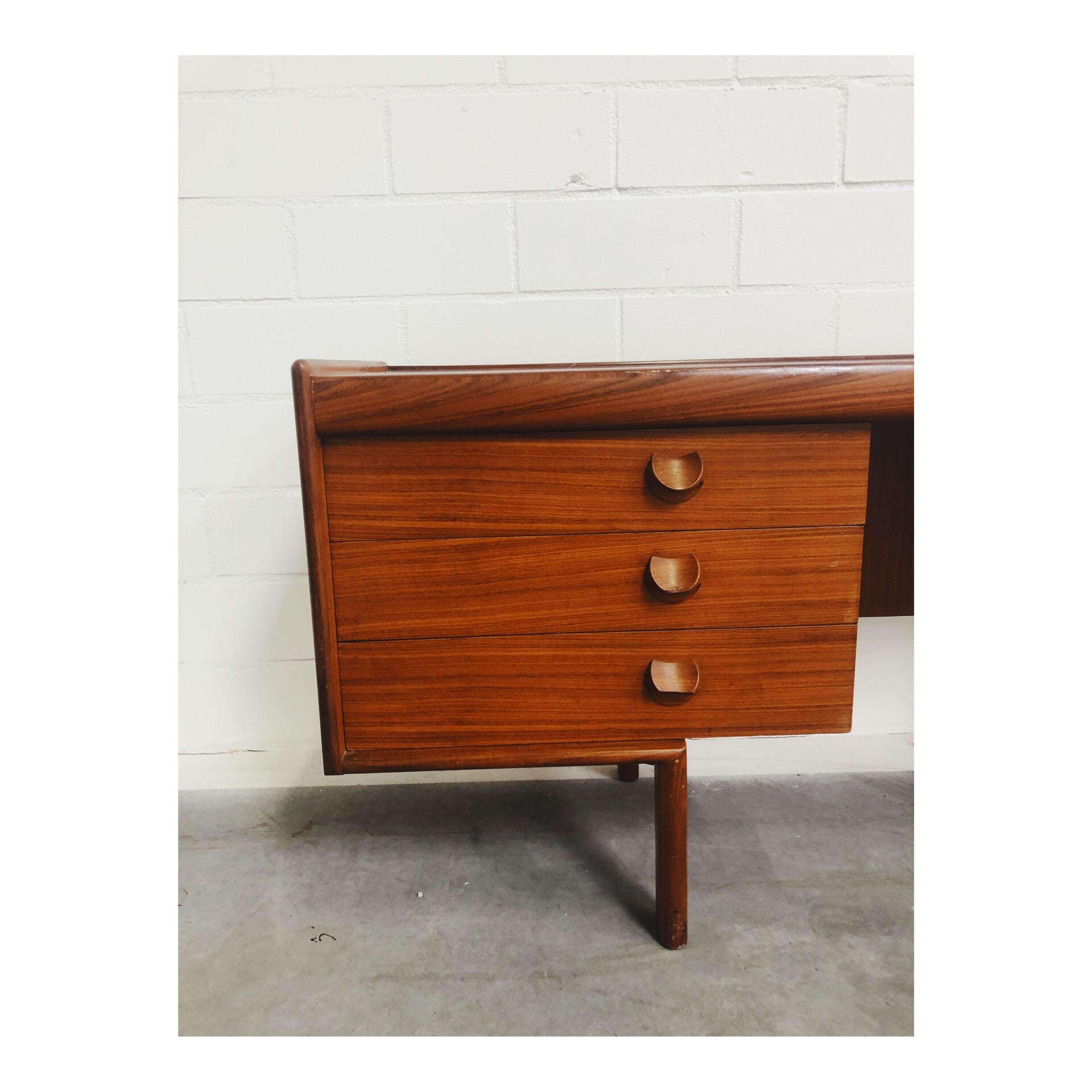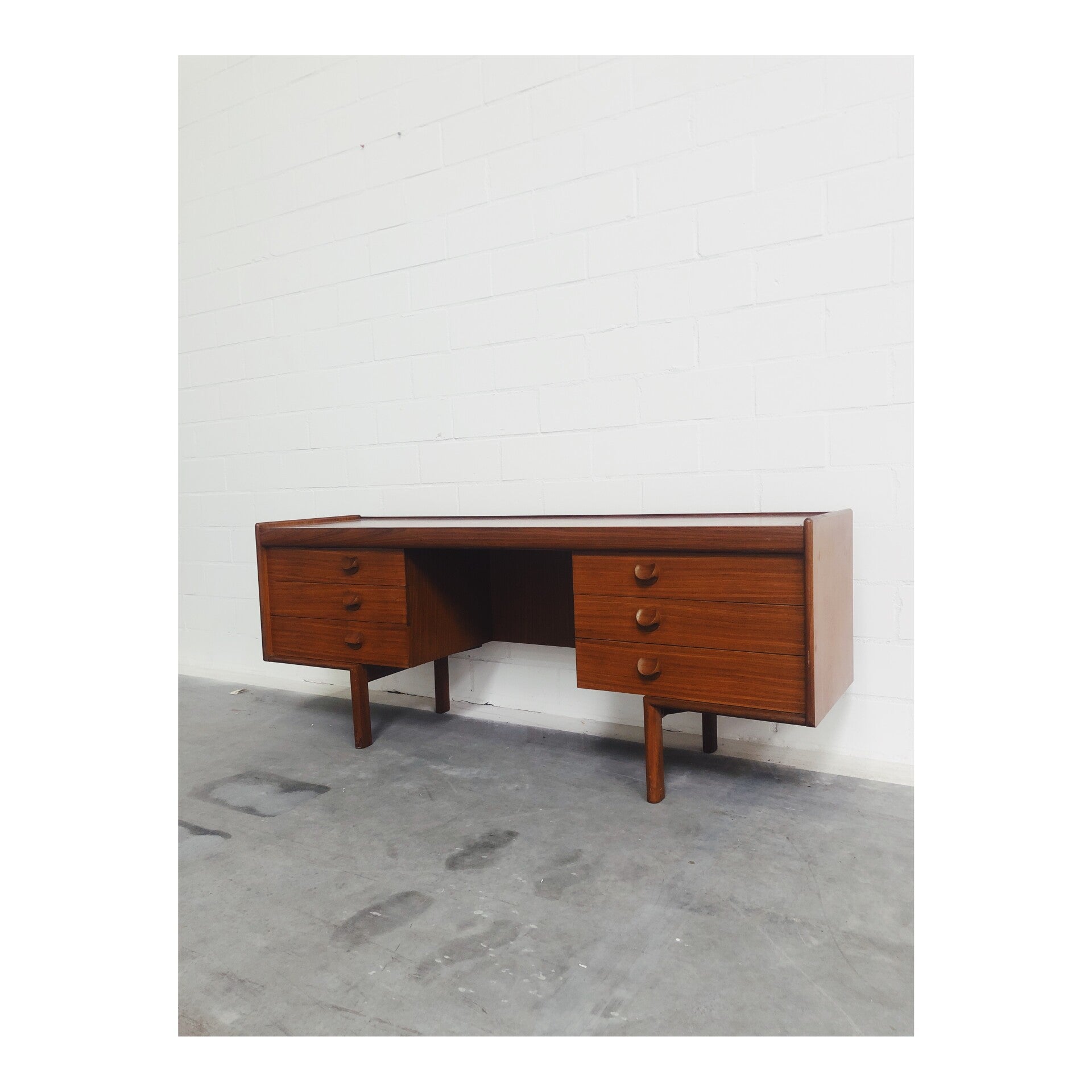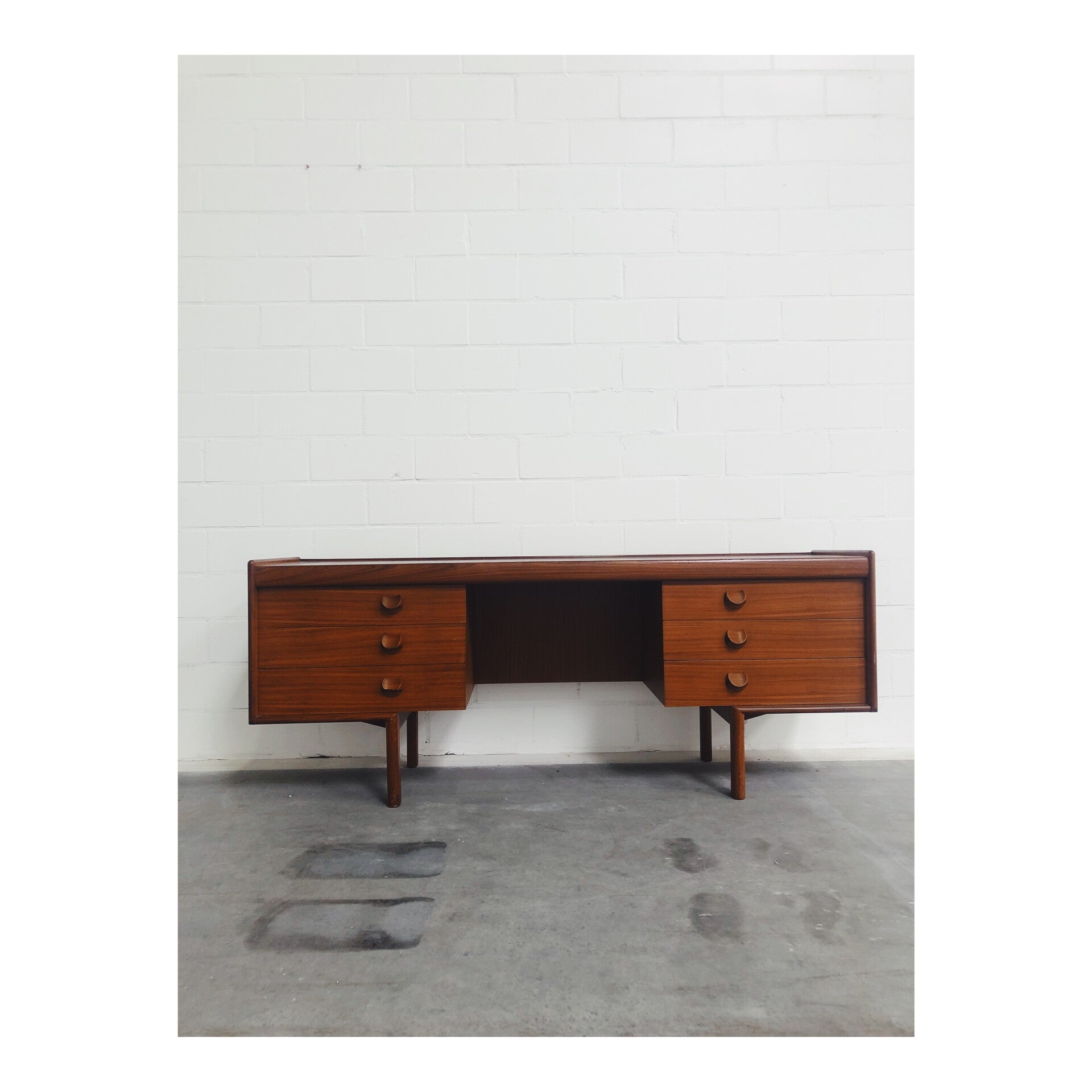 Mooi teak houten sideboard / bureau. Dit prachtige item is geheel vervaardigd van teak en afgewerkt met een glanslaag. Het bureau heeft aan elke zijde 3 brede opbergladen die elk worden afgesloten met een unieke houten handgreep. Twee handgrepen hebben een kleine beschadiging die alleen van heel dicht bij echt zichtbaar zijn. Het bovenblad heeft wat mini gebruikssporen maar verder is dit unieke meubel in hele goede staat!