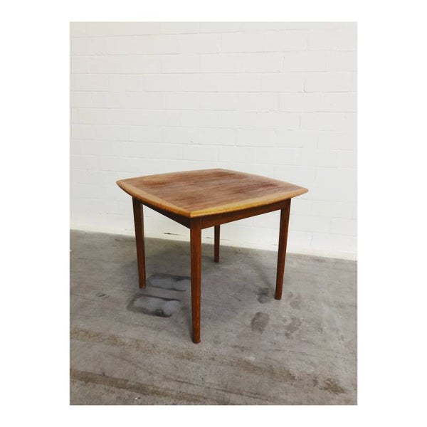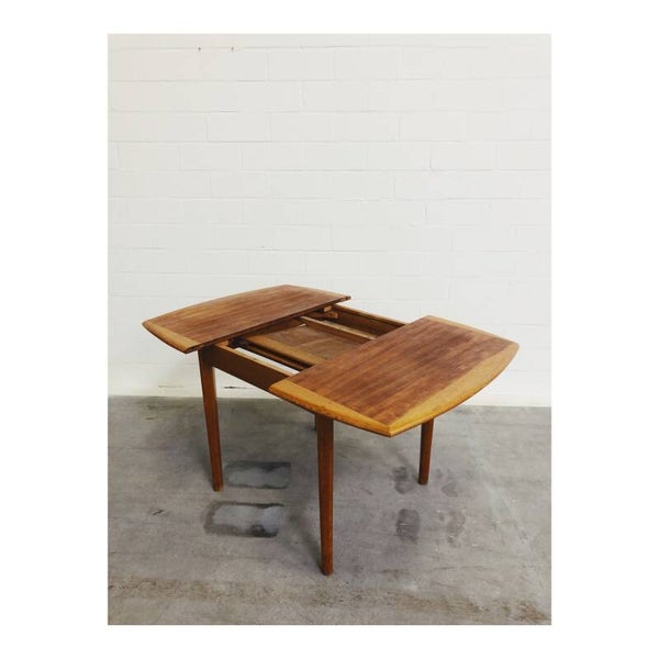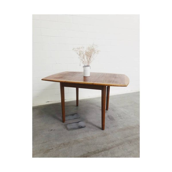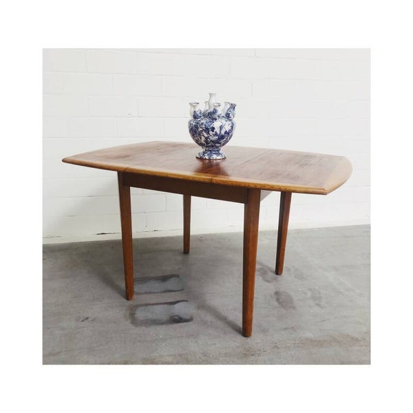Deze mid century eettafel is niet alleen een lust voor het oog maar is super handig! Deze Scandinavische teakhouten uitschuifbare eettafel is perfect voor twee, vier maar ook zelfs zes personen. Het onderstel van de tafel bestaat uit een mooi gevormd frame van massief teakhout en heeft schuine uiteenlopende poten. Het tafelblad bestaat uit totaal drie delen, het hoofdblad is uittrekbaar, waardoor een extra stuk handig uitgeklapt kan worden. De tafel heeft hier en daar wat kleine vlekjes op het blad en op de poten maar is verder nog in top conditie!