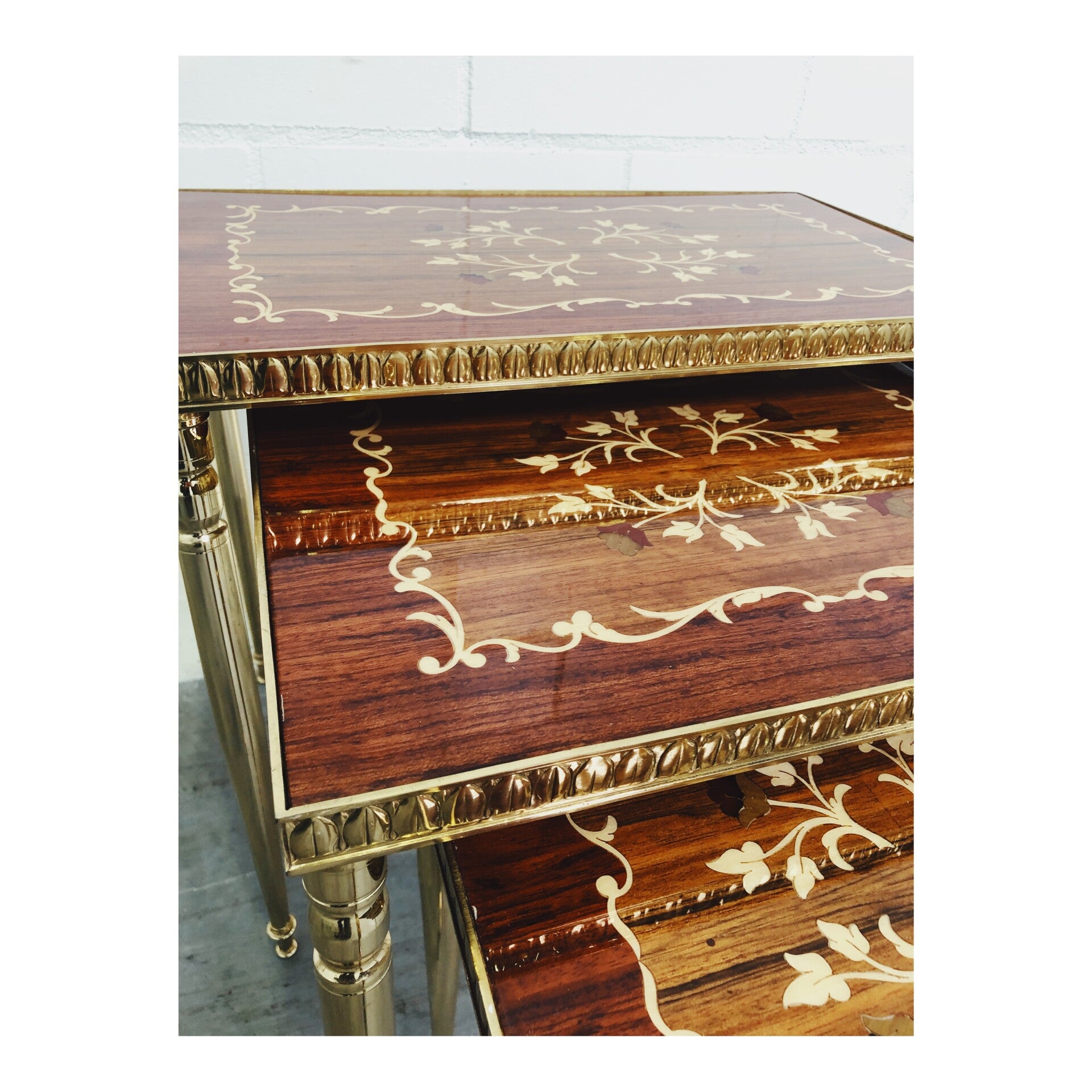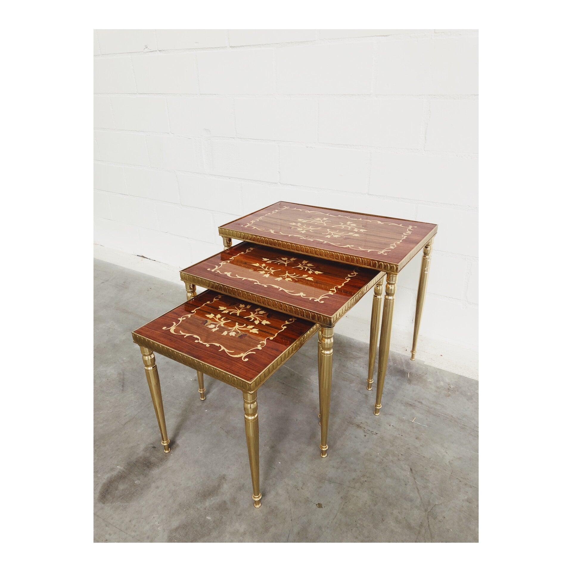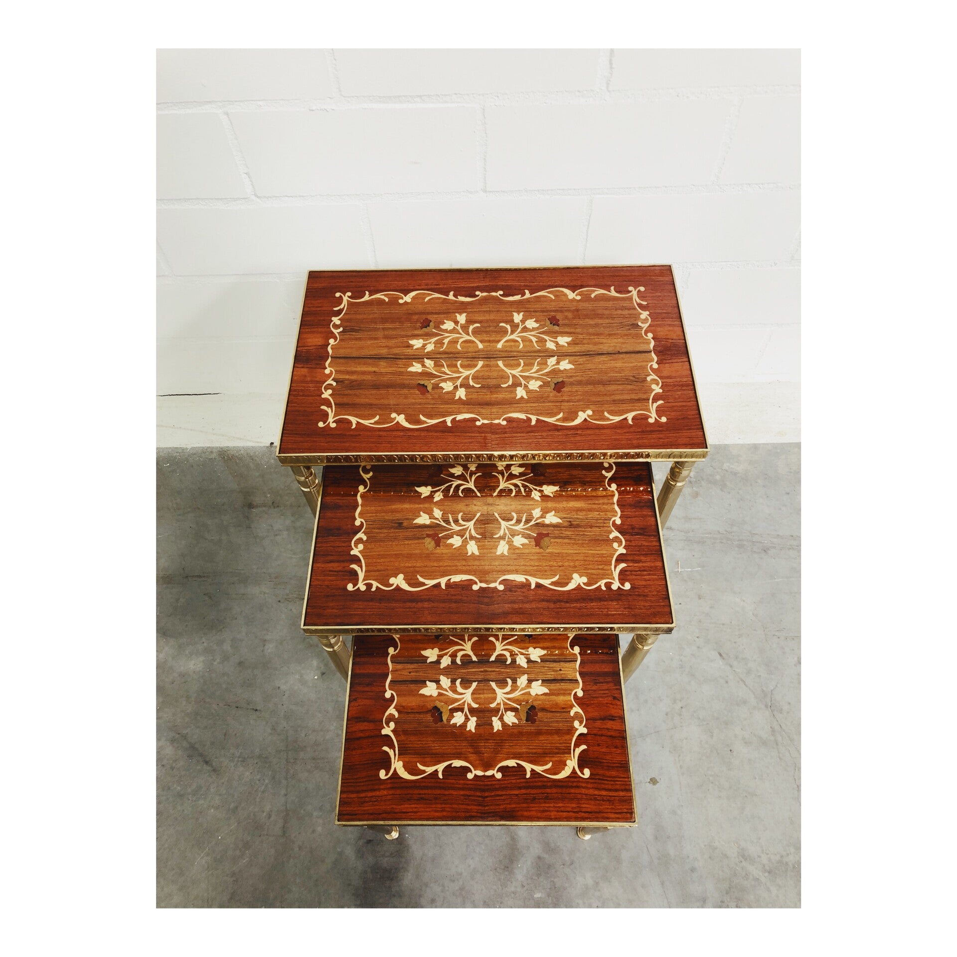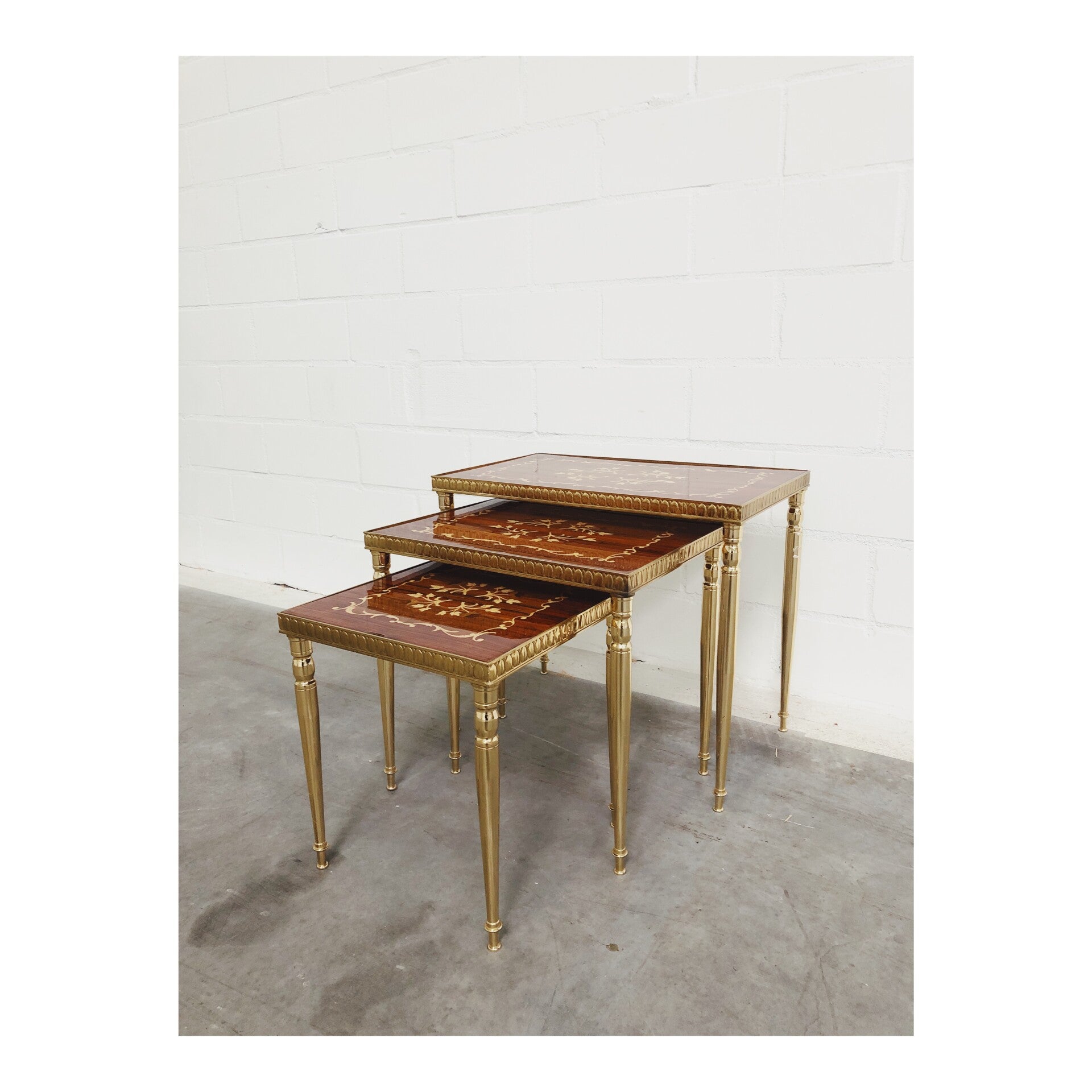 Elegante Italiaanse Mimiset! Deze set tafeltjes hebben prachtig decoratief inlegwerk uit een combinatie van pallisander, mahonie en ebbenhout. De tafeltjes met bloemenmarqueterie zijn geheel bedekt met een glanzende laklaag. De bijzettafels staan op een prachtig onderstel gemaakt van messing!