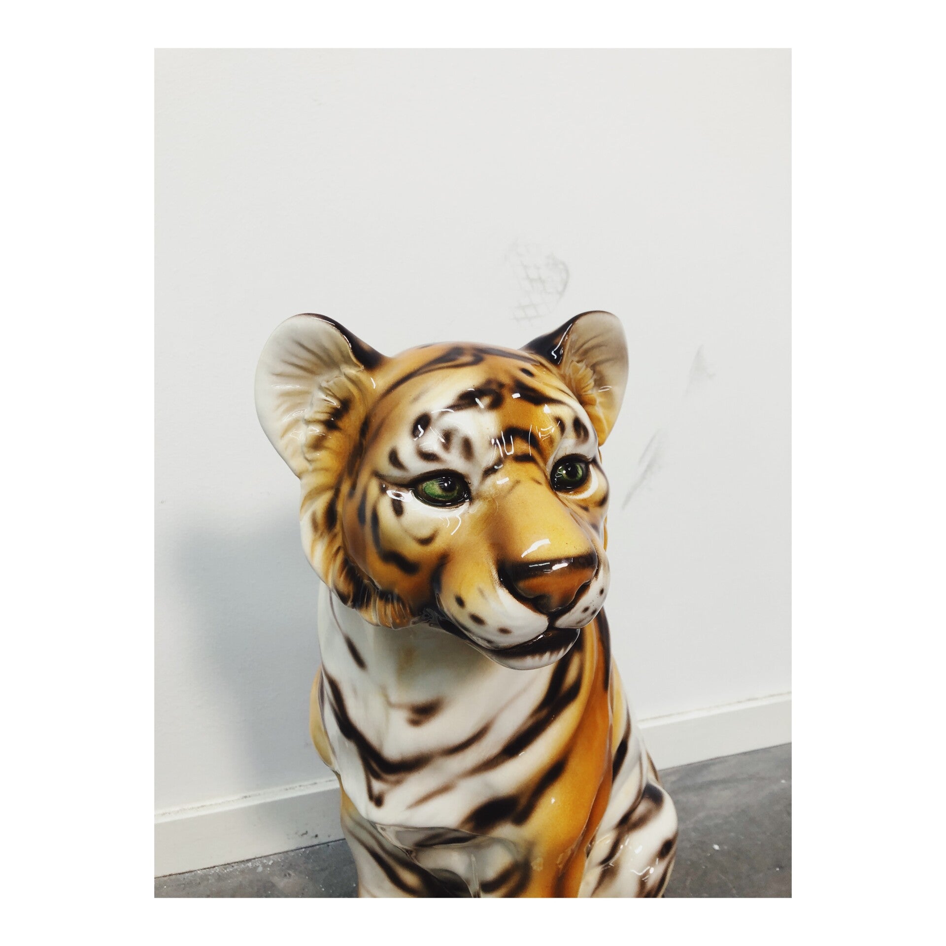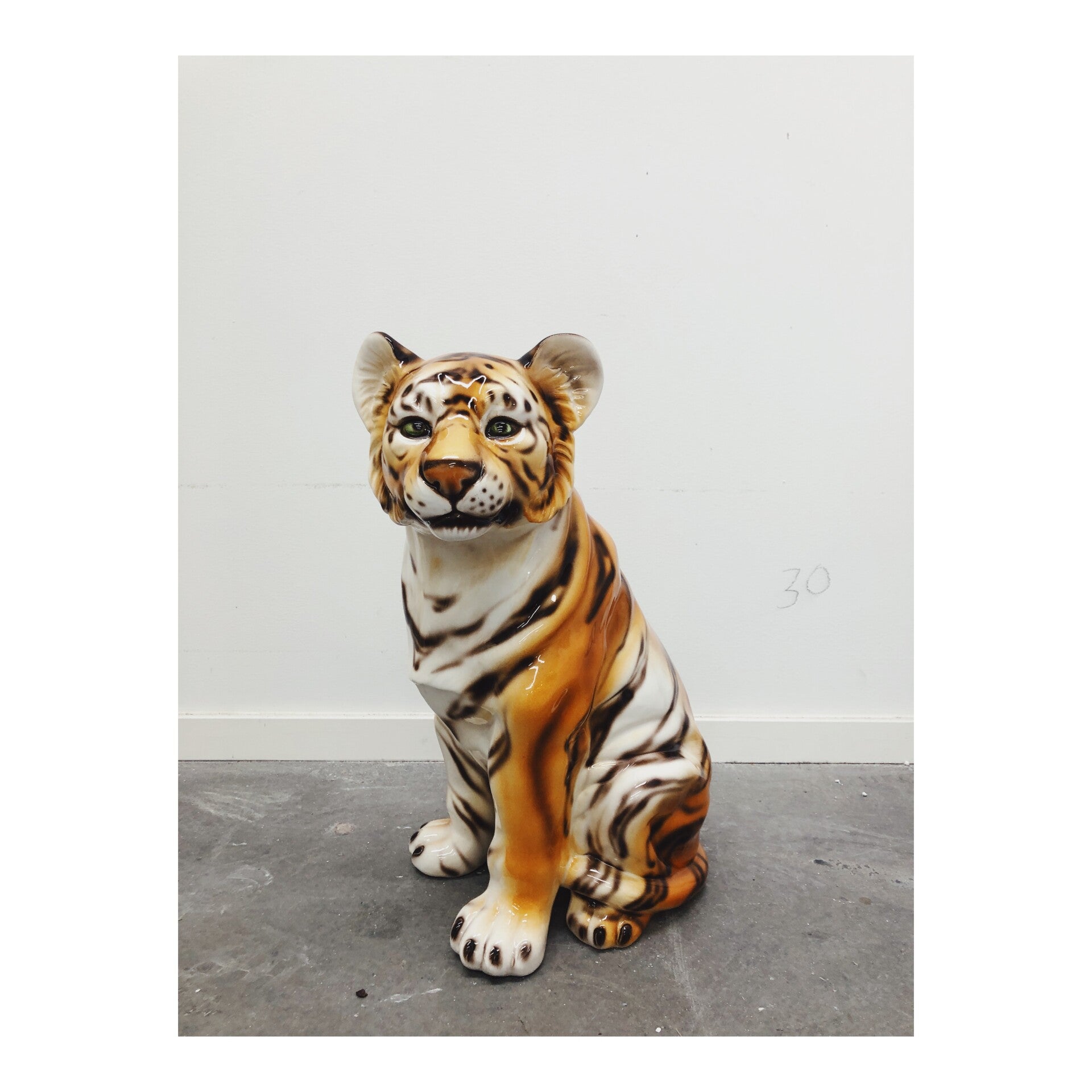 Prachtig decoratiebeeld van een tijger welpje. Het beeld is gemaakt van keramiek en handgespoten met de airbrush. Dit gave hollywood regency beeld is gemaakt in Italië. Het zittende tijger welpje heeft de ideale hoogte voor zowel op een vloer als bovenop een kastje.