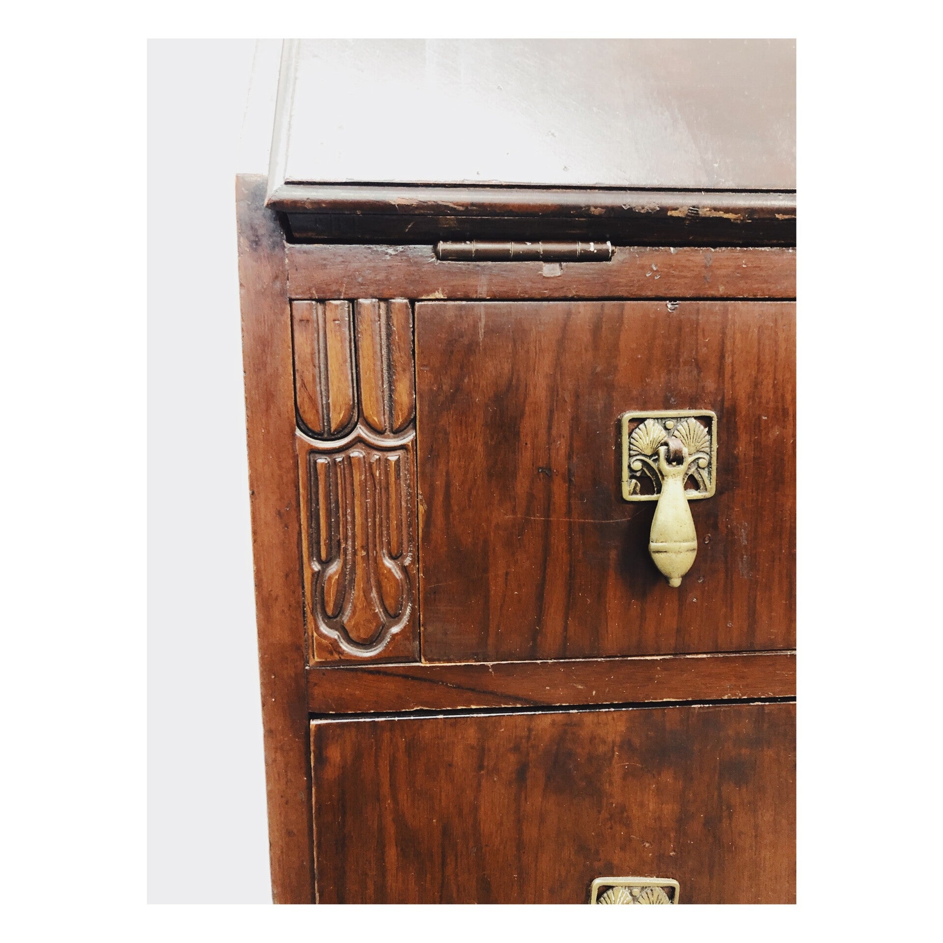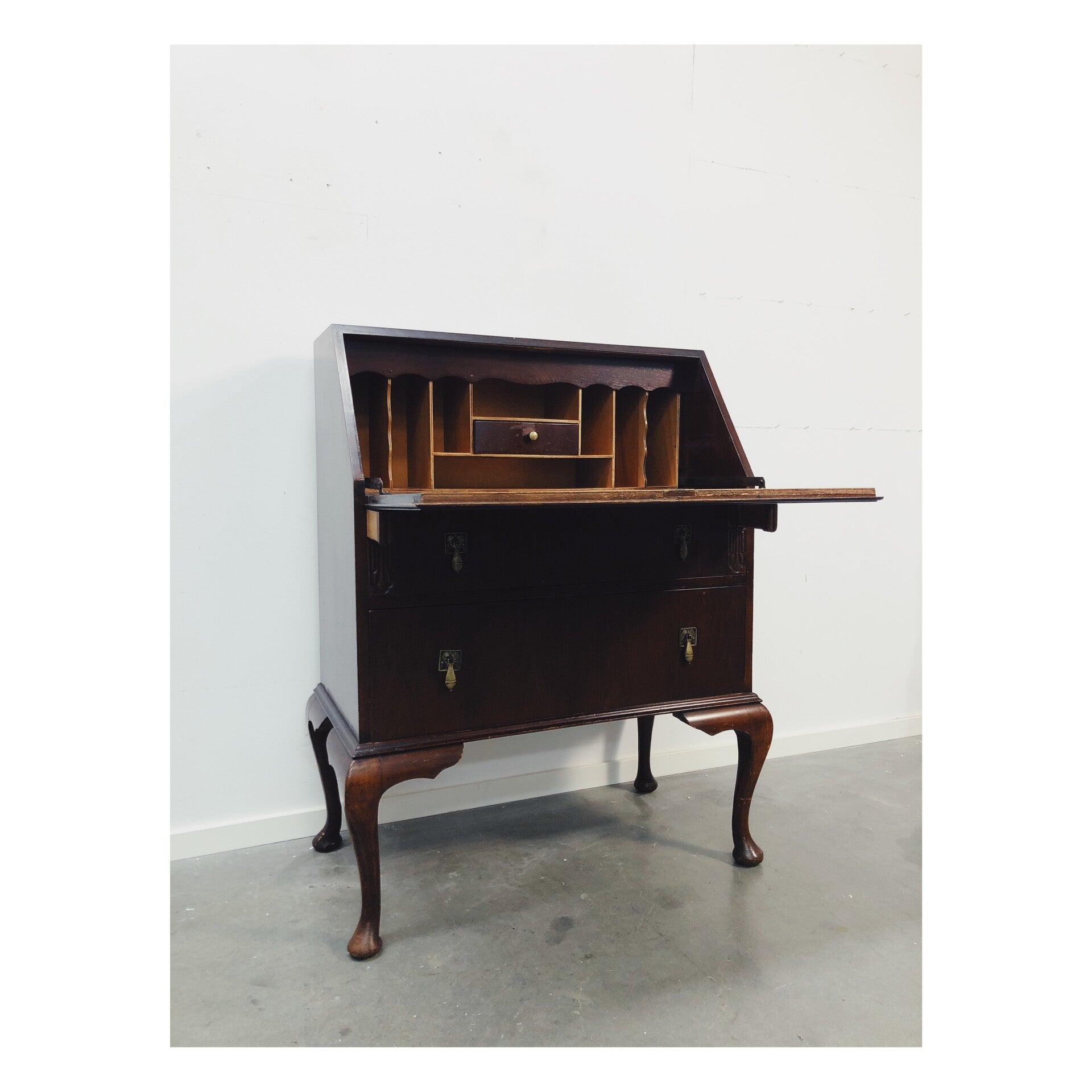 Elegante secretaire op sierlijke gebogen poten. Het bureau heeft twee ruime opbergladen met messing knopjes en een afsluitbare schrijfklep. De klep verbergt een prachtig opberg vak met kleine laden en super veel handige vakjes! Het bureau heeft wat krassen passend bij de leeftijd, maar is zeker nog klaar voor een volgende ronde!
