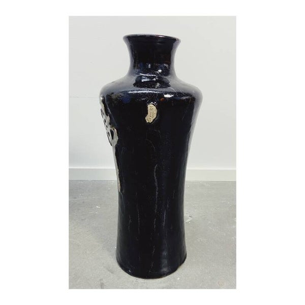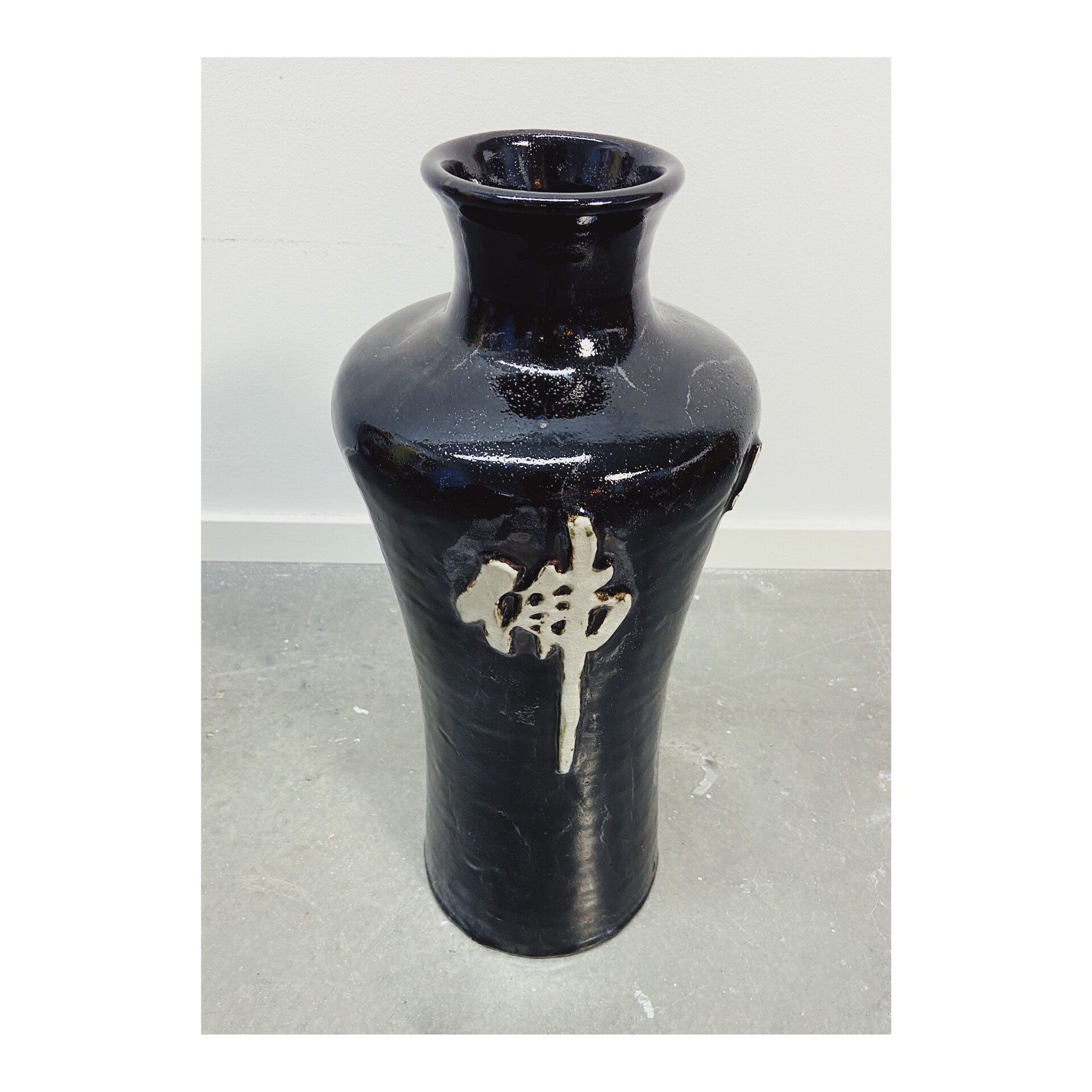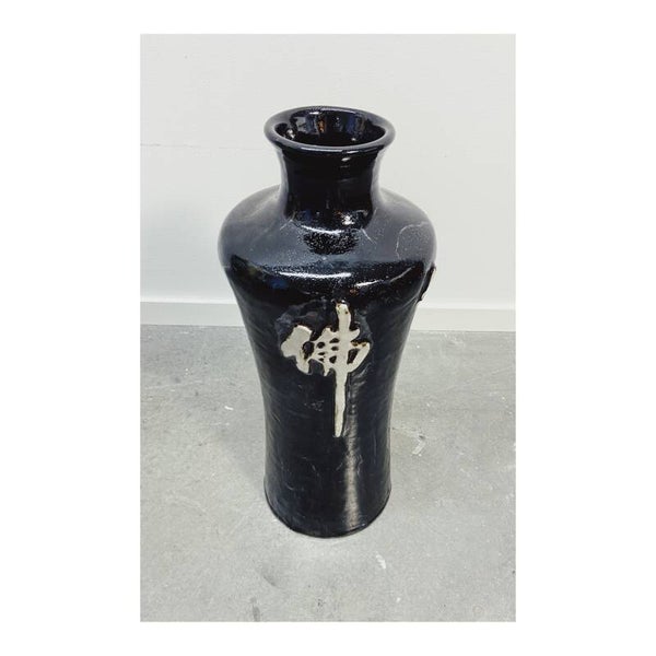 Grote zwart geglazuurde keramieken vaas. De bijzondere vaas is van massief keramiek en bezit een wit geglazuurd chinees woord vertaald als; Boeddha. De vaas is in hele goede vintage conditie en zal perfect dienen als decoratie of als (droog) bloemen vaas.