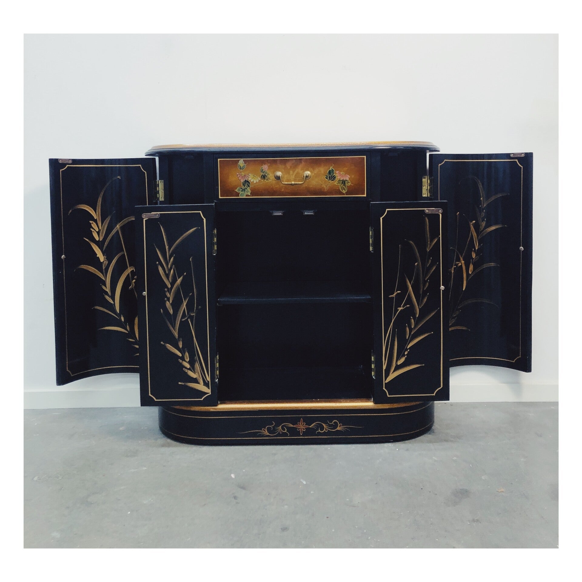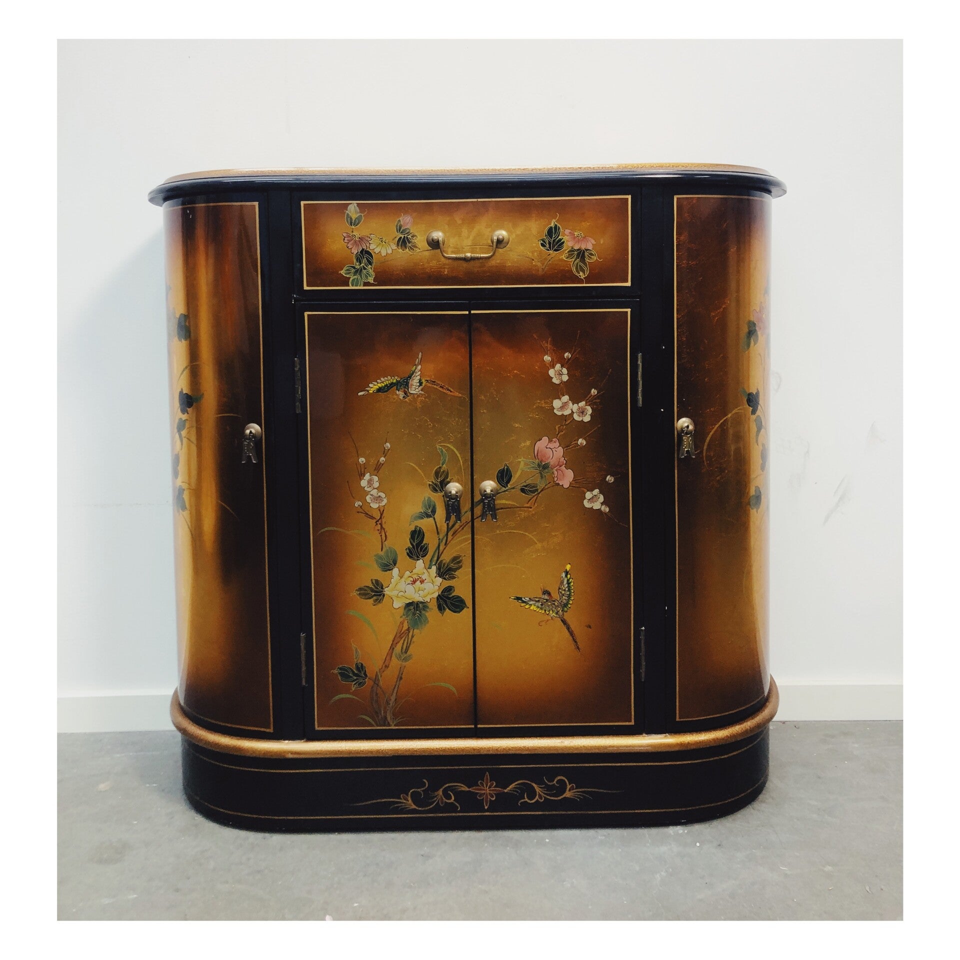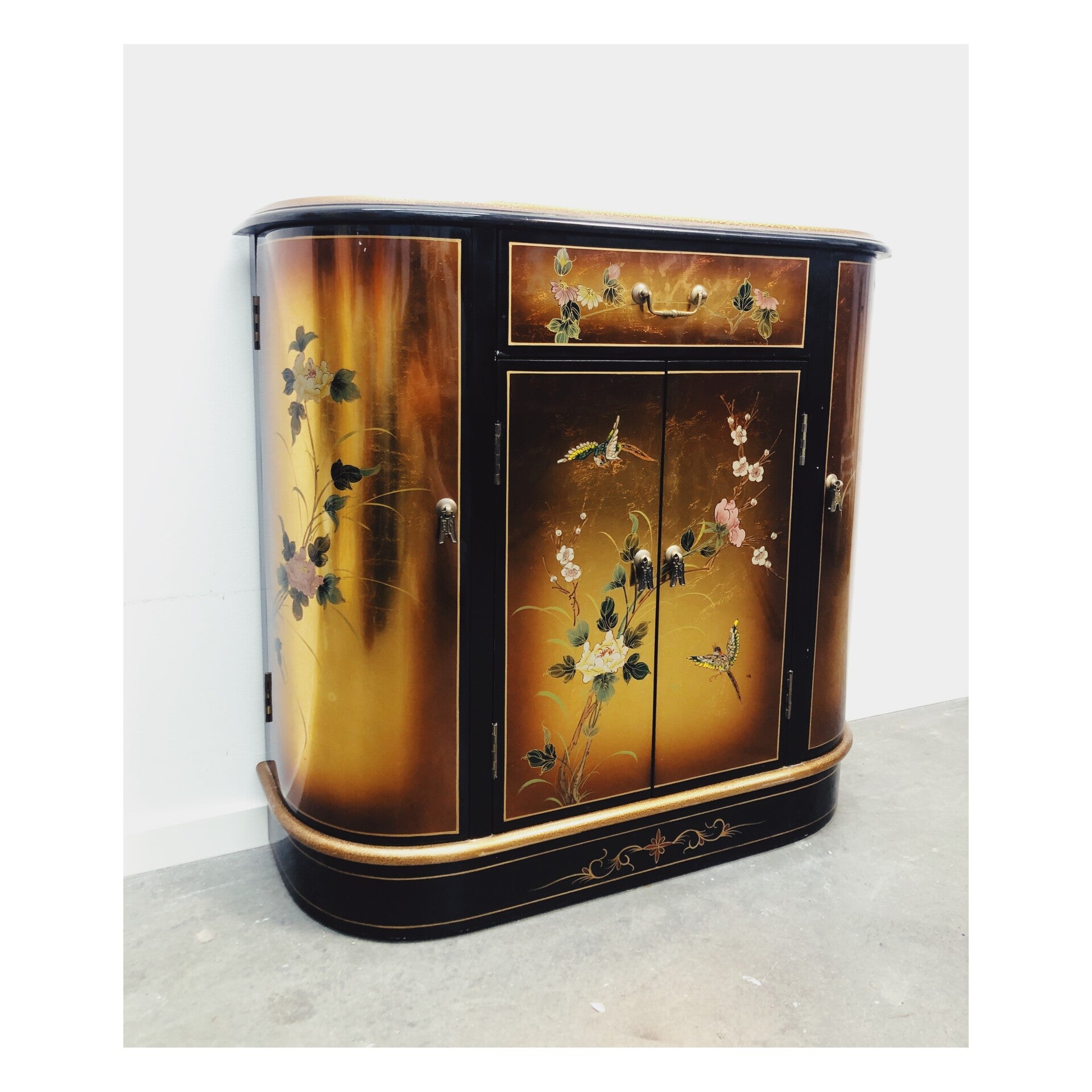 Hoe mooi is dit Oosterse drankkastje? De kast heeft een prachtige vergulde achtergrond en heeft verschillende met de hand geschilderde plant- en vogelmotieven! Het compacte dressoir heeft verschillende opbergmogelijkheden waaronder een lade, twee gebolde zijdeuren en een middenplank afgesloten door twee deuren. Alles wordt afgewerkt met sierlijke details en prachtig hang- en sluitwerk. De kast is in uitzonderlijk goede conditie.