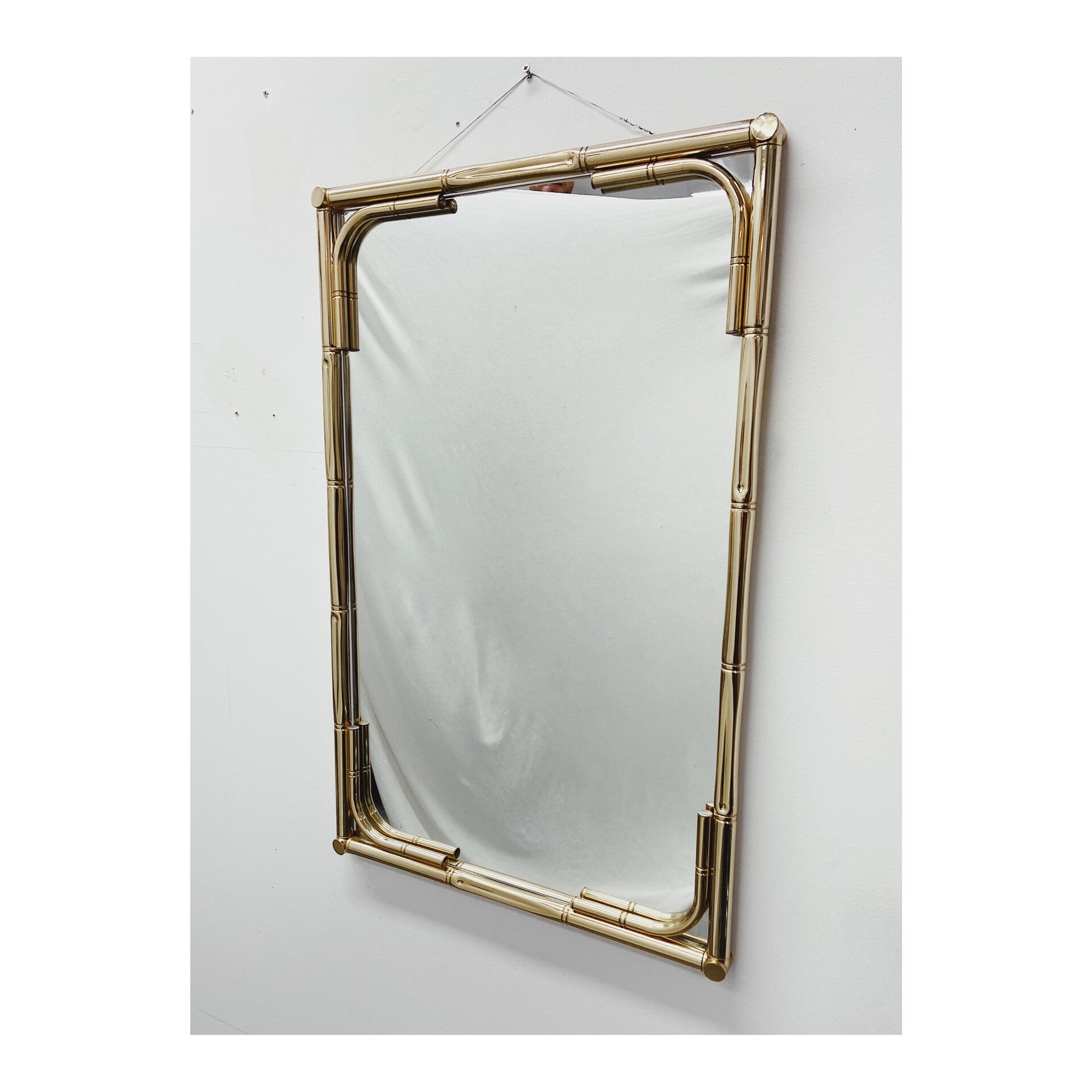 Mooie gouden messing vintage spiegel. Deze prachtige spiegel met gespiegelde gouden lijst heeft een bamboe omlijsting vervaadigd in messing. De spiegel heeft wat kleine gebruiksporen in het messing maar is verder goede vintage staat en kan ook opgehangen worden.