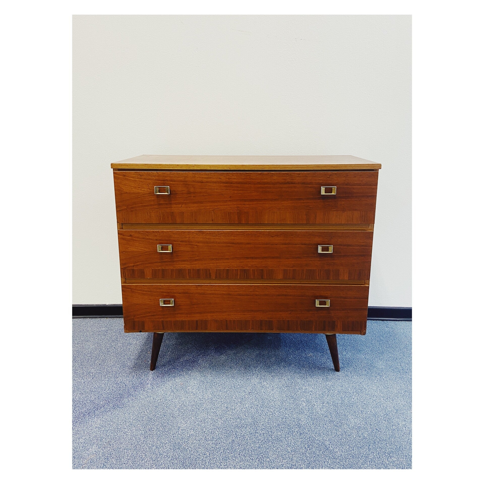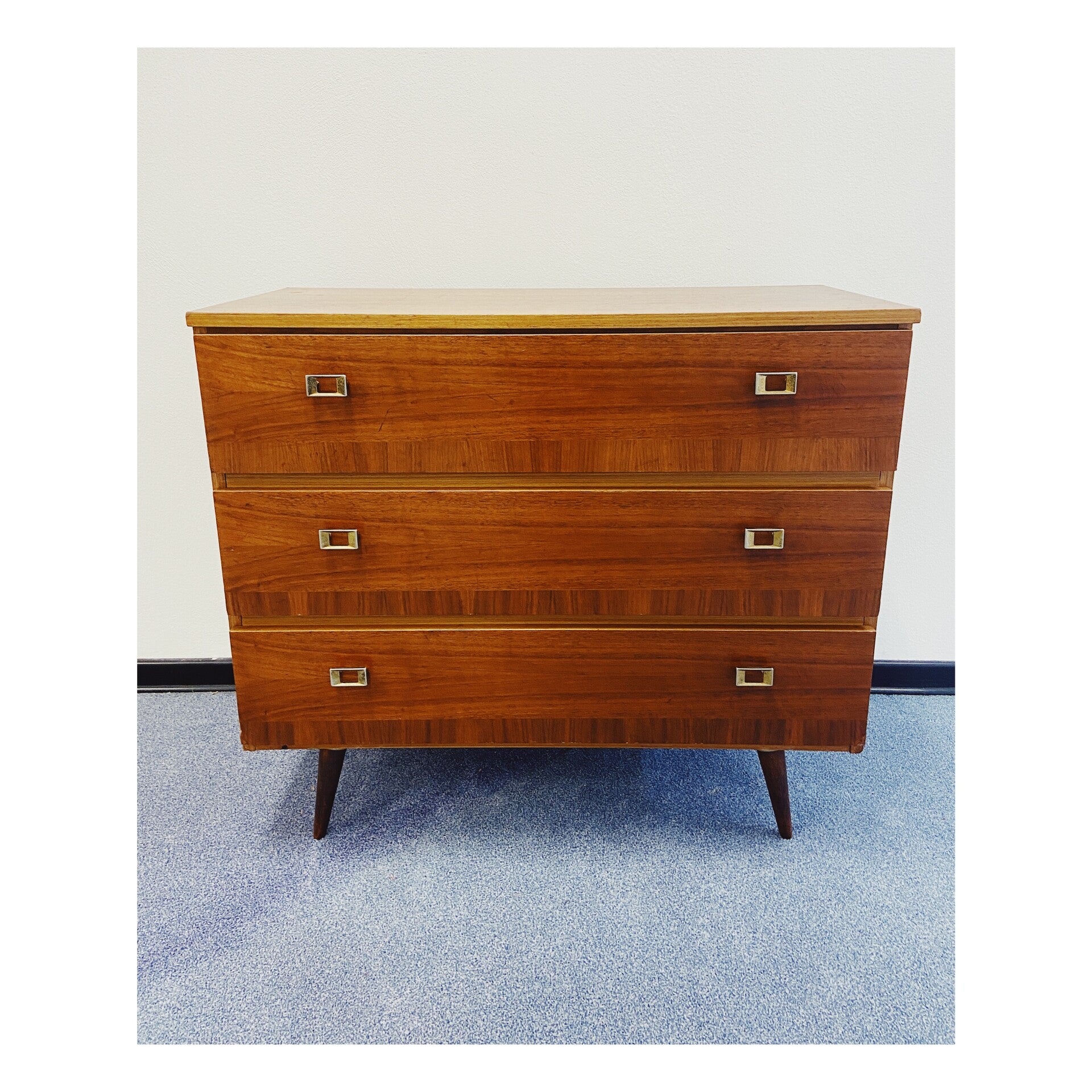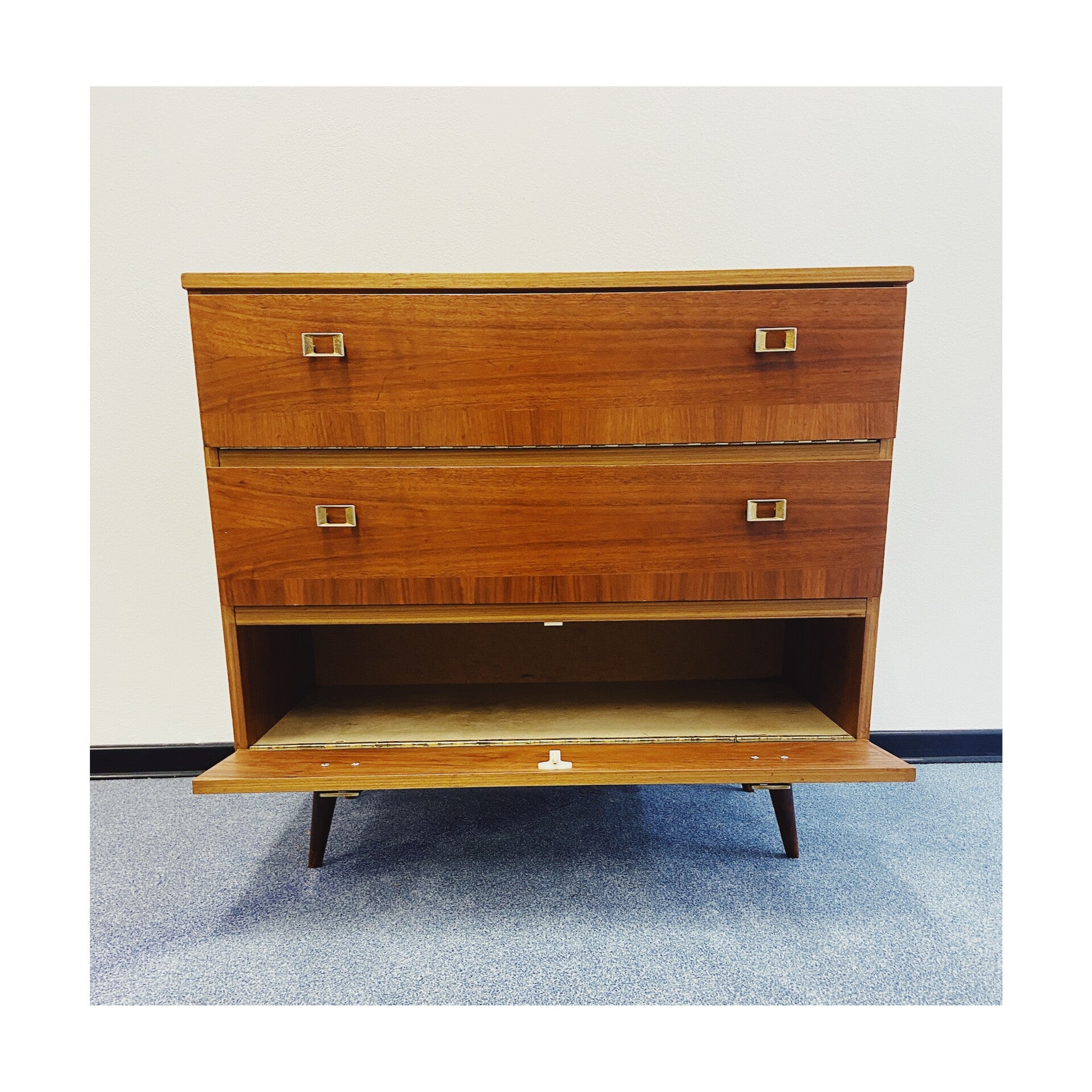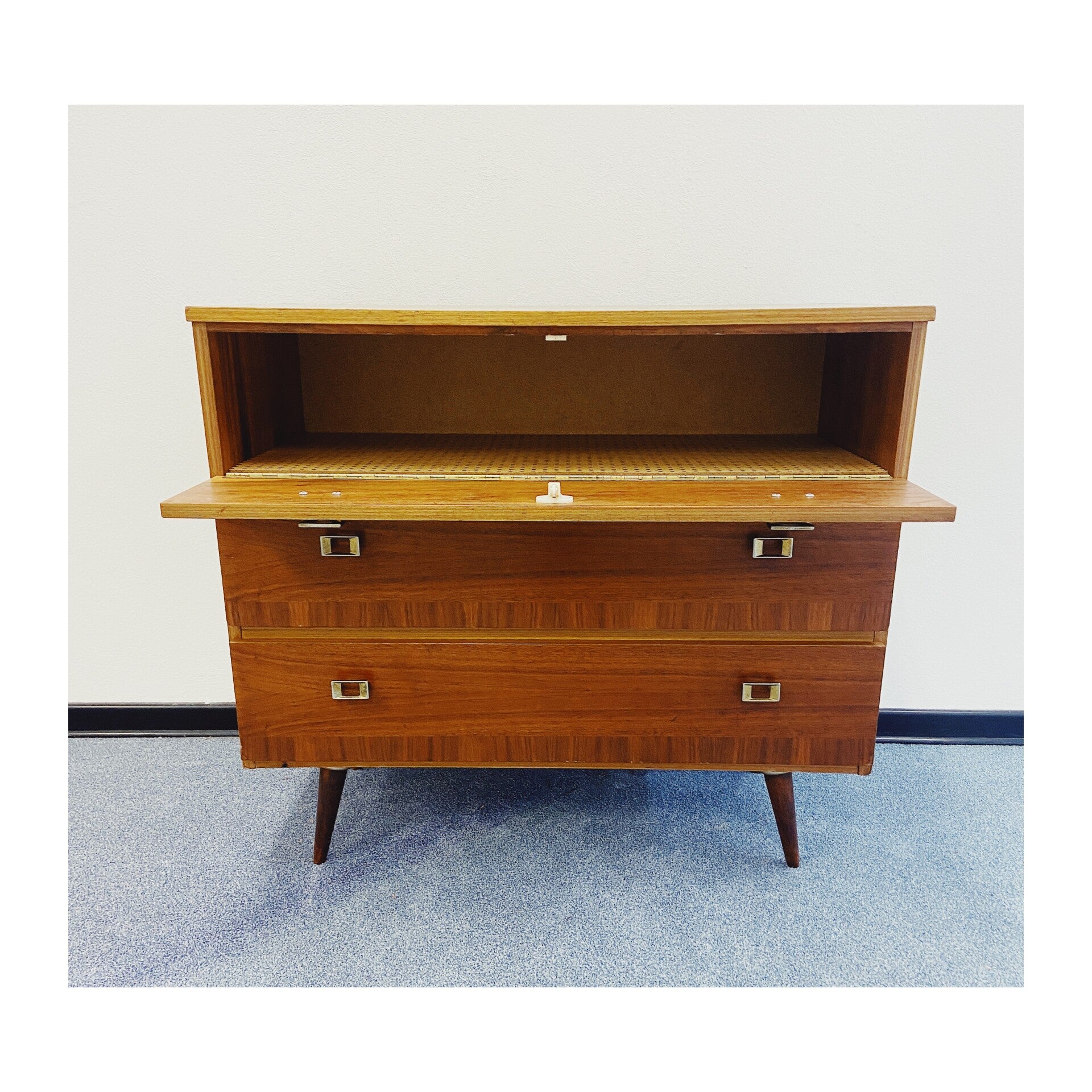 Retro klepkastje gemaakt van fineer. Dit kastje is het ideale vintage schoenenmeubel door zijn handige klepconstructie. Het kastje heeft een Scandinavisch design en heeft drie klepladen elk afgewerkt met messing grepen. De kast heeft wat gebruikssporen naar leeftijd, vooral te zien op het bovenblad, maar is verder in goede conditie!