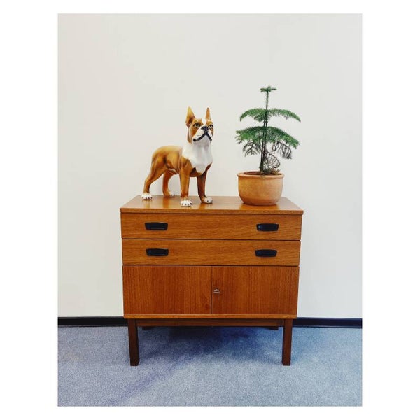 Vintage ladenkast. Dit compacte dressoir is ideaal voor de wat kleinere woningen die toch een uniek opbergmeubel willen. Het kastje heeft twee lades en een grote opbergruimte afgesloten door twee deurtjes met slot. Het meubel heeft zwarte handgrepen en staat op een strak vormgegeven onderstel. Naast wat kleine gebruikssporen is de kast in hele goede vintage conditie.