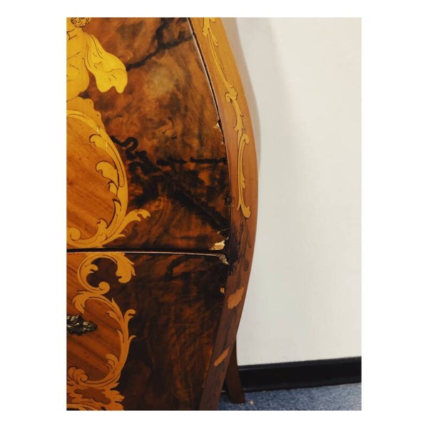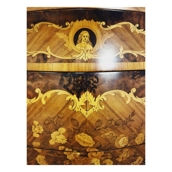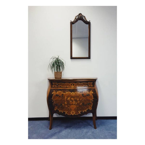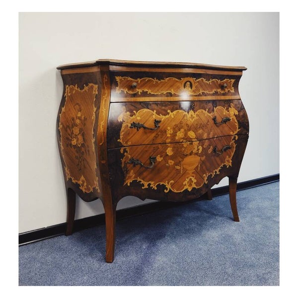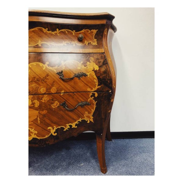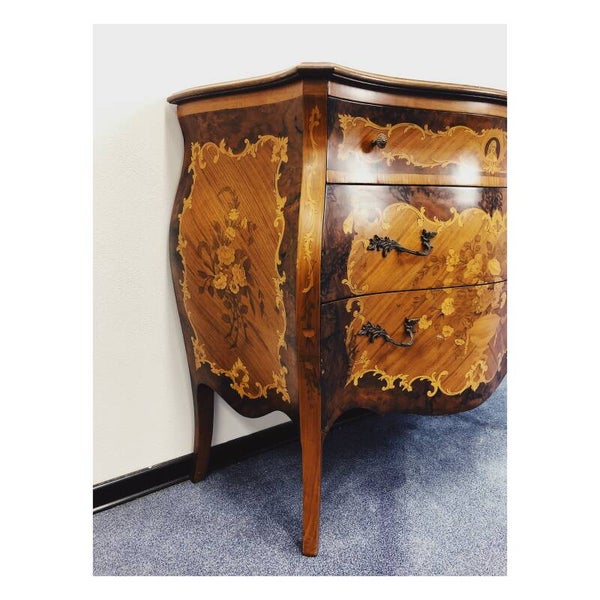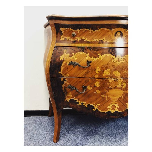 Unieke Louis XV commode met sierlijk inlegwerk. Het gebombeerde notenhouten kastje bezit drie opbergladen afgesloten door sierlijke handgrepen. De kast heeft wat kleine beschadigingen aan de zijkanten waar wat extra detail foto's van zijn gemaakt. Deze antieke Louis XV-stijl commode zal een chique touch aan je interieur geven. Prachtig voor in een hal met een mooie klassieke spiegel erboven.