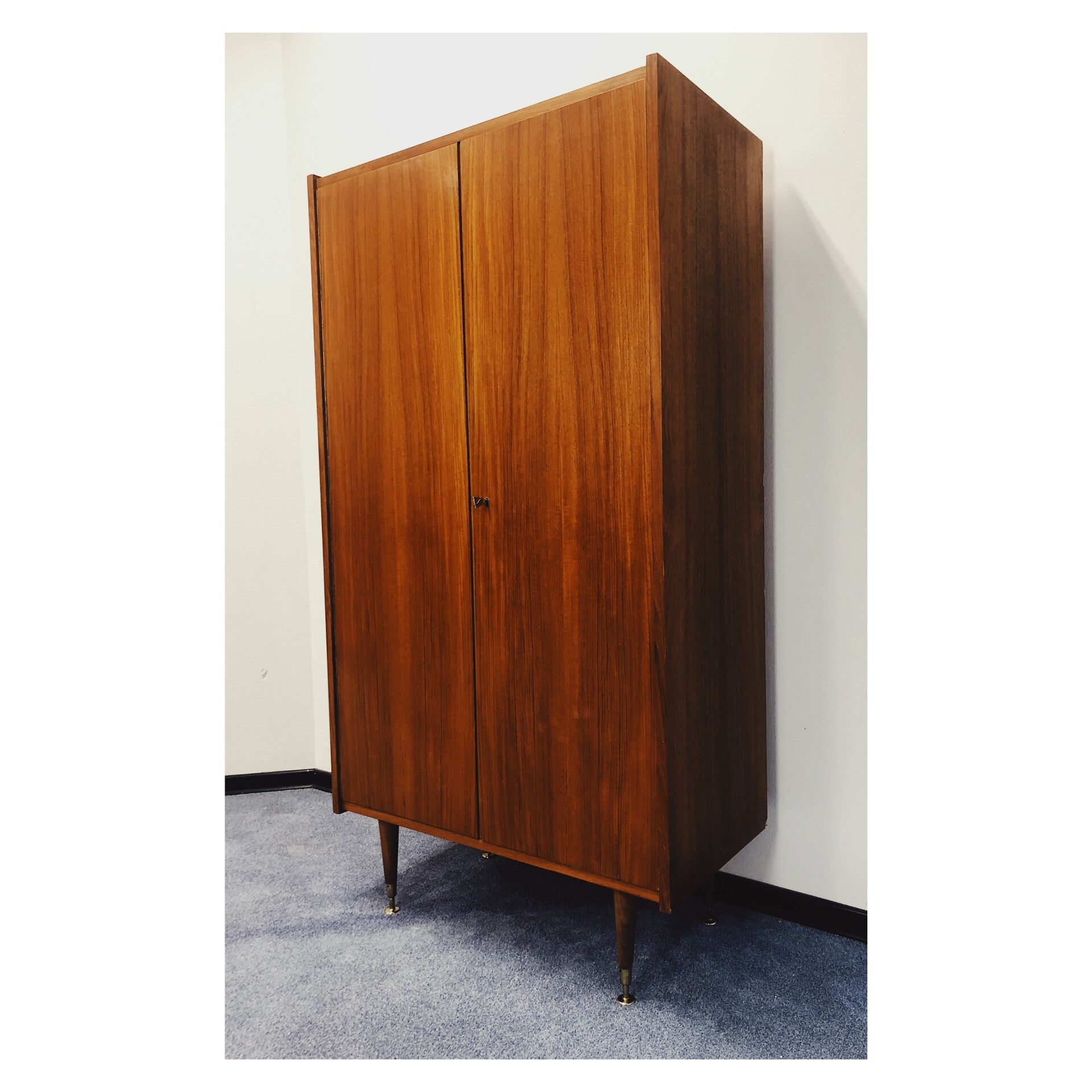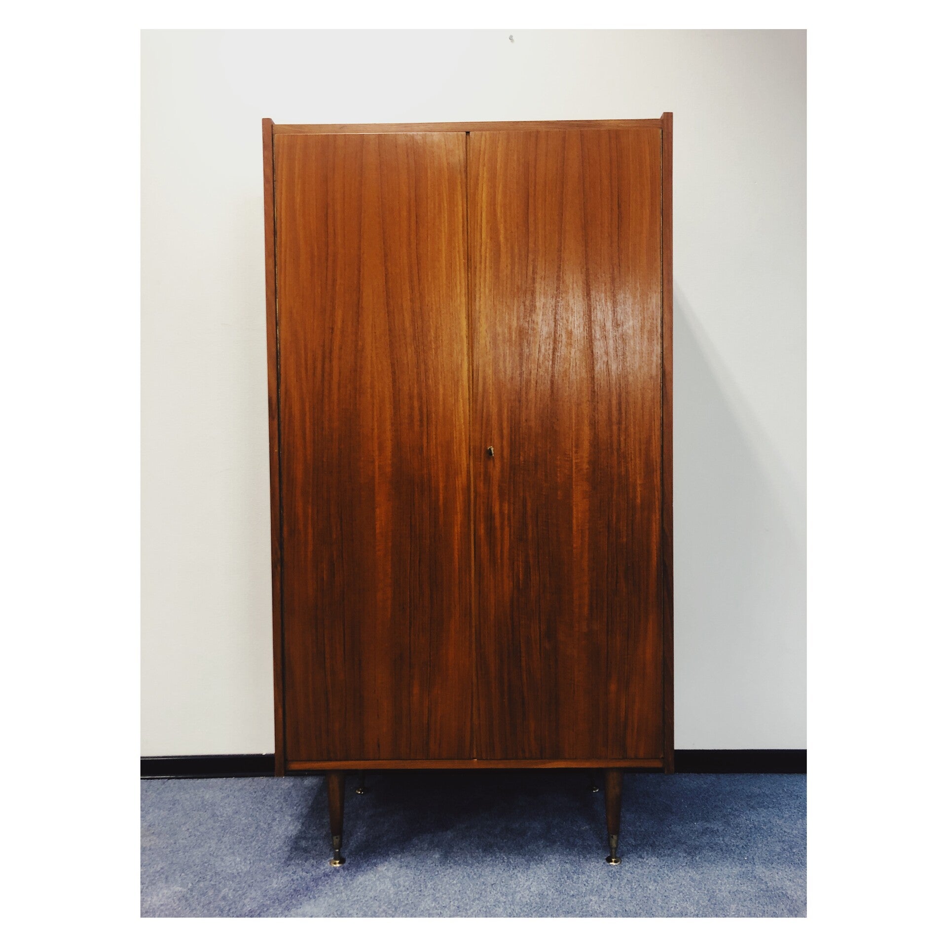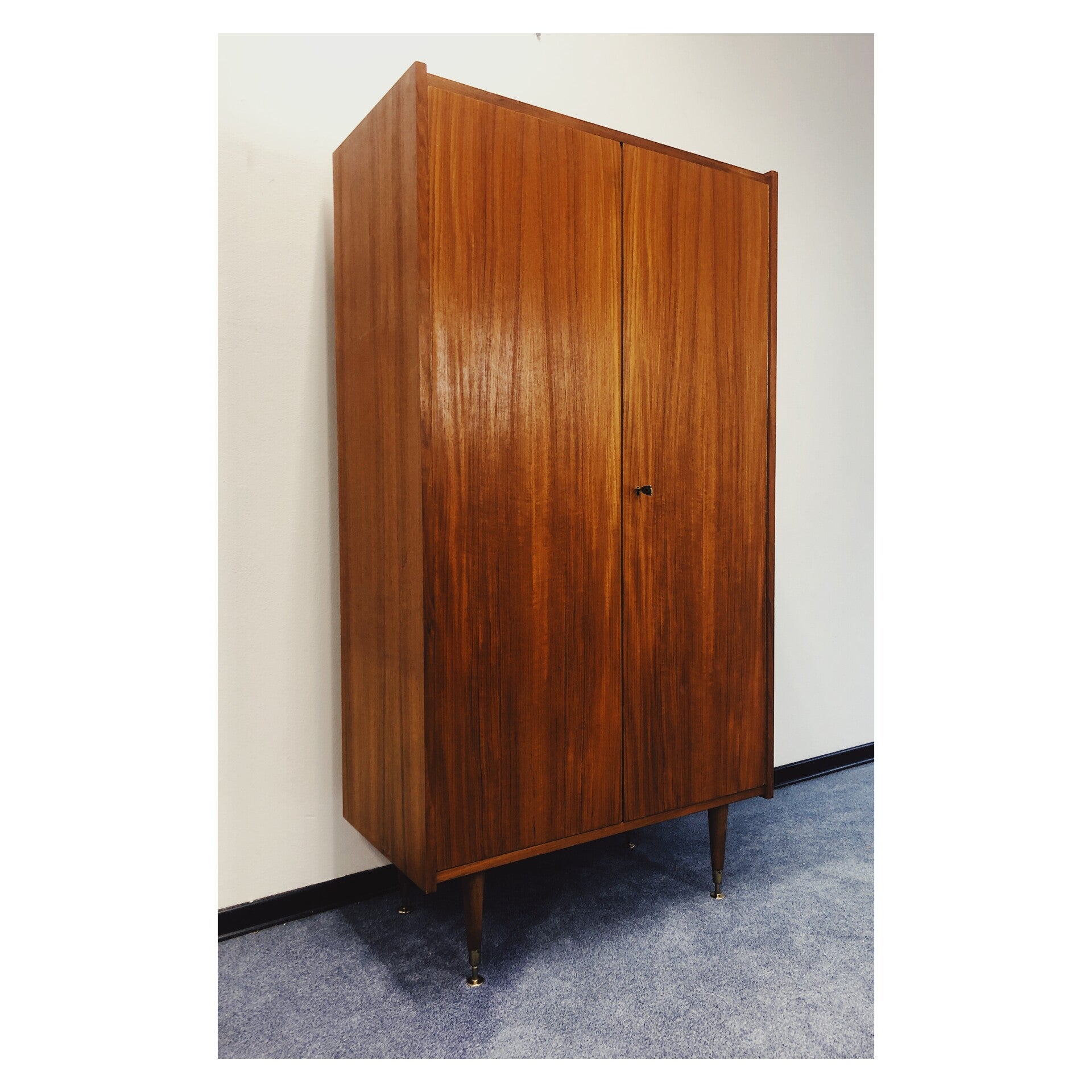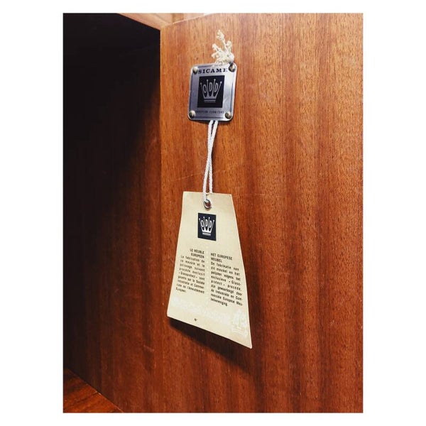 Vintage 60's kledingkast. De kast bezit een hanggedeelte aan de linkerzijde en heeft aan de rechterzijde vier opbergvakken met legplanken. De kast kan worden afgesloten met een bijbehorende sleutel en is gemaakt door de Belgische firma Sicame uit Ninoven. Sicame maakte van 1919 tot 2014 verscheidene meubels. De kast is in hele goede vintage conditie en kan doormiddel van zijn verstelbare pootjes ook in hoogte worden aangepast.