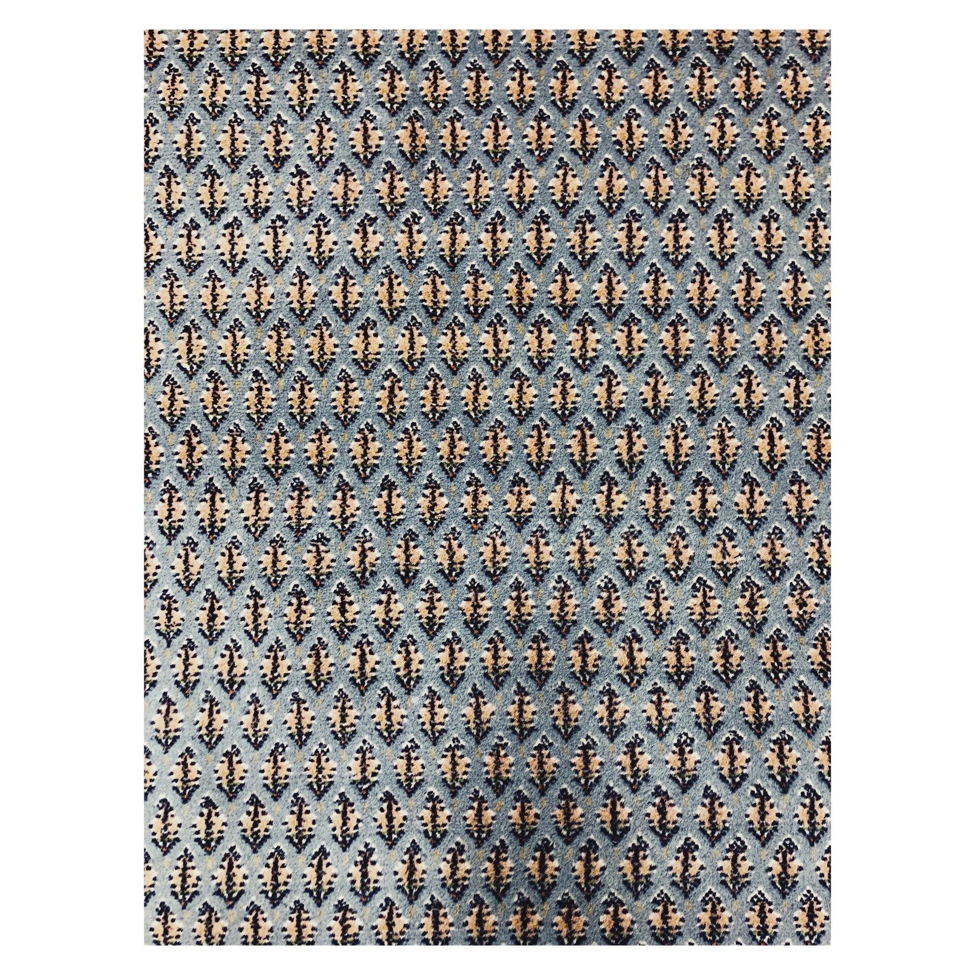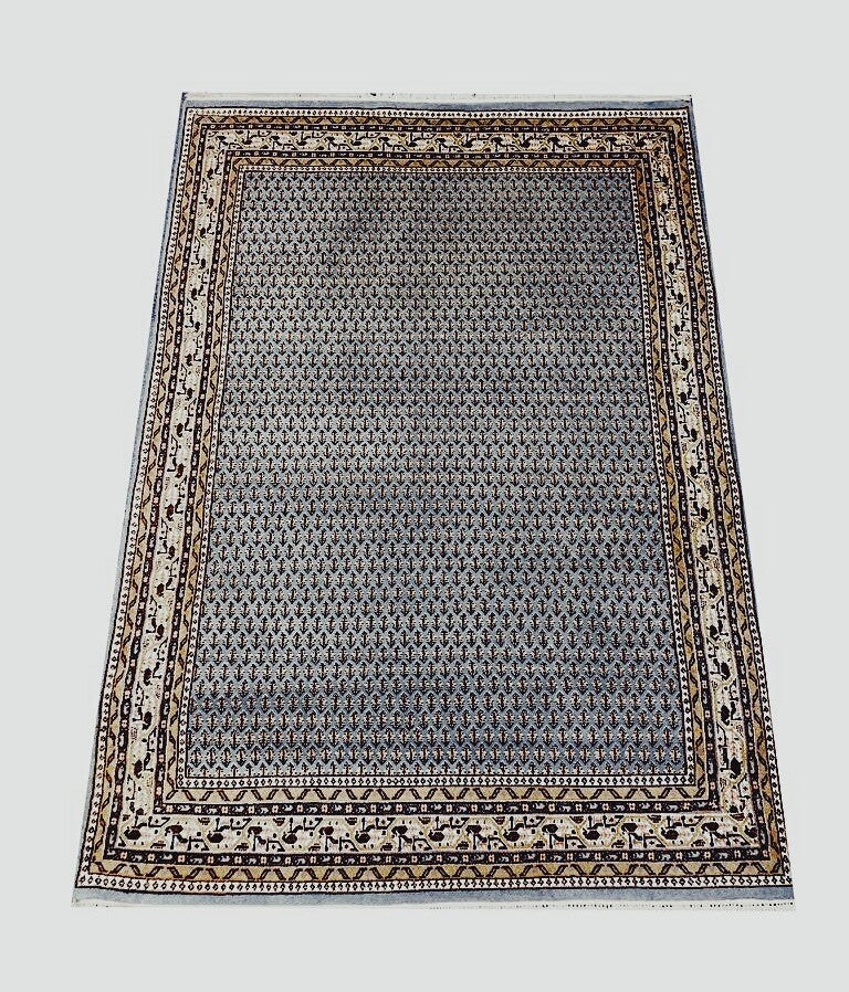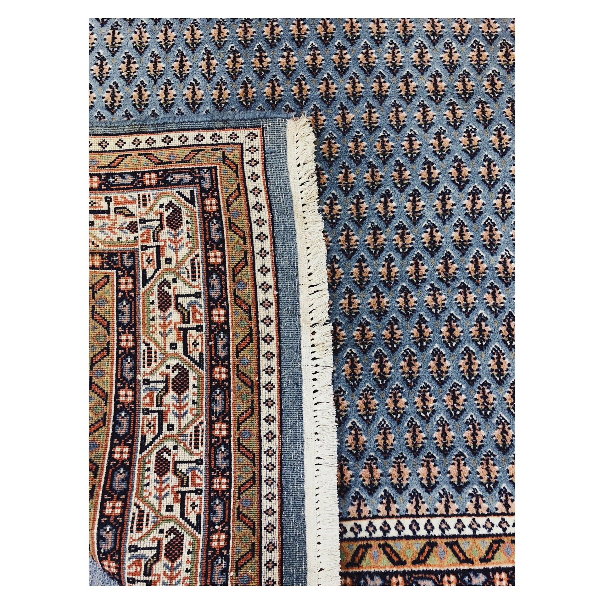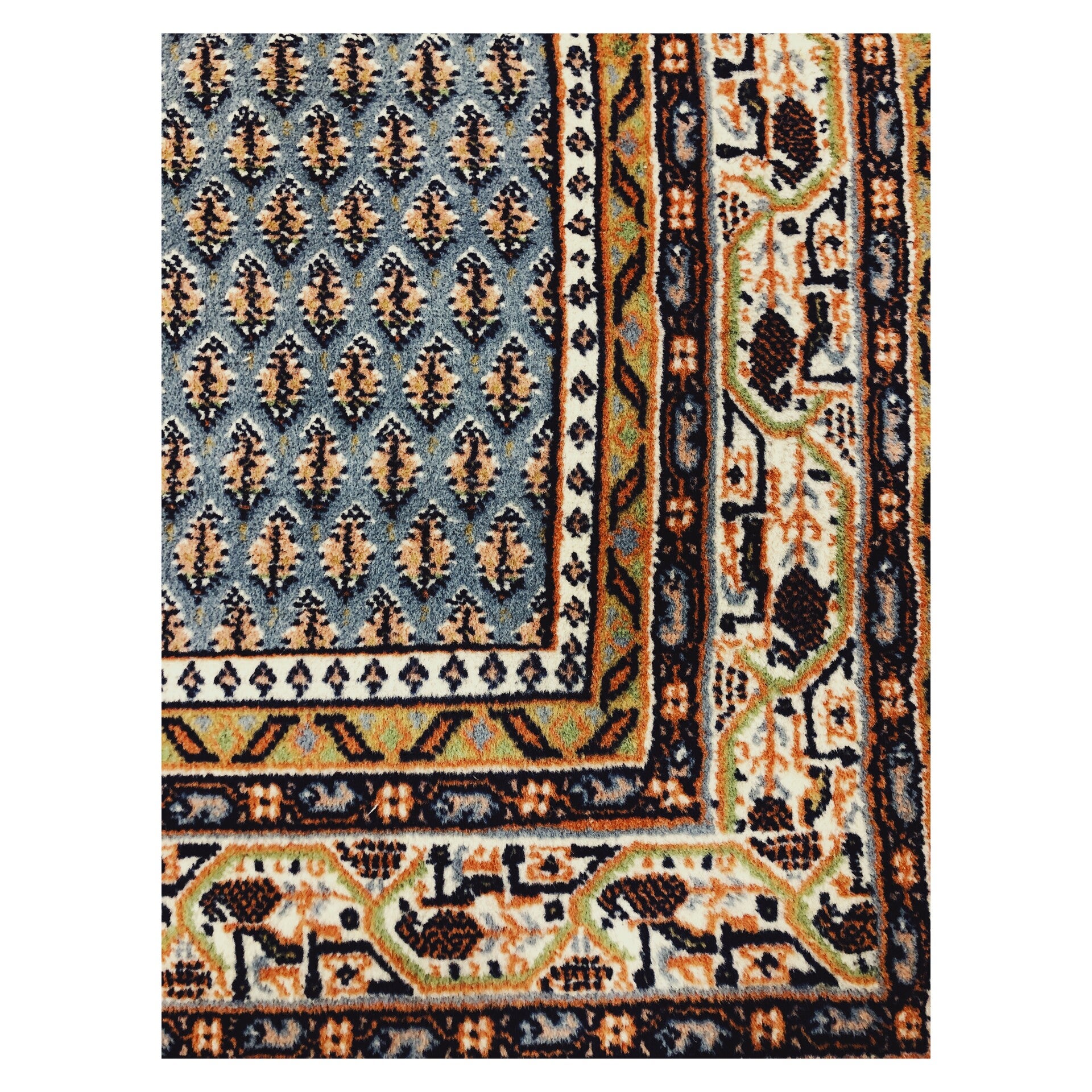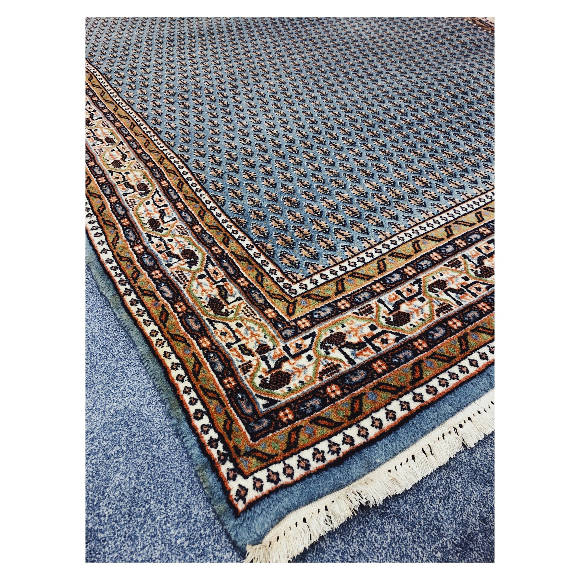 Prachtig groot Indiaas Mir kleed. Het rechthoekig tapijt heeft een heldere lichtblauwe achtergond en prachtige sierlijke details. Het kleed is handgeknoopt en valt onder de Indiaase tapijten. Een Mir tapijt is te herkennen aan de zogenoemde Boteh figuurtjes. Boteh is een Perzisch woord en betekent “een kluster bladeren”. Deze naam kan je koppelen aan het decoratief patroon op het tapijt. Indiaase mir tapijten zijn onderdeel van een eeuwenoude Indiase traditie. Het kleed is in hele goede conditie!