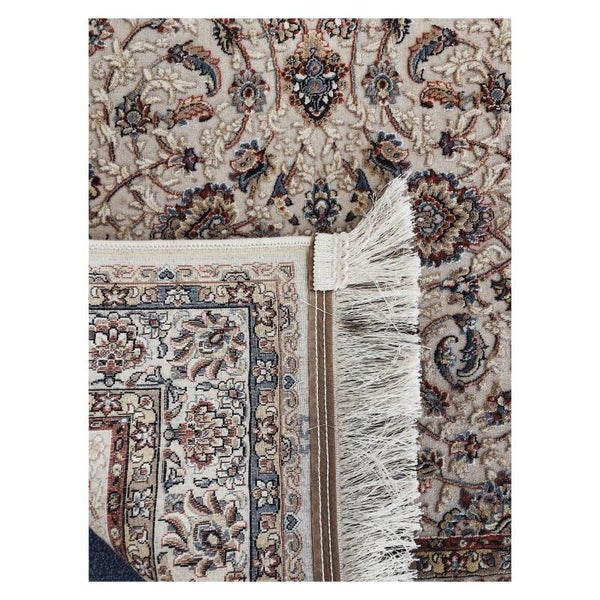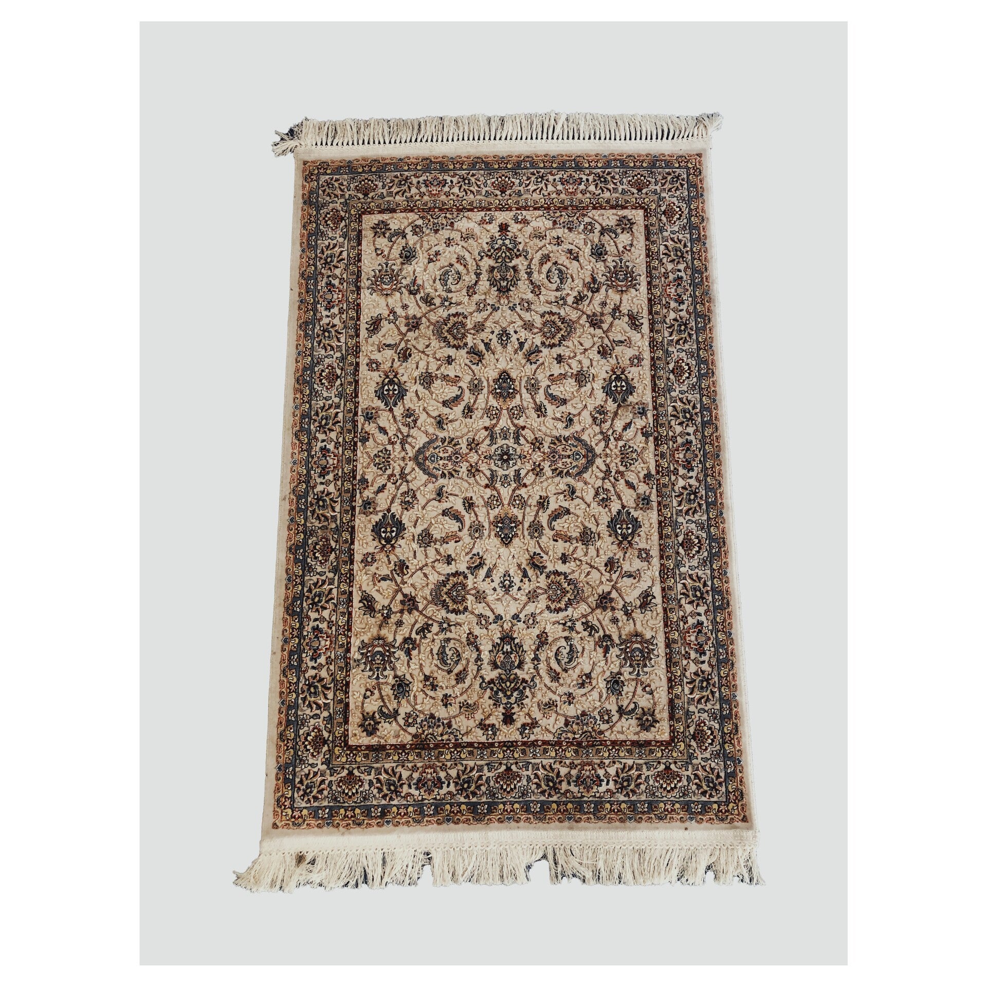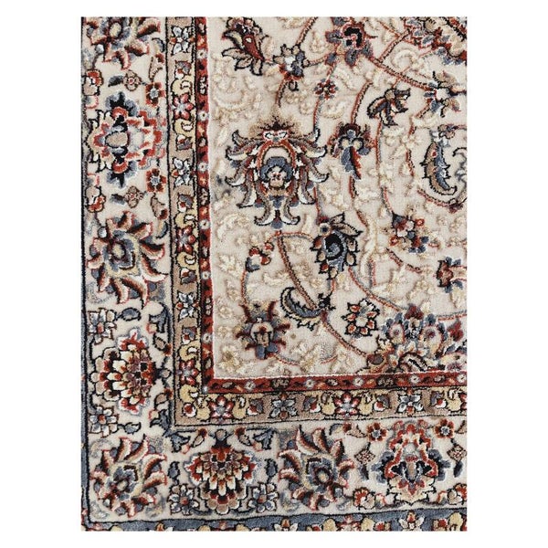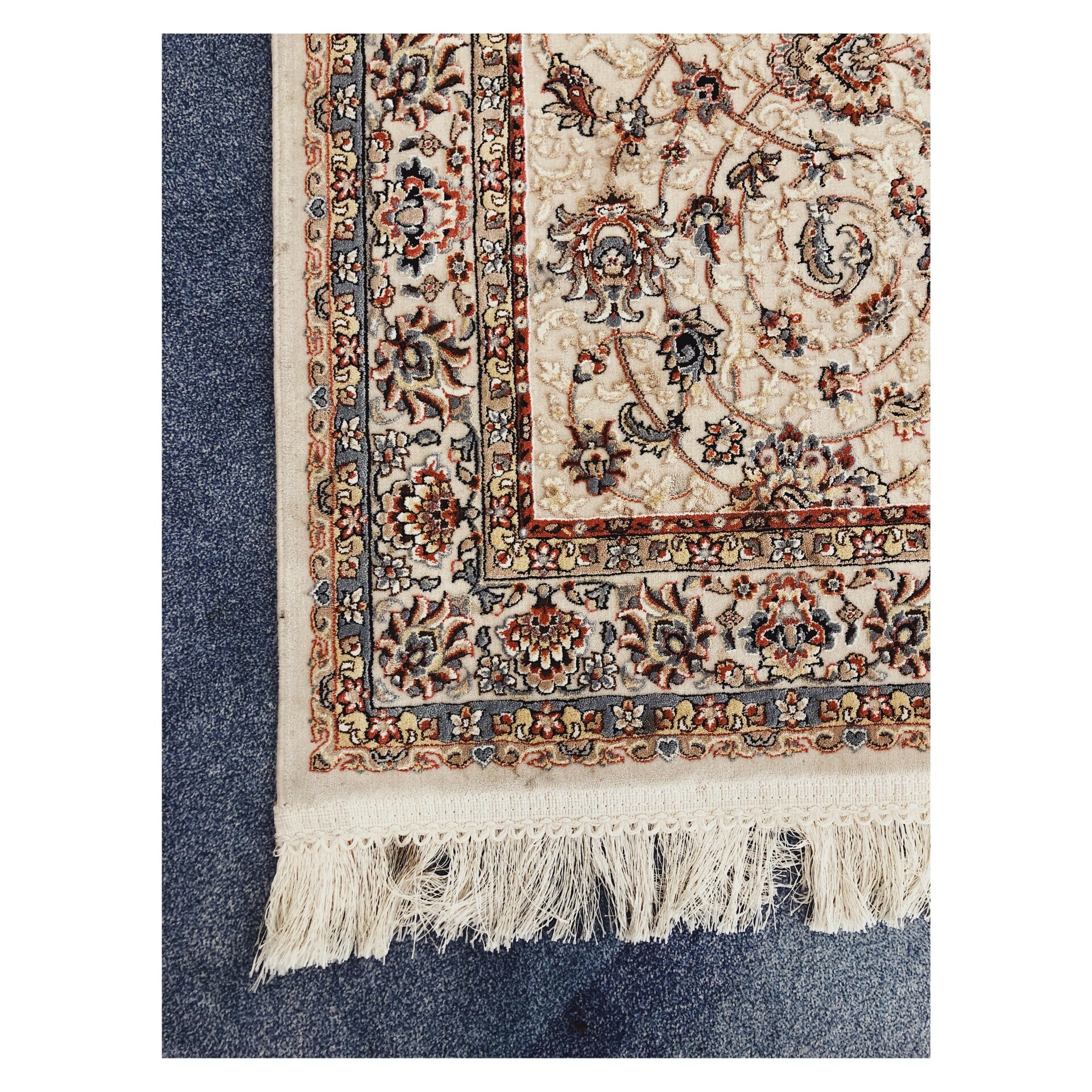 Sierlijk vloerkleed met prachtige bloemendecoraties. Het tapijt heeft een zacht beige achtergrond waar met subtiele kleuren een mooi bloemen reliëf op is bevestigd. Het kleed is machinaal geweven en duidelijk geinspireerd op de traditionele Perzische tapijten. De pool van het kleed is vervaardigd uit synthetische wol en heeft ook wat polyester accenten. Het tapijt past uitstekend in een zowel modern als klassiek interieur en is in uitstekende staat.
