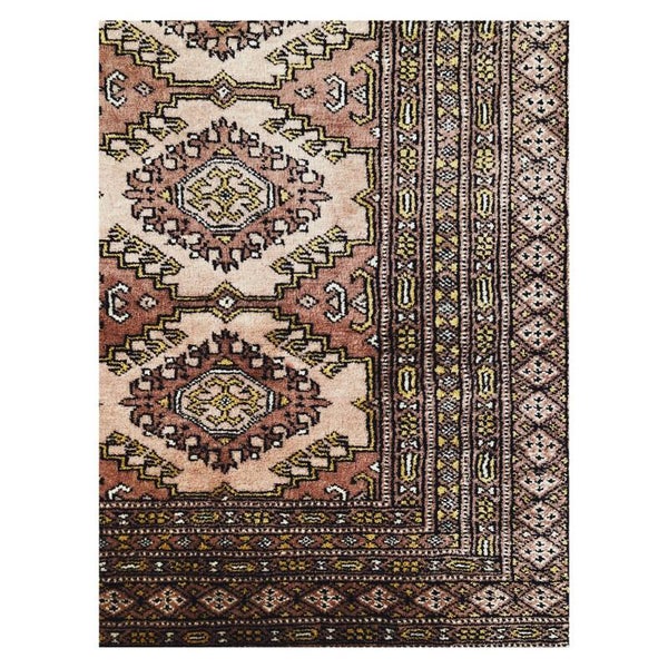 Prachtig handgeknoopt Pakistaans Bokhara tapijt. Dit prachtige kleed wordt geknoopt in een aantal werkplaatsen in het Kashmir gebied dat zich uitstrekt tussen Pakistan en India. Het tapijt wordt gemaakt met fijne wol en heeft een hoge knoopdichtheid wat het tapijt zeer duurzaam maakt. Het kleed heeft mooie goud, beige en bruine kleuren en heeft een uniek patroon. De kleuren van het tapijt zien er verschillend uit, afhankelijk van de hoek waar het tapijt vandaan wordt bekeken. Het tapijt is in goede vintage conditie.