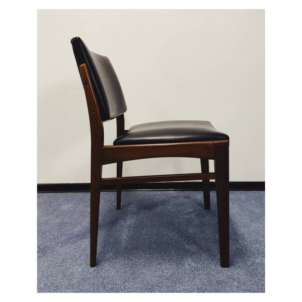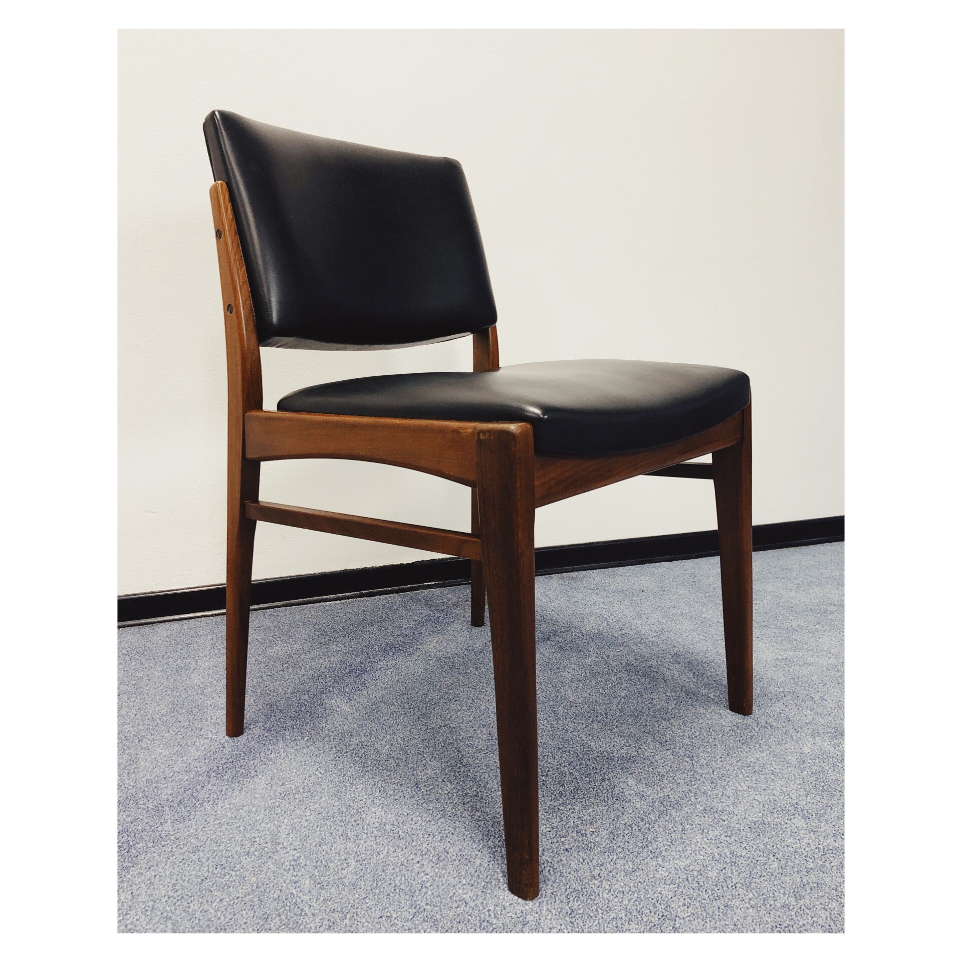 Mooie teak houten stoel met zwarte skai bekleding! De stoel heeft het typische strakke Scandinavische design! Los van wat standaard slijtageplekjes in het skai is de stoel in erg goede staat!