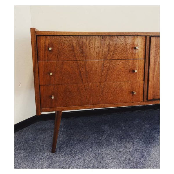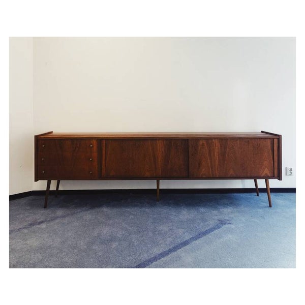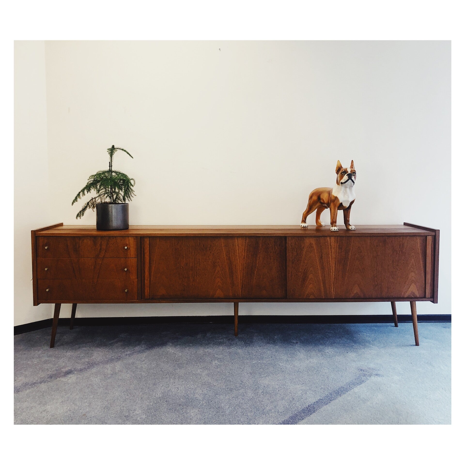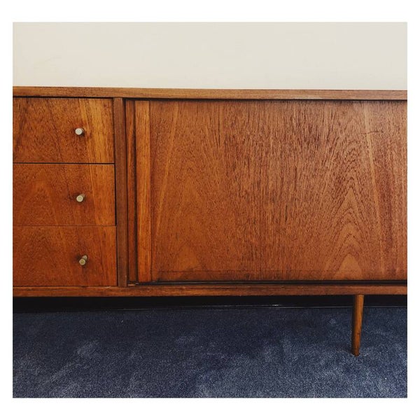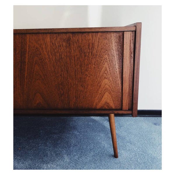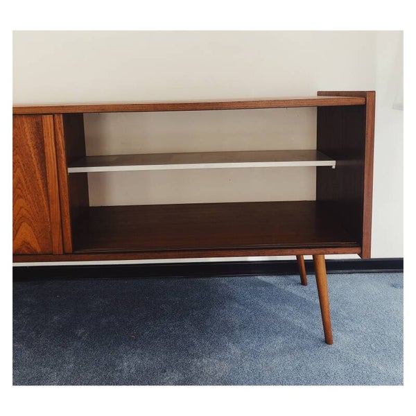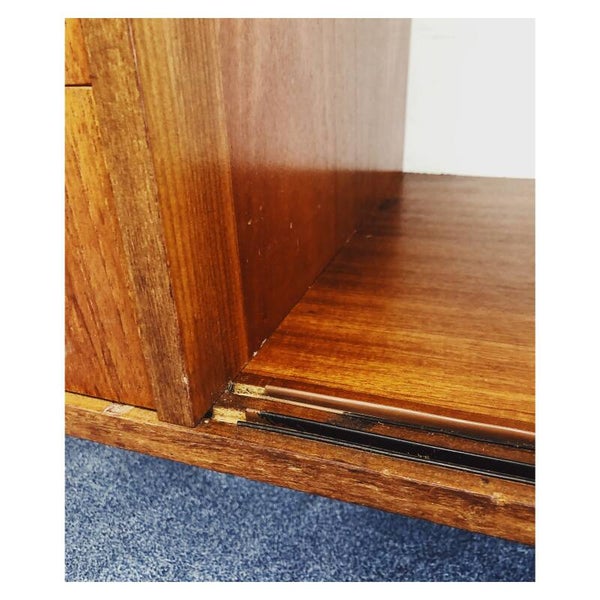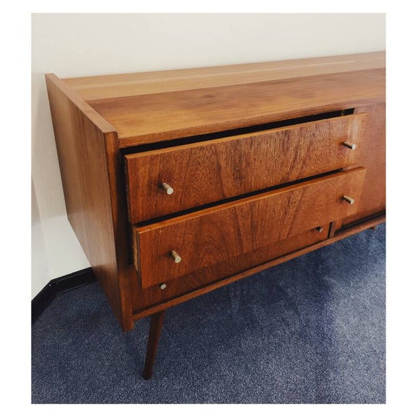 Vintage sideboard met twee schuifdeuren en drie ruime laden. Het vintage dressoir is vervaardigd van donker teak fineer en het geheel staat op mooie schuine uiteenlopende pootjes. De drie laden worden afgewerkt met zilveren messing knopjes en de schuifdeuren hebben een mooi houten hand-schuif systeem. Het bovenblad heeft voor de helft een lichtere hout kleur doordat er (waarschijnlijk) een opstand heeft opgestaan. De kast is in goed vintage conditie met hier en daar wat lichte gebruikssporen en wat verkleuringen op het bovenblad.