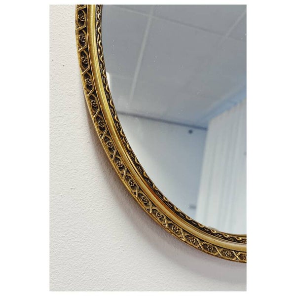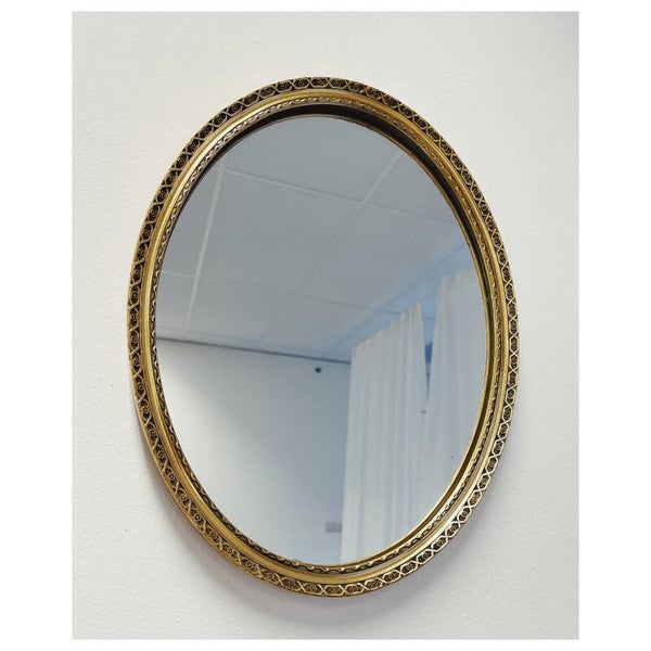 Kleine ovale spiegel met gouden lijst. Aan de achterzijde bevindt zich een handig ophangsysteem. De spiegel heeft een paar kleine plekjes op het glas maar is verder in goede vintage staat.Afmetingen Lengte: 43cmBreedte: 33cm