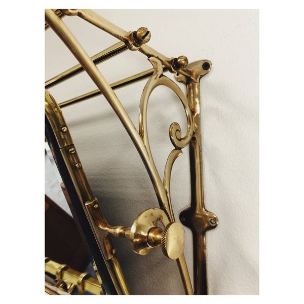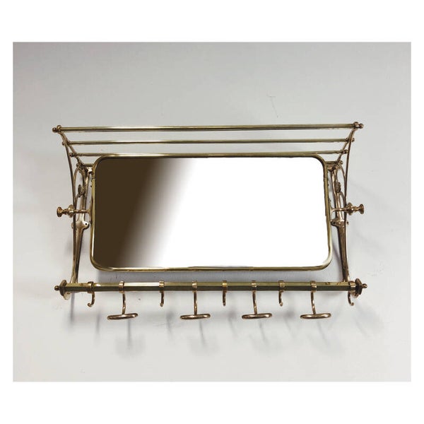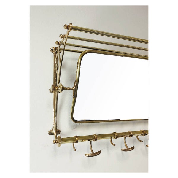 Klassieke wandkapstok uitgevoerd in goud messing. De kapstok is voorzien van een brede hoedenplank, een verstelbare spiegel, vier grote haken en vijf kleine. De haken kunnen naar wens verschoven worden en bieden genoeg hang mogelijkheid. De kapstok dient stevig in een muur gemonteerd te worden. De spiegel is gezien de leeftijd in hele goede conditie.