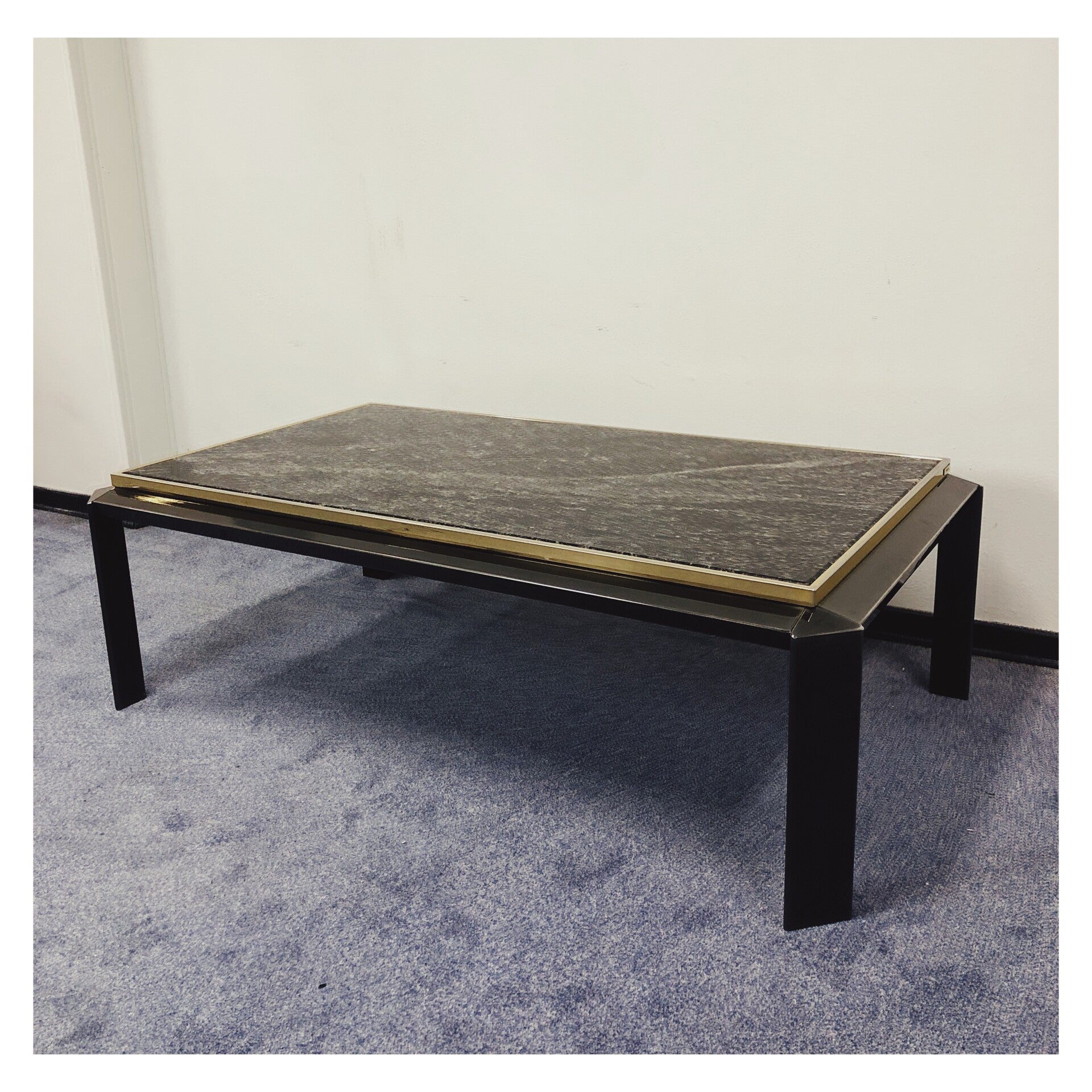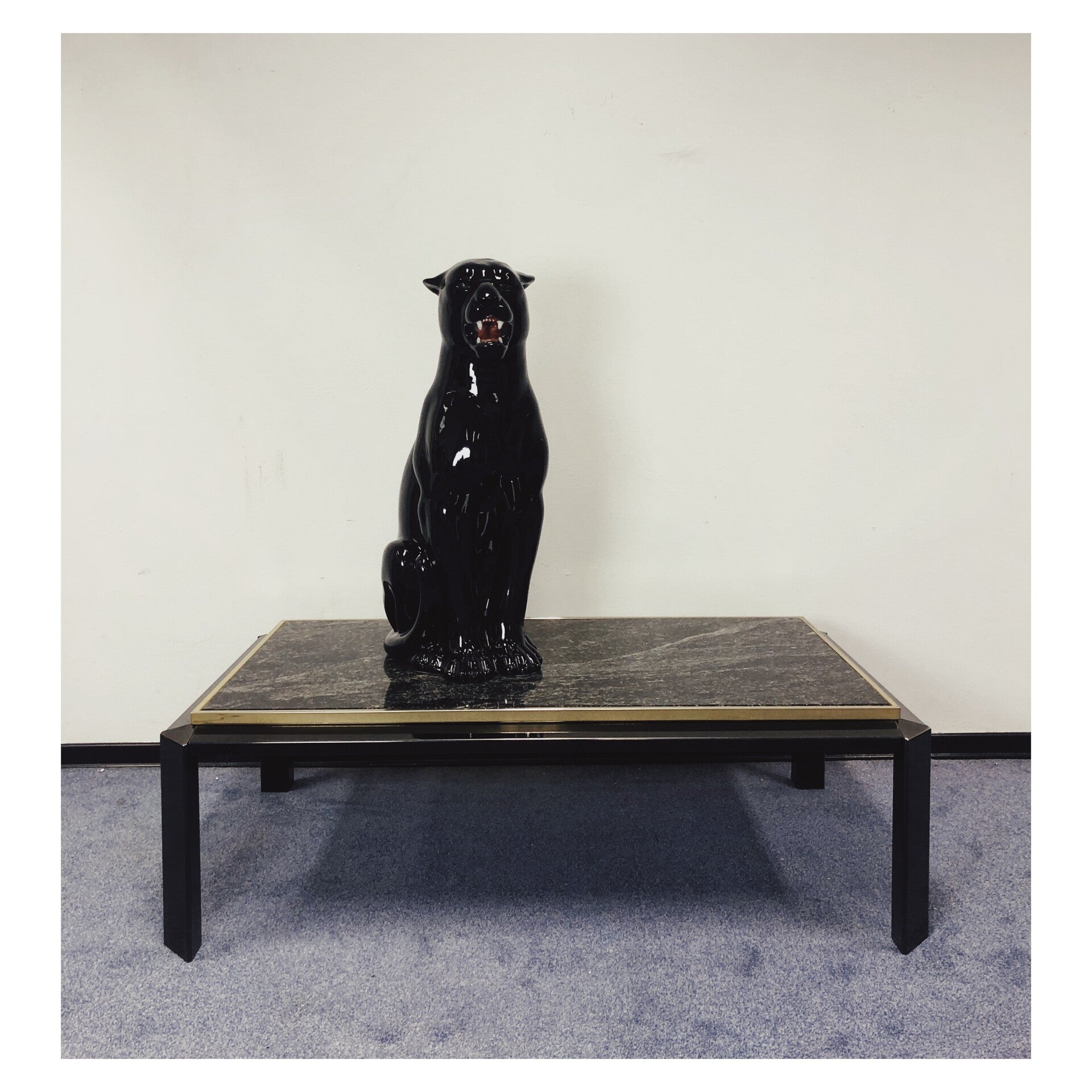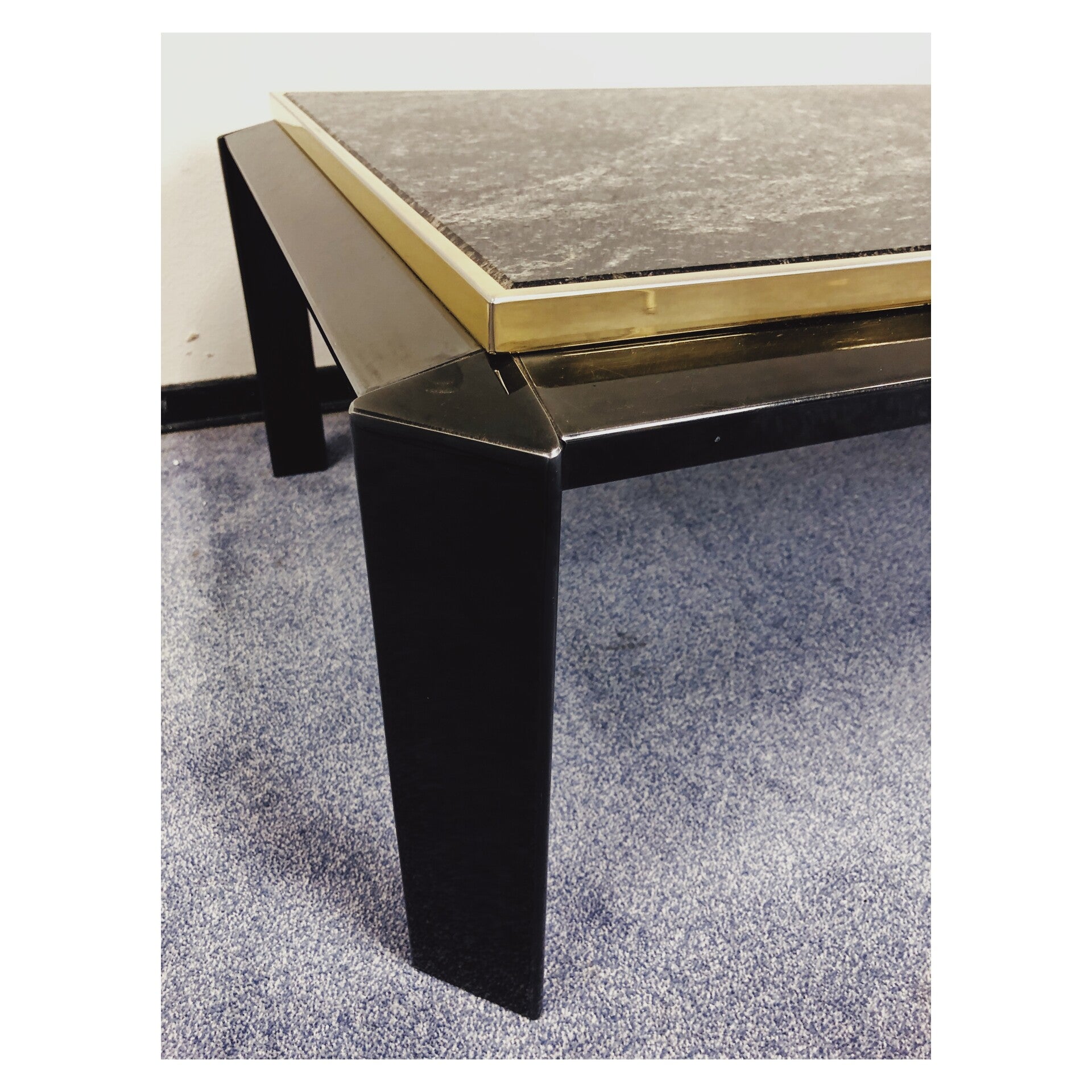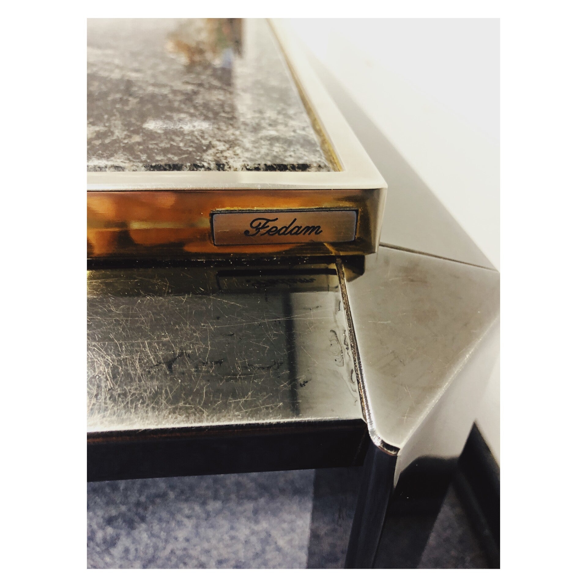 Design salontafel geproduceerd door Fedam. Het onderstel van de tafel is gemaakt van zwart glas, en het verhoogde bovenblad bestaat uit prachtig zwart marmer. Daarnaast heeft de tafel een rand van brons chroom rondom het marmer, wat kenmerkend is voor tafels geproduceerd door Fedam! Los van wat krasjes in het zwarte glas is de tafel in hele goede conditie!