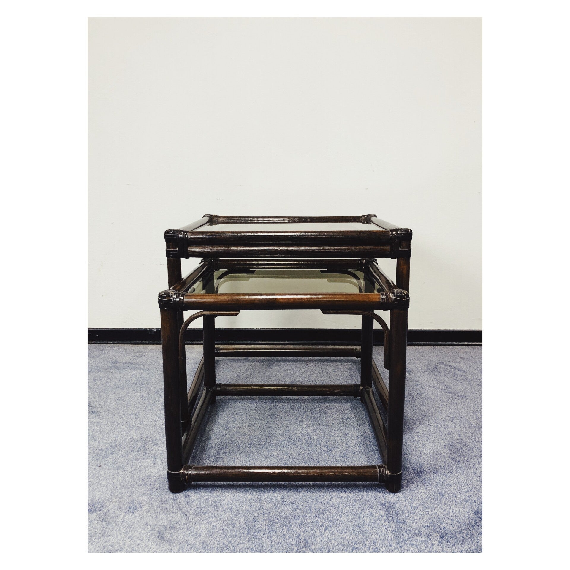 Deze leuke rotan bijzettafeltjes zijn weer helemaal hip in het interieur! De tafeltjes zijn voorzien van een glazen blad. Door de natuurlijke uitstraling en het lichte gewicht zijn de meubels makkelijk te combineren in je interieur. De tafeltjes hebben beide enkele krasjes in het glas, passend bij de leeftijd!