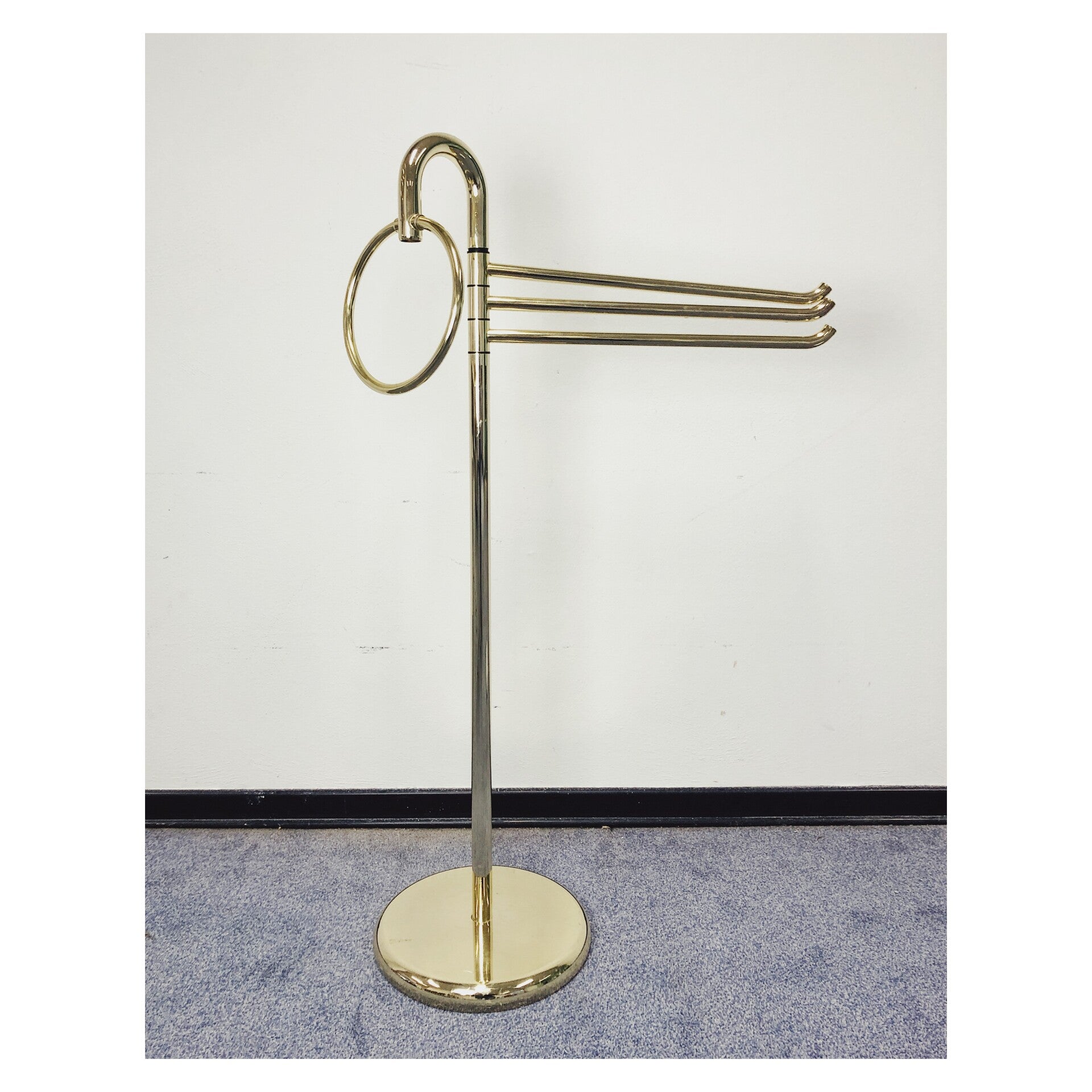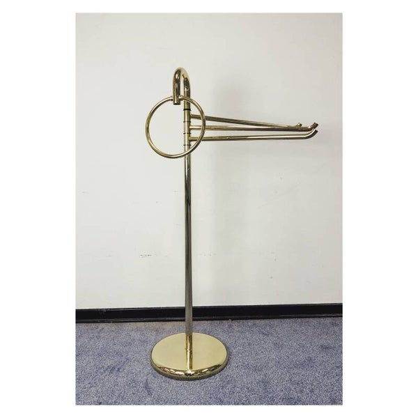 Handdoek standaard gemaakt van glanzend goud messing! Doordat alle elementen van de standaard beweegbaar zijn, kan het op verschillende manieren worden neergezet. Zowel de drie handdoekhouders als de handdoekring kunnen naar eigen wens gedraaid worden! De standaard is in uitstekende staat en is een super gaaf object voor in huis!