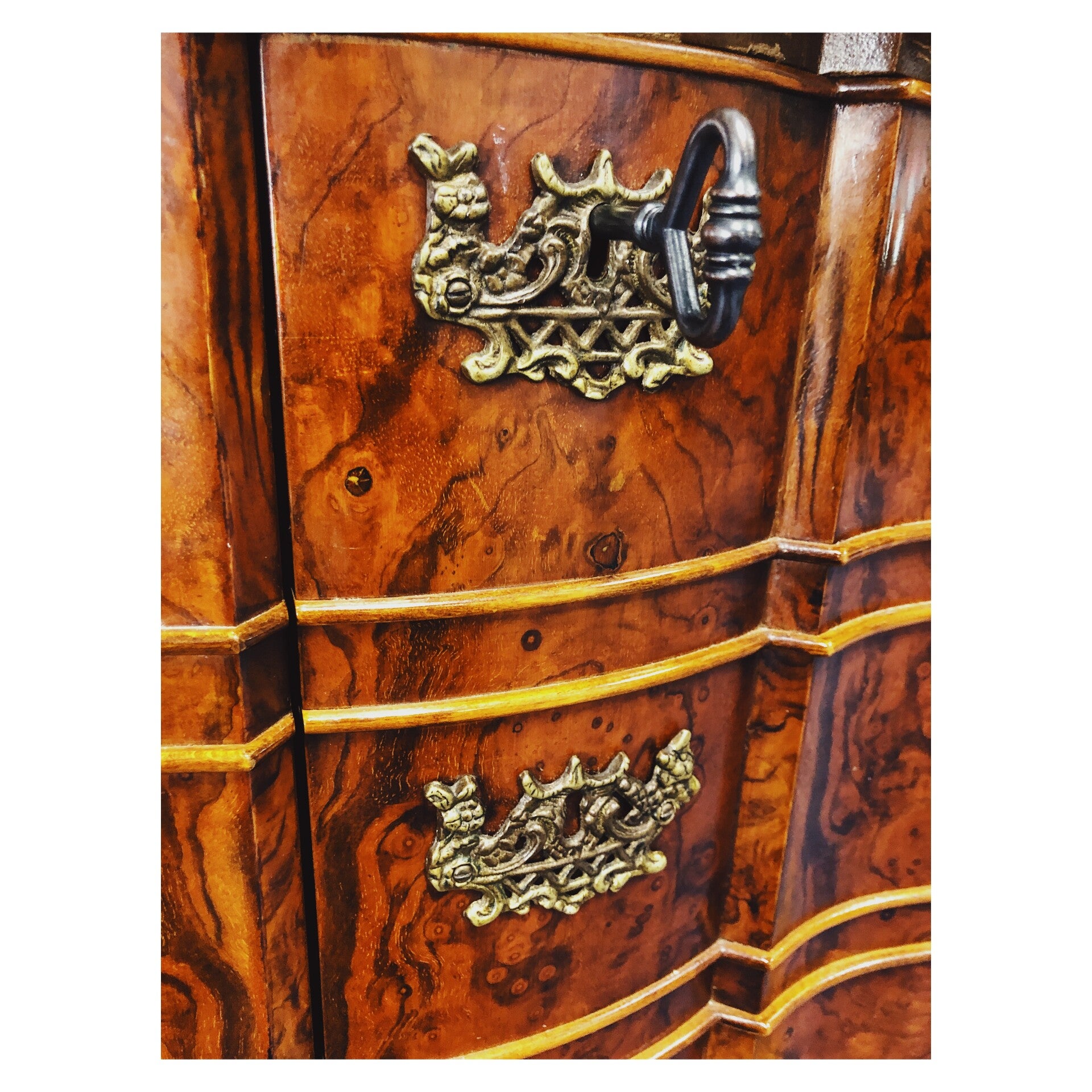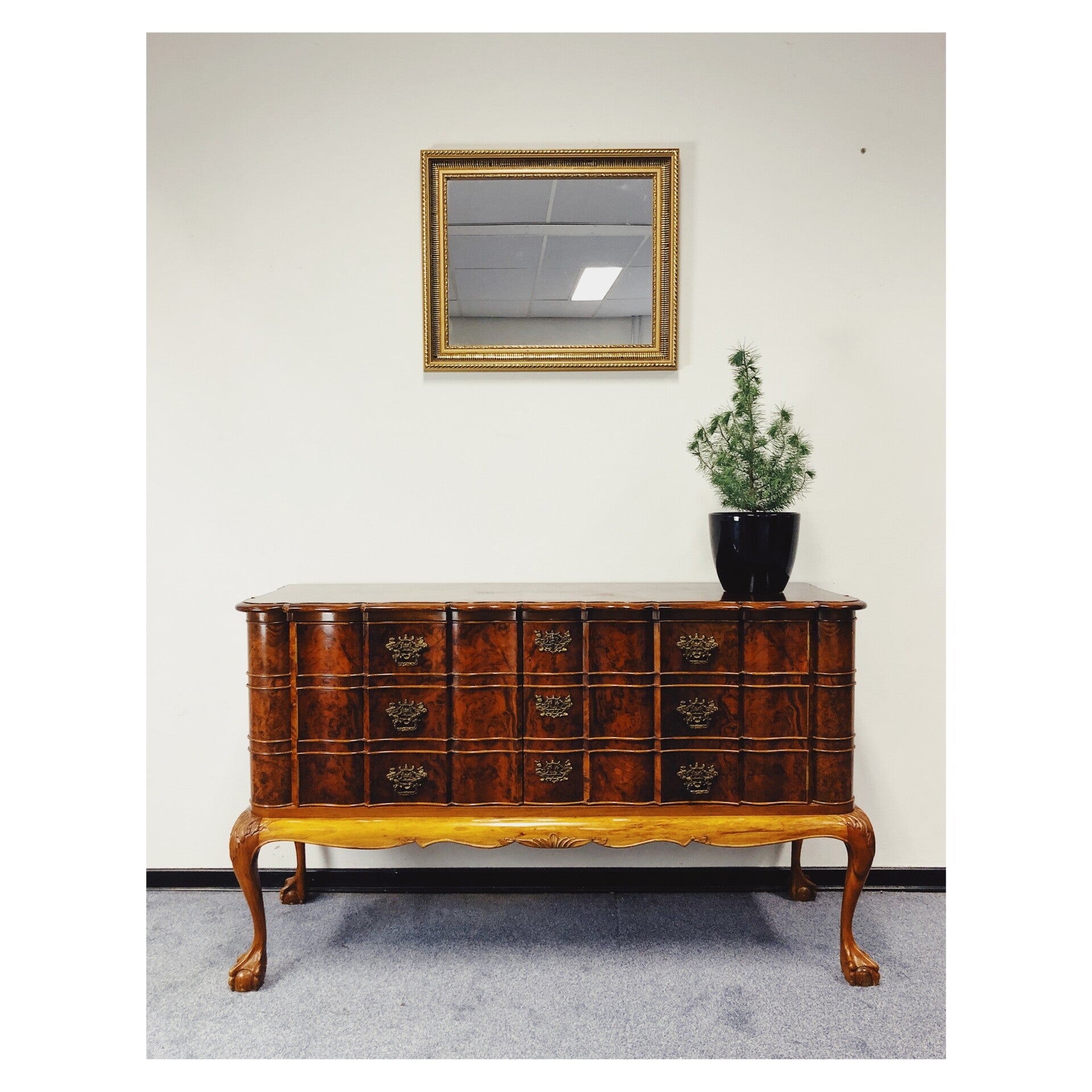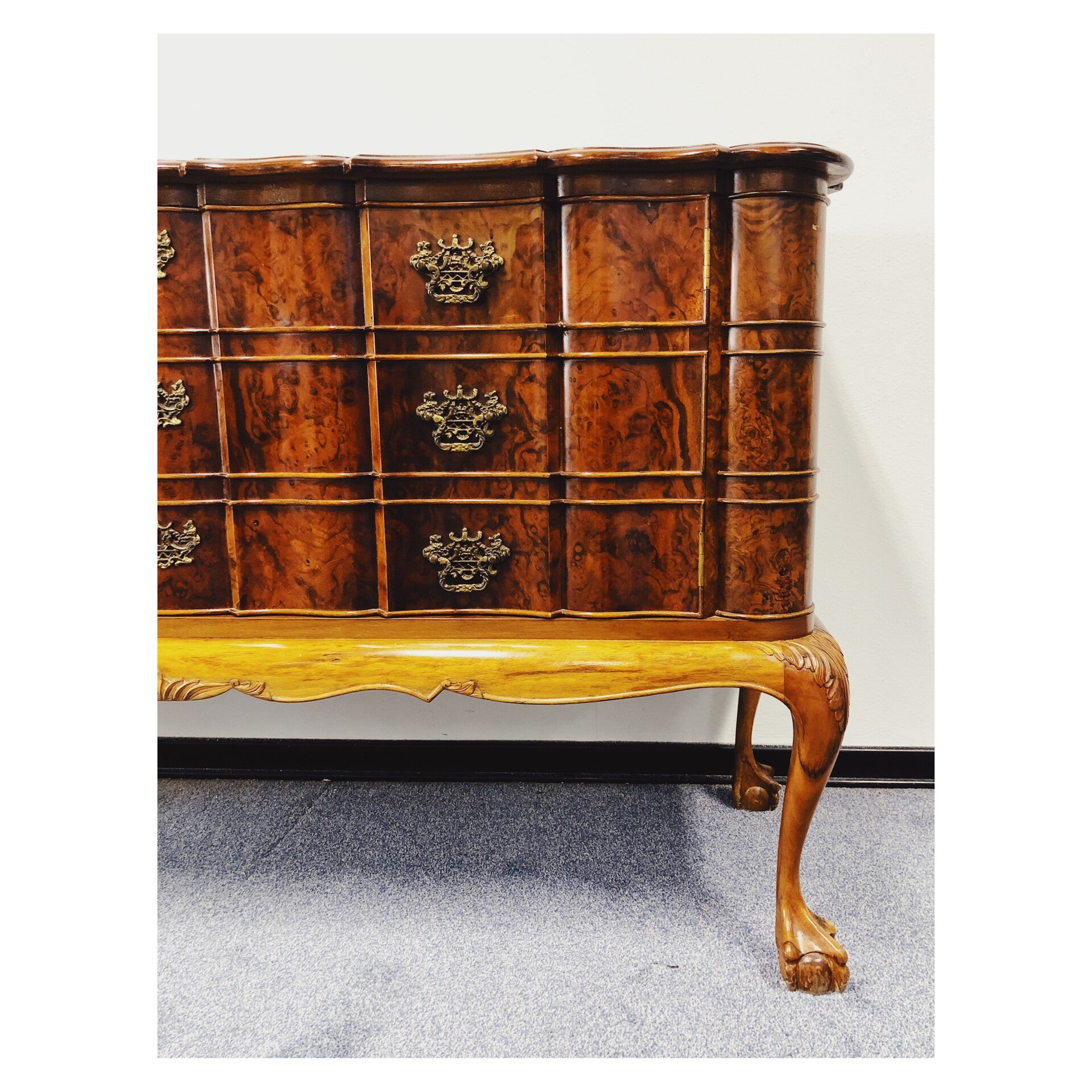 Chippendale dressoir in prachtige staat! De kast is gemaakt van wortelnoten hout en heeft bijzondere gebogen vormen in het hout. De kast heeft twee deuren waarvan de rechter open gaat door middel van een sleutel. Aan de binnenkant van de kast bevind zich een ruime plank voor het scheiden van spullen. De kast heeft erg veel mooie details, waaronder de sierlijk gekrulde poten.