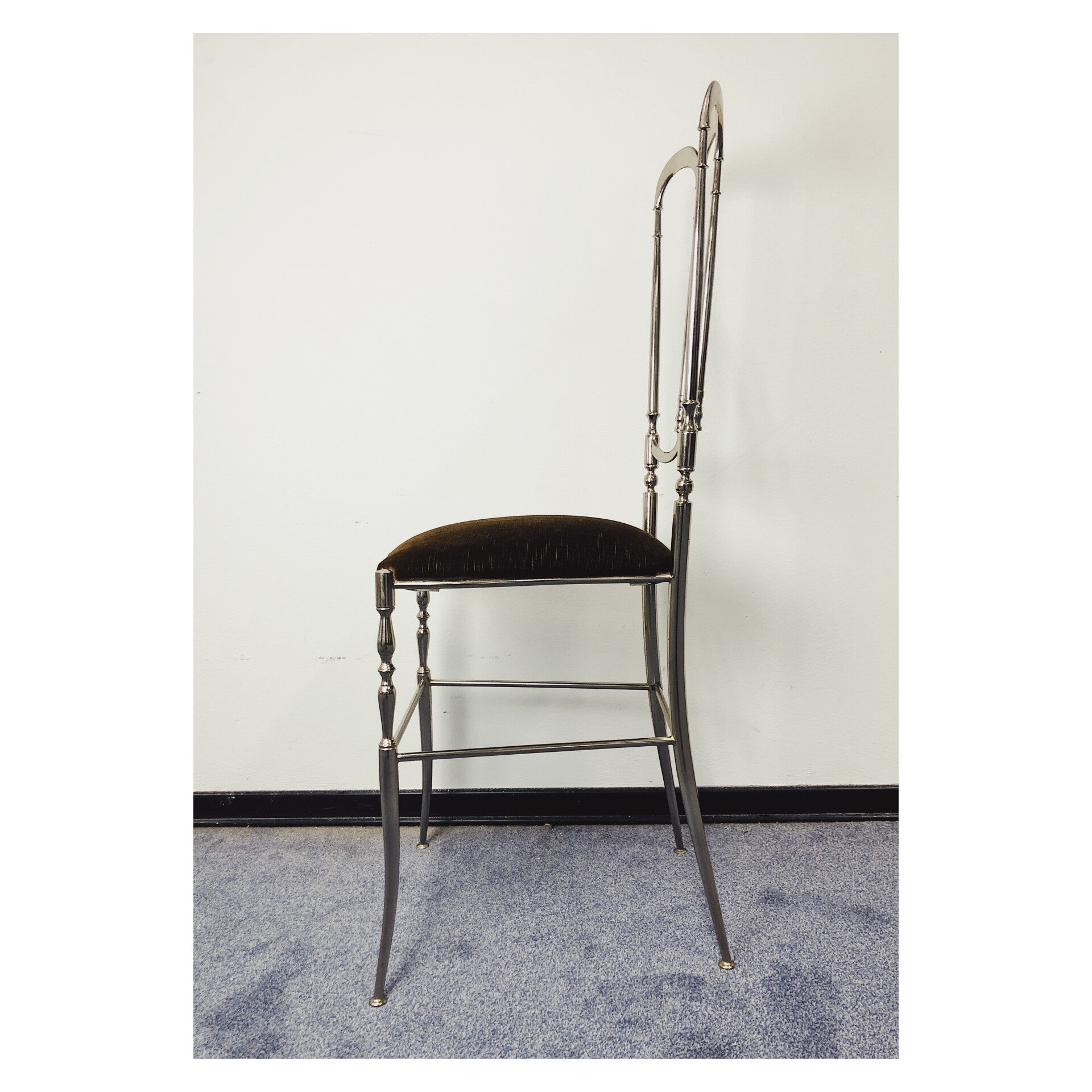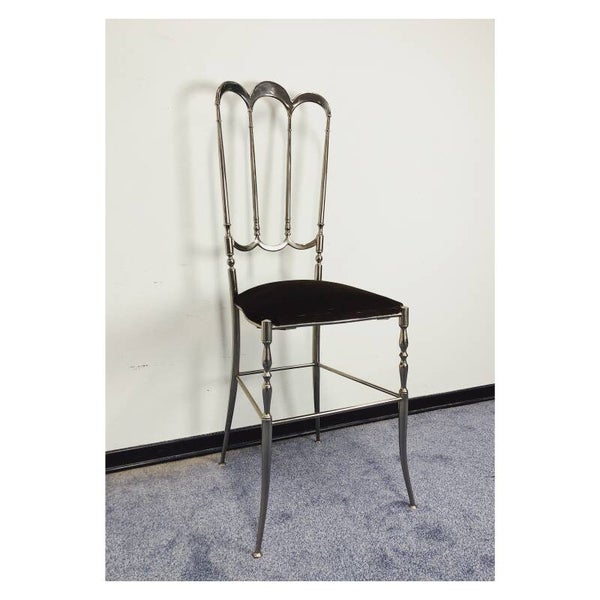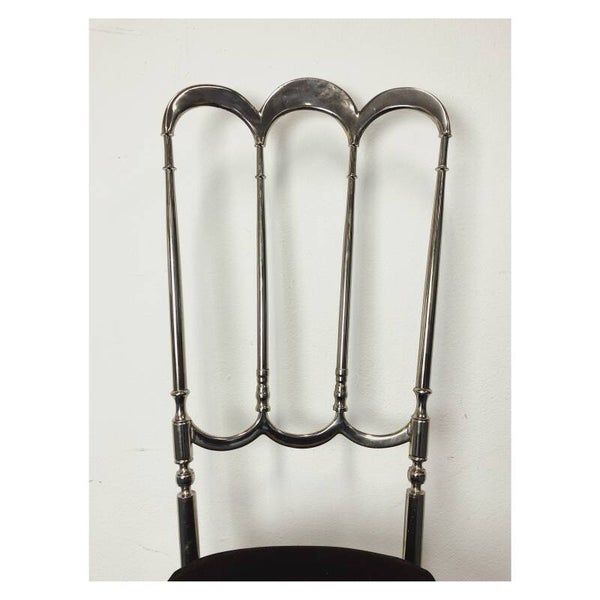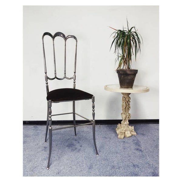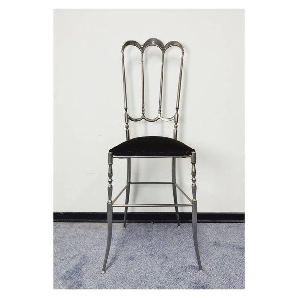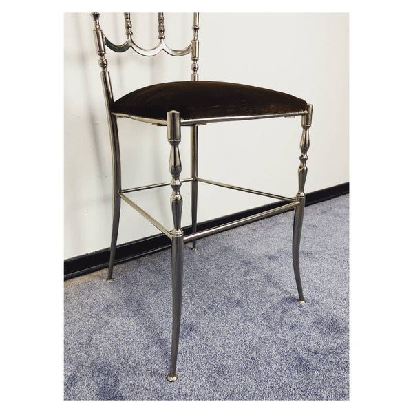 Chiavari stoel van zilver messing! De sierlijke stoel komt uit Italië, vermoedelijk uit de jaren '60. Erg tof item om als decoratieobject te gebruiken in de slaap- of woonkamer. De zitting heeft bruine fluwelen bekleding en kan los van wat hele lichte slijtage nog zeker door voor een volgende ronde! Daarnaast heeft het messing wat lichte leeftijdsgerelateerde krasjes, niks ernstigs!