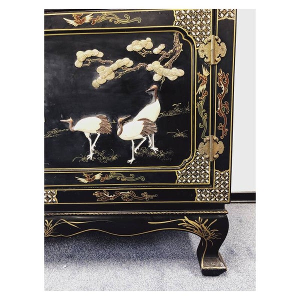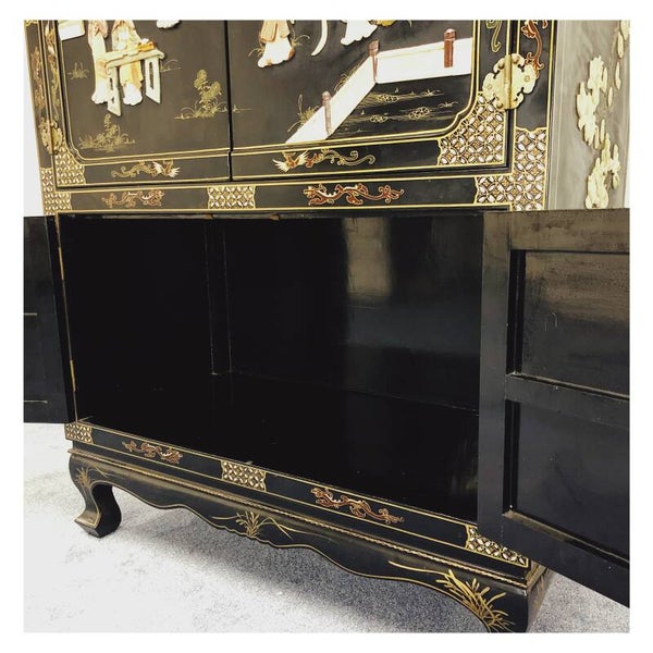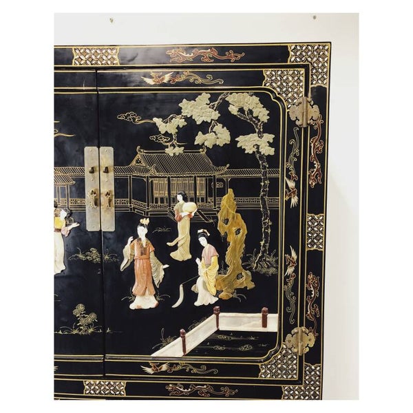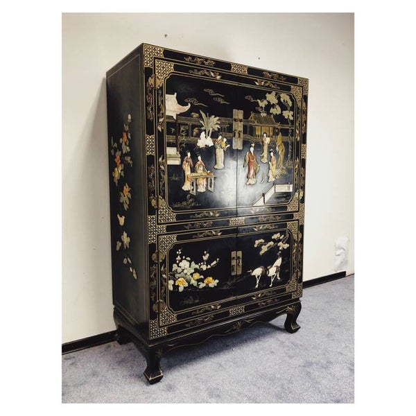 Wat een beauty is dit! Schitterende grote Chinese kast vermoedelijk rond 1980 gemaakt. De buitenkant van de kast heeft verschillende schilderingen en daarnaast ook versieringen ingelegd met speksteen! Naast de buitenkant heeft de kast ook versieringen aan de binnenkanten van de deuren, ook hier is speksteen gebruikt!
