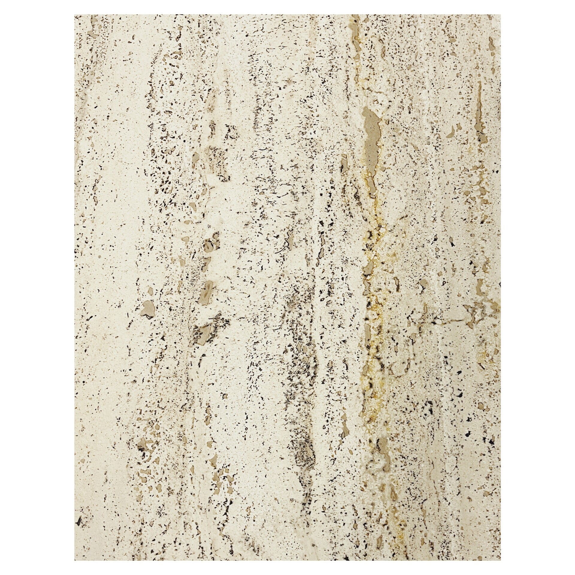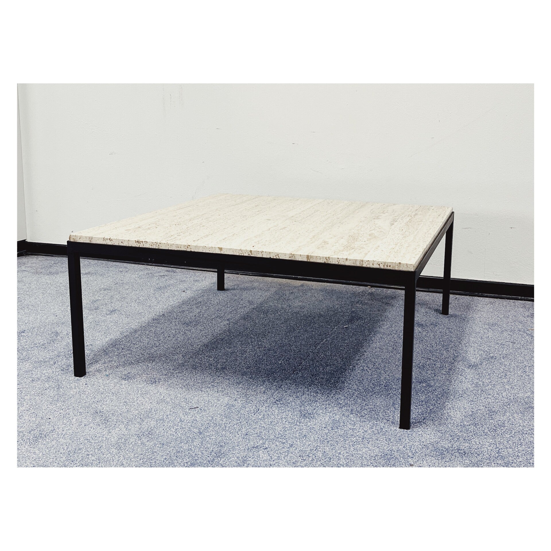 Prachtige mid-century travertin salontafel. Het zware bovenblad ligt los op het stalen vierkante onderstel waar het door zijn zwaarte goed op zijn plek blijft. De salontafel is in perfecte conditie en het massieve natuurstenen blad heeft een heldere wit/beige kleur. De randen van het blad vallen precies in het zwart stalen onderstel. Dit unieke natuurstenen meubel gaat helemaal mee in de trend van de natuurlijke materialen en kleuren.