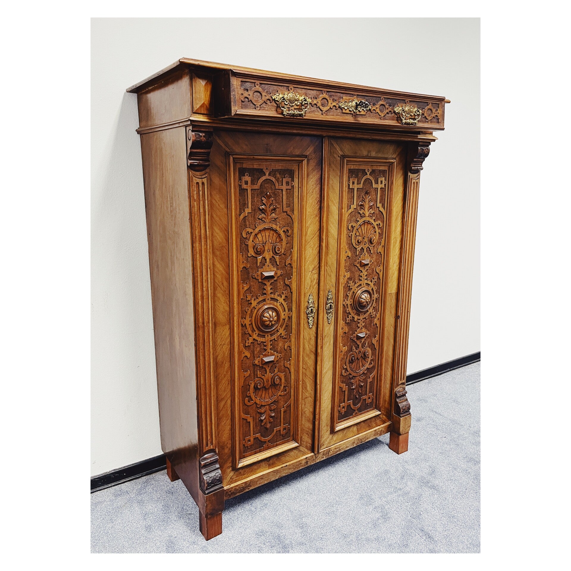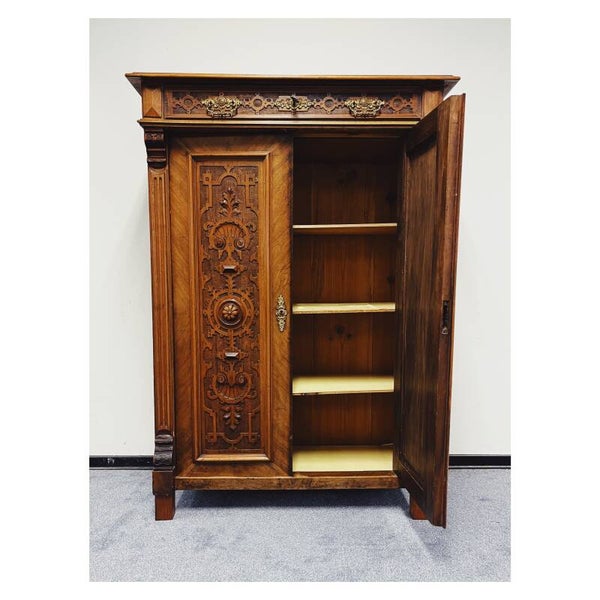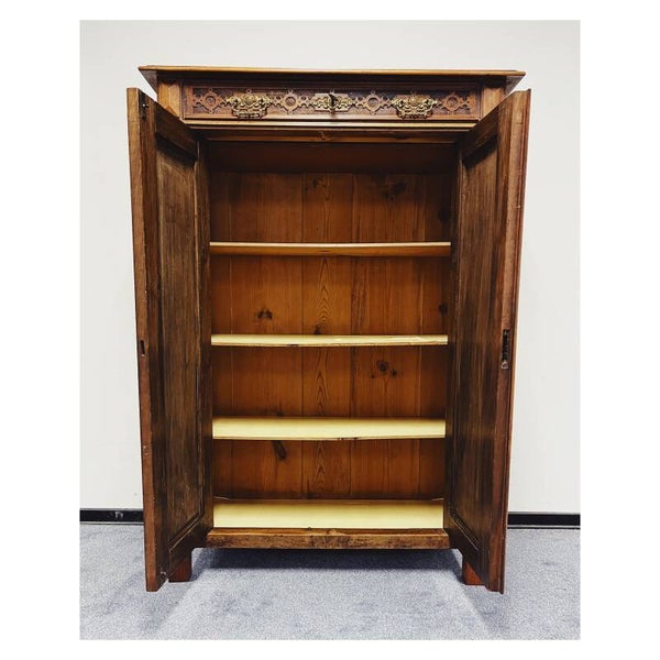 Bijzondere antieke kast met uit hout gesneden details. Deze stoere kast heeft een brede lade aan de bovenzijde en aan de binnenzijde een viertal brede schappen. Het meubel is rijkelijk versierd en gedecoreerd met bijzondere uit hout gesneden details. De twee deuren en de lade worden afgesloten met gouden messing handgrepen. De sleutel voor de bovenste lade is tevens ook de sleutel voor de deuren die kunnen worden afgesloten. De kast is gezien de leeftijd in goede vintage conditie.