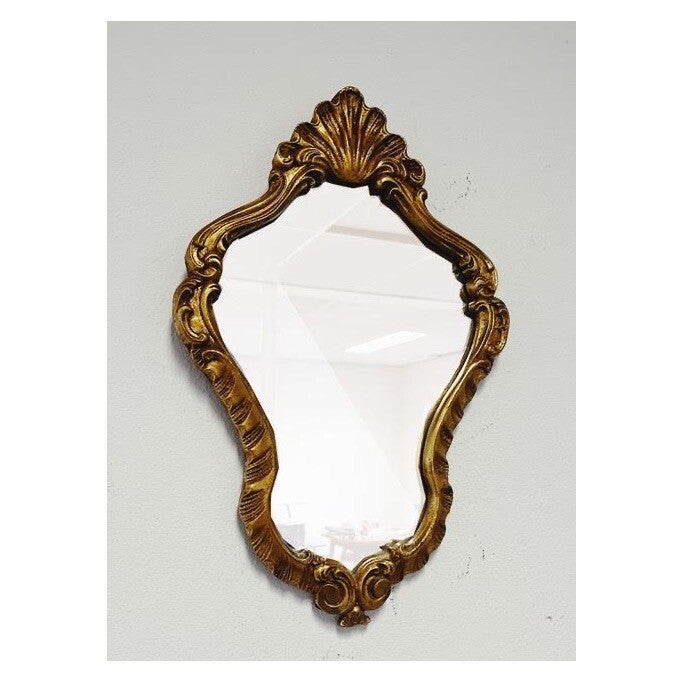 Klassieke kleine barok spiegel met decoratief gouden frame. De spiegel heeft een prachtige lijst met een sierlijke kuif. Deze gouden klassieker is in hele goede conditie en heeft een stevig ophangsysteem. Afmetingen Hoogte: 45cmBreedte: 29,5cm