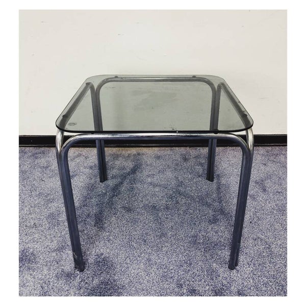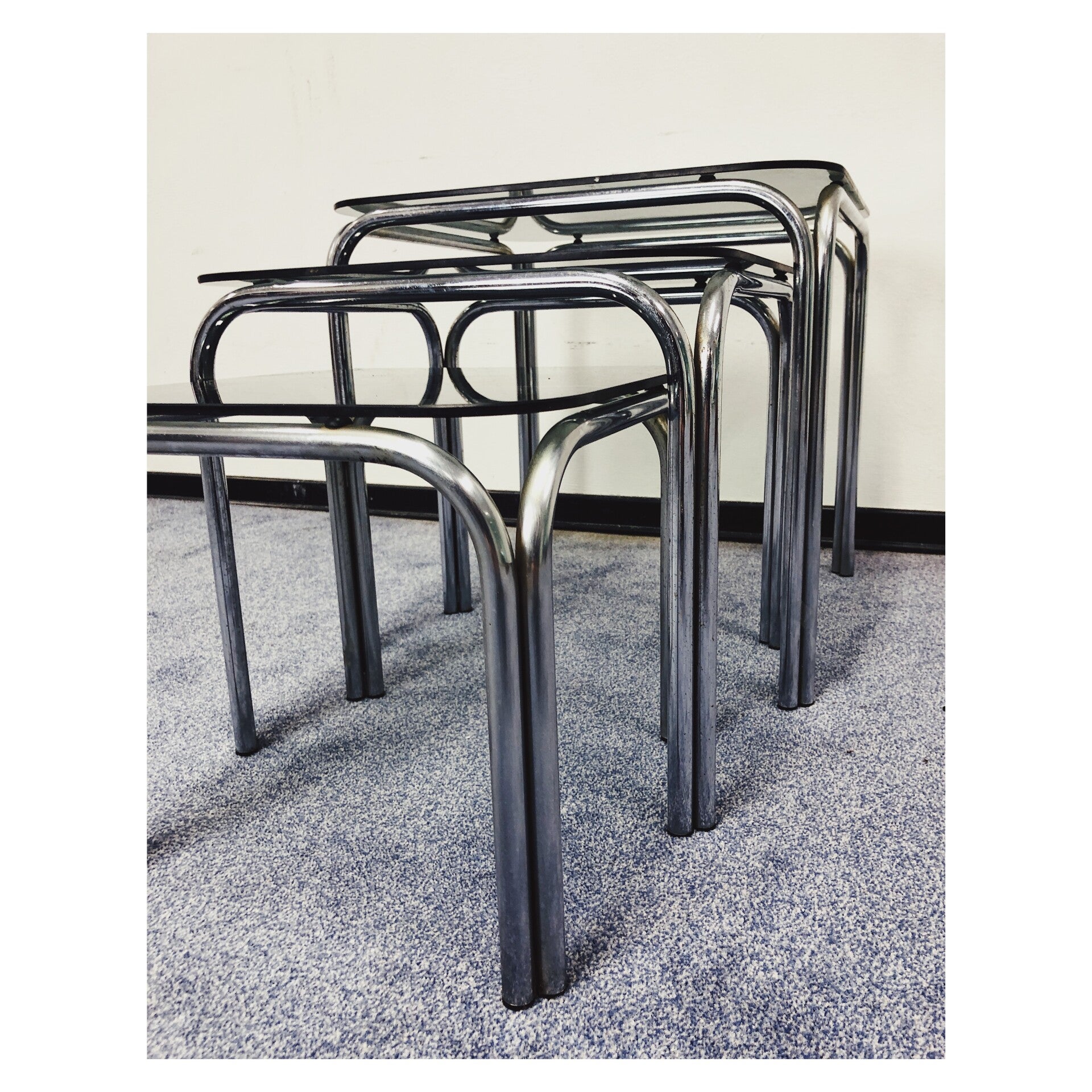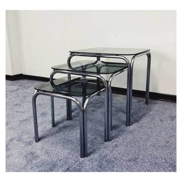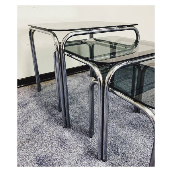 Nesting Tables van zilver chroom en rookglas. De drie tafeltjes bieden ruimte voor decoratie, als bijzettmeubel voor de bank, maar kunnen ook los als tafeltje gebruikt worden! De glasplaten liggen los op het zilveren onderstel en worden vastgehouden door zuignapjes. De glasplaten en het chroom hebben hier en daar wat gebruikssporen naar leeftijd, niks ernstigs.