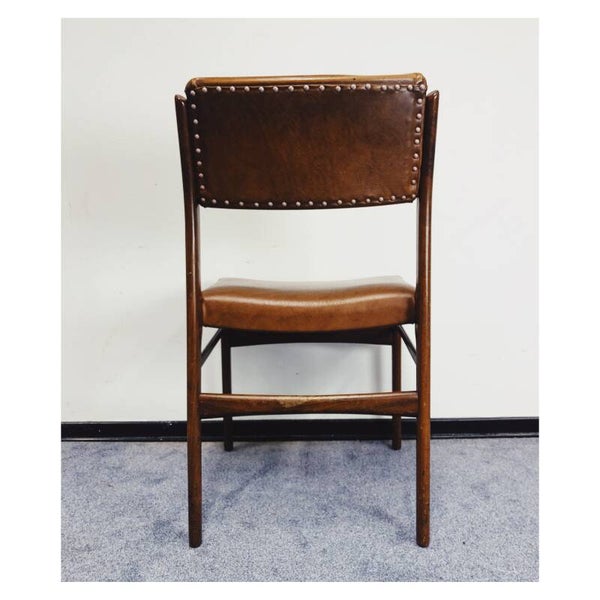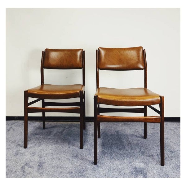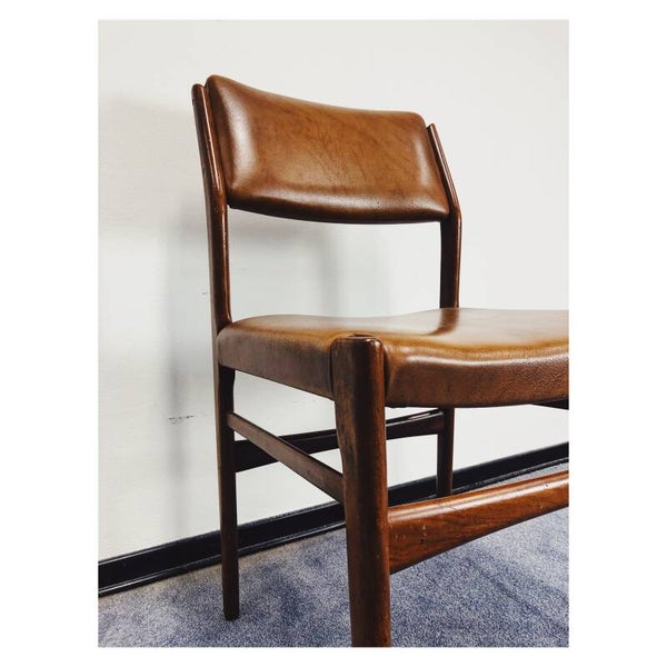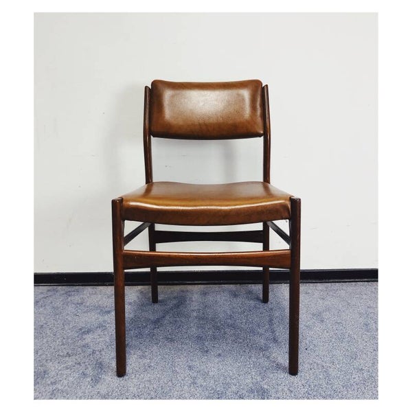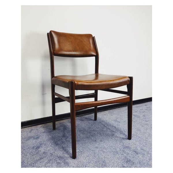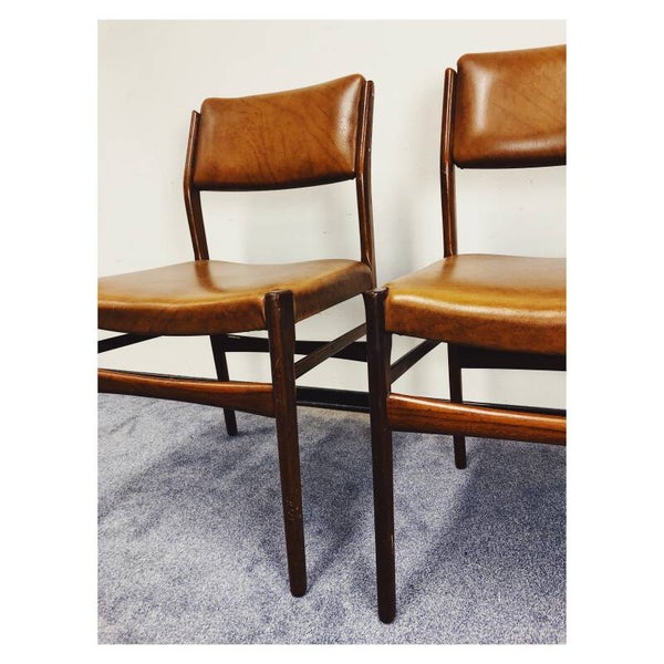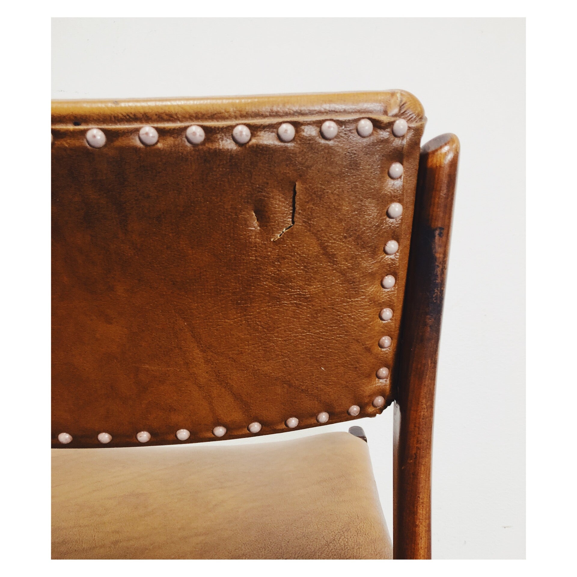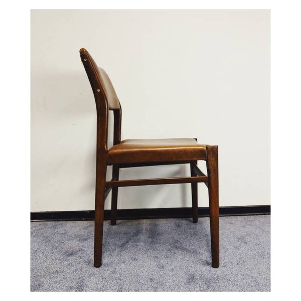 Leuke set vintage eetkamerstoelen met bruin skai leer op het rug- en zitvlak! De stoelen zitten erg lekker en zijn in het algemeen nog zeker klaar voor een volgende ronde! Wel heeft één van de stoelen een klein scheurtje in het leer (zie foto). Gelukkig zit dit scheurtje aan de achterkant van de stoel. De stoelen worden verkocht als set!