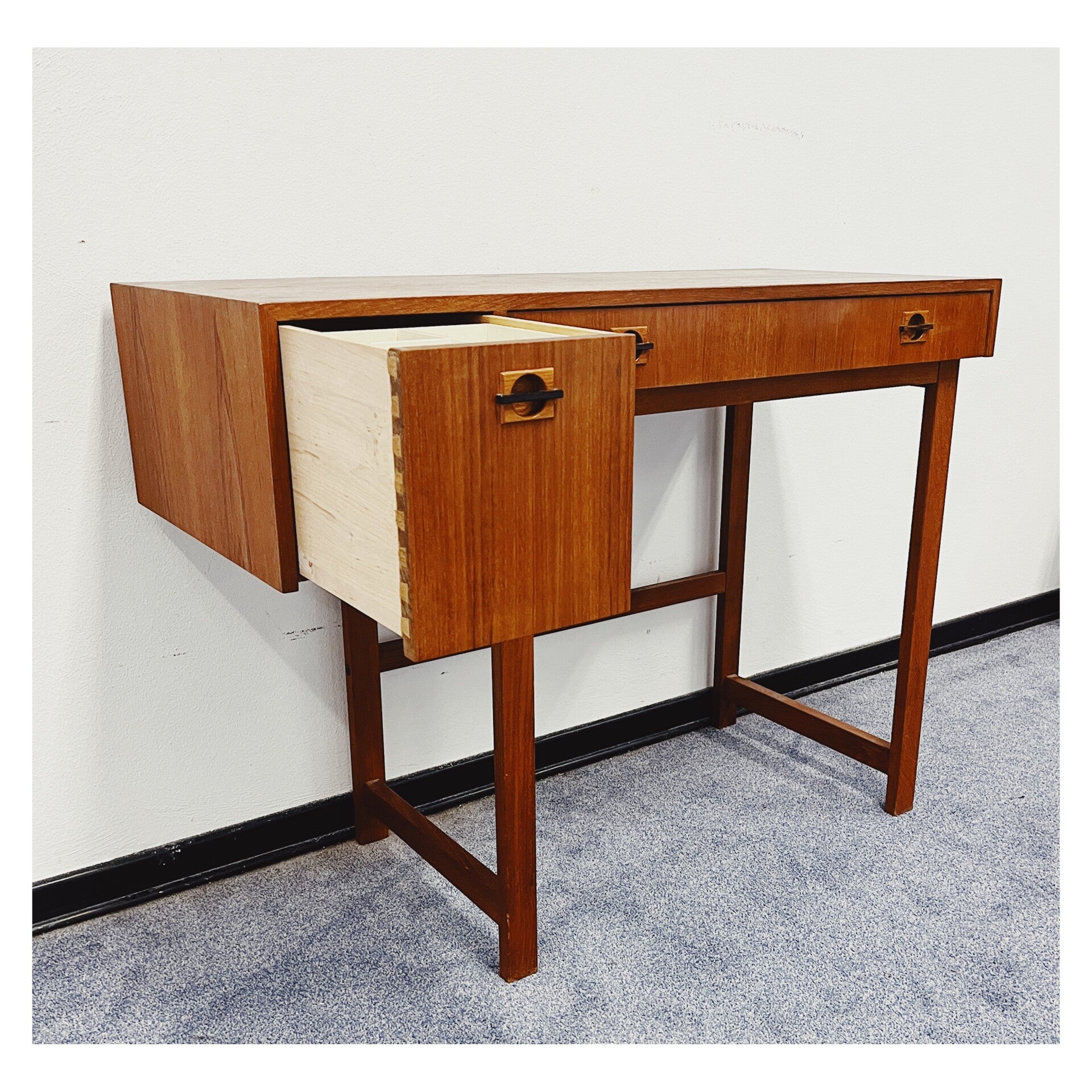 Vintage Deens haltafeltje. Het compacte tafeltje is mooi vormgegeven door zijn unieke design. Het kastje is ook te gebruiken als klein bureautje en heeft een ruime lade in het midden en heeft aan de linkerzijde nog een extra opbergvak. Het meubel heeft op het bovenblad een lichte verkleuring maar is verder in hele goede conditie.