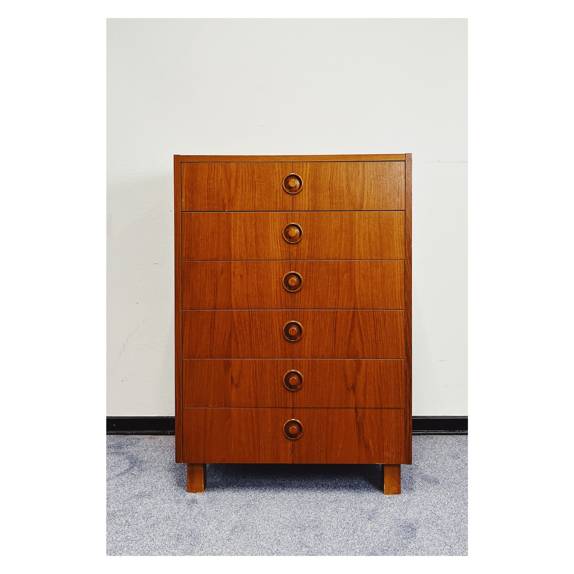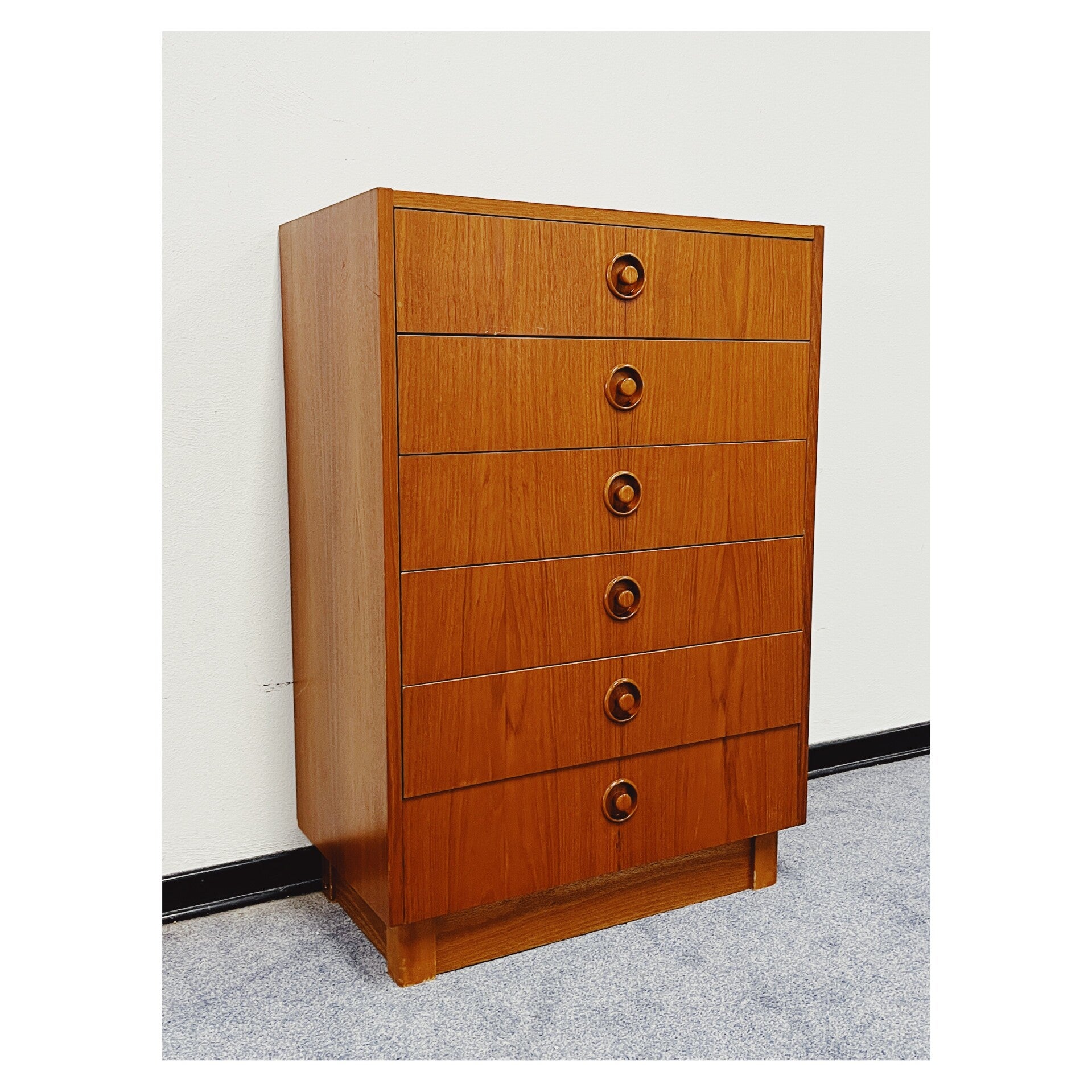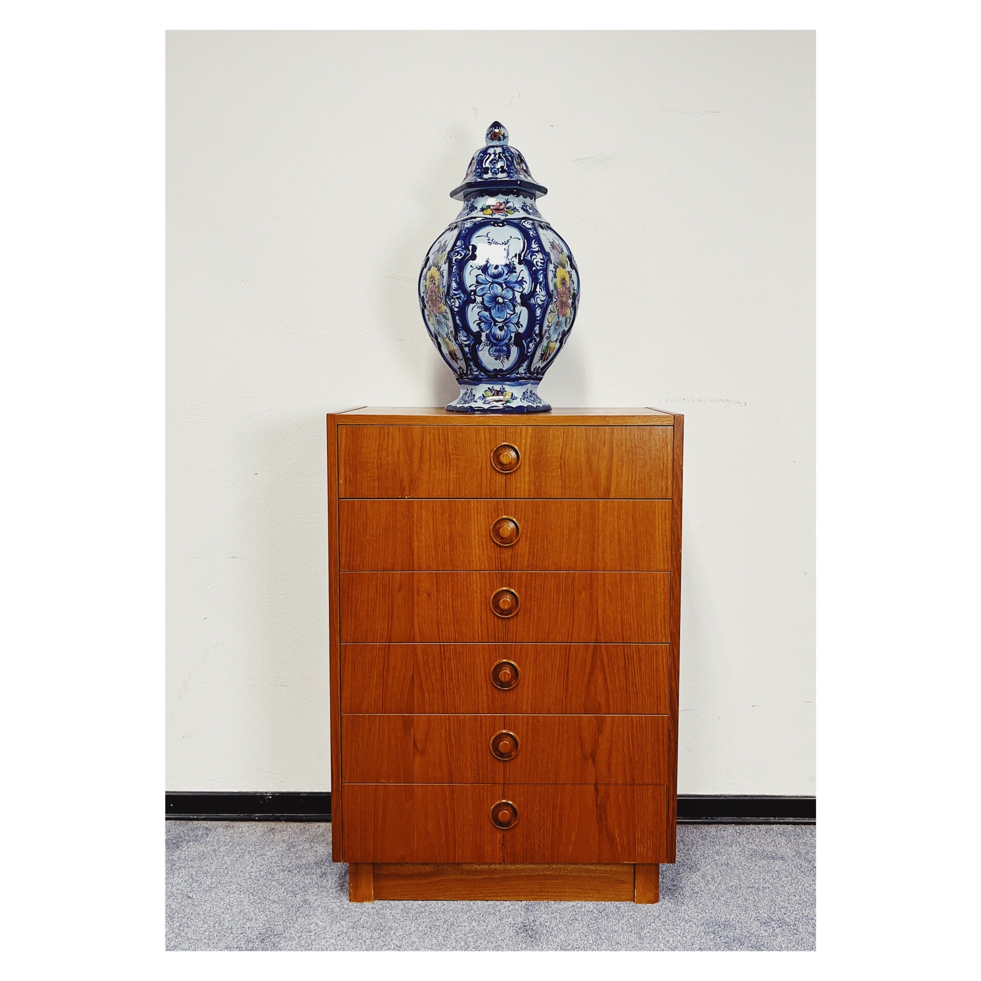 Deense ladekast vervaardigd uit teak en fineer. Het jaren 60 kastje heeft een uniek hoog model met zes laden en ronde houten handgrepen. De kast is zeer praktisch om al je spullen in op te bergen en heeft daarbij een mooi strak design. De kast is in enorm goede conditie en de houten poten kunnen op twee manieren gebruikt worden. (zie de fotos voor meer details)
