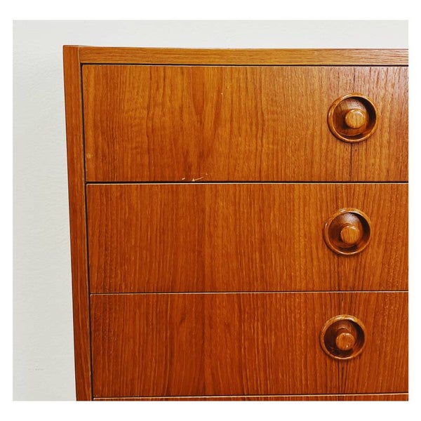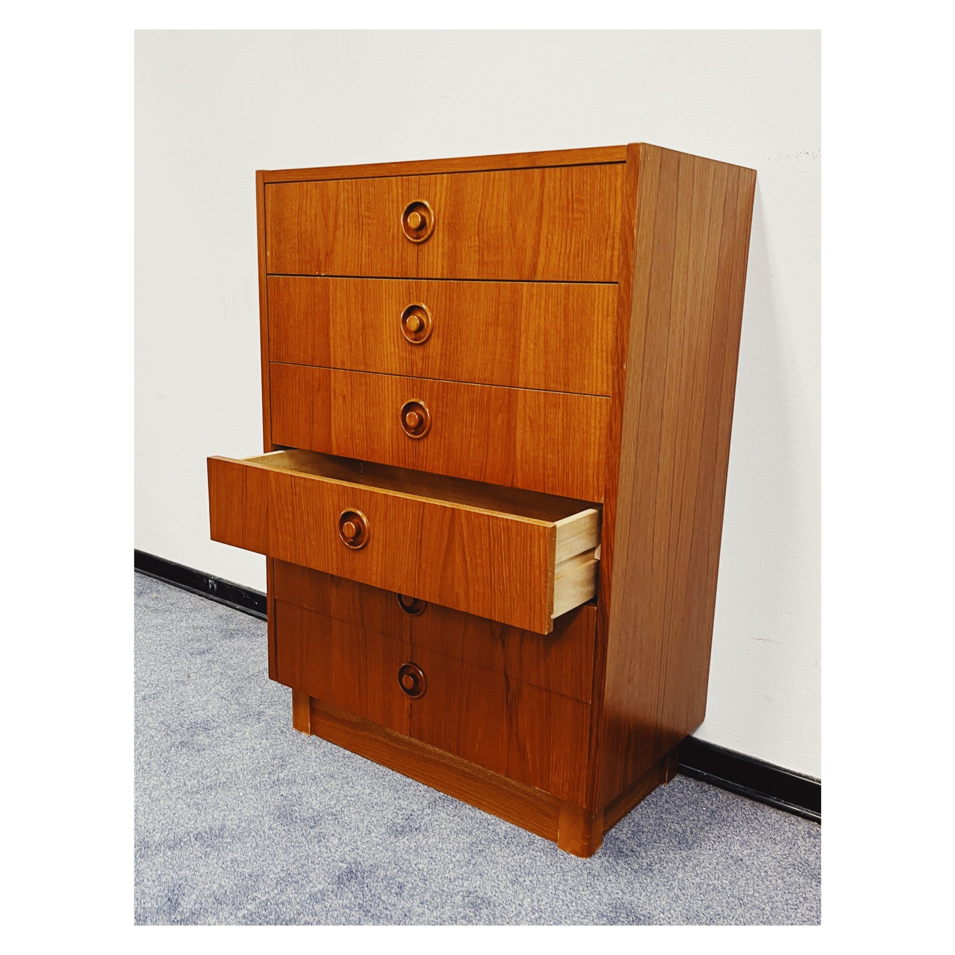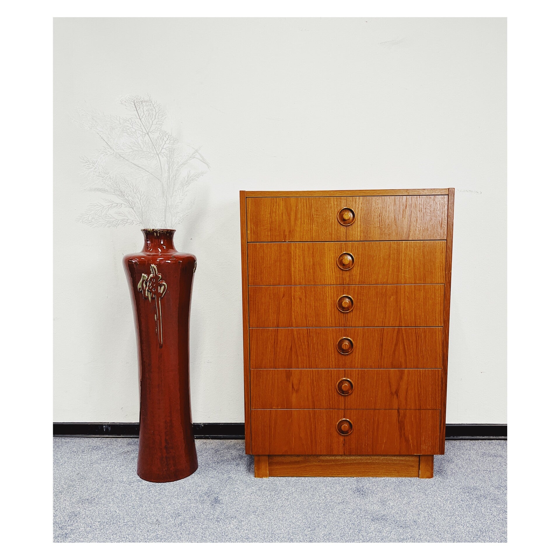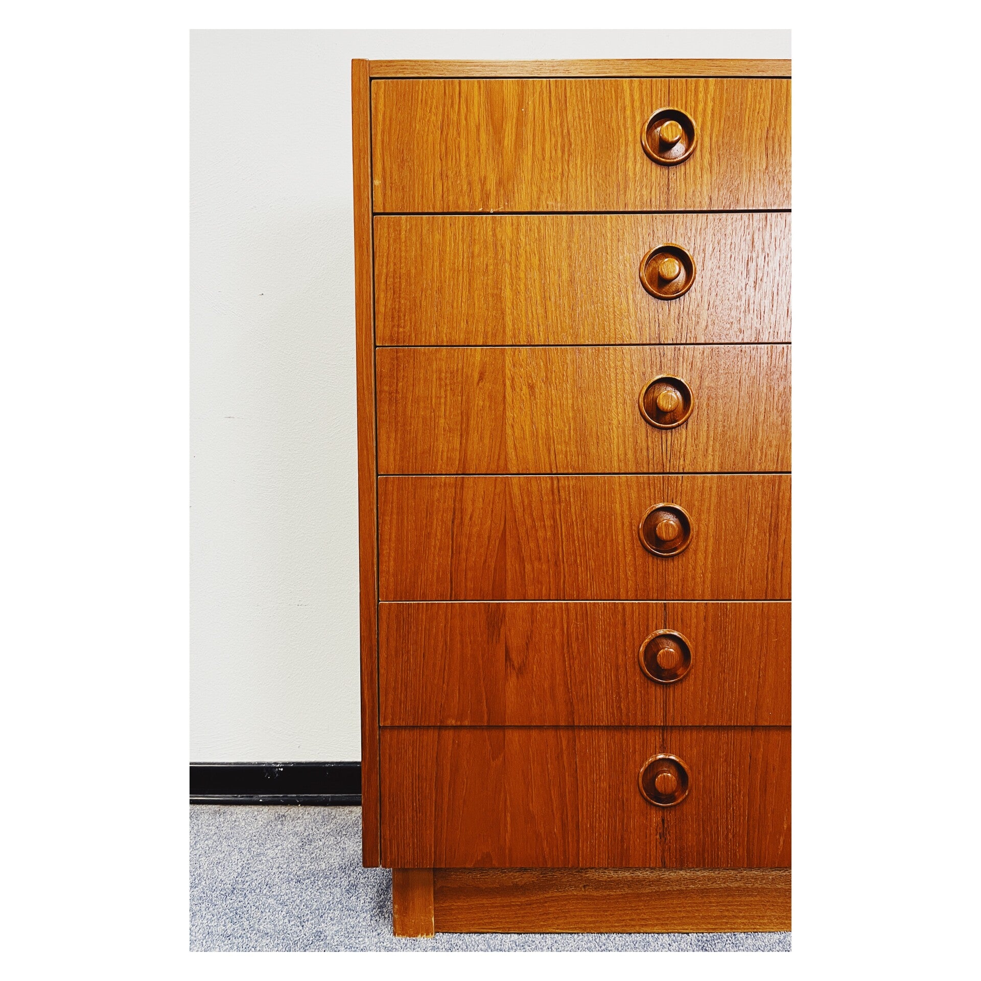 Deense ladekast vervaardigd uit teak en fineer. Het jaren 60 kastje heeft een uniek hoog model met zes laden en ronde houten handgrepen. De kast is zeer praktisch om al je spullen in op te bergen en heeft daarbij een mooi strak design. De kast is in enorm goede conditie en de houten poten kunnen op twee manieren gebruikt worden. (zie de fotos voor meer details)
