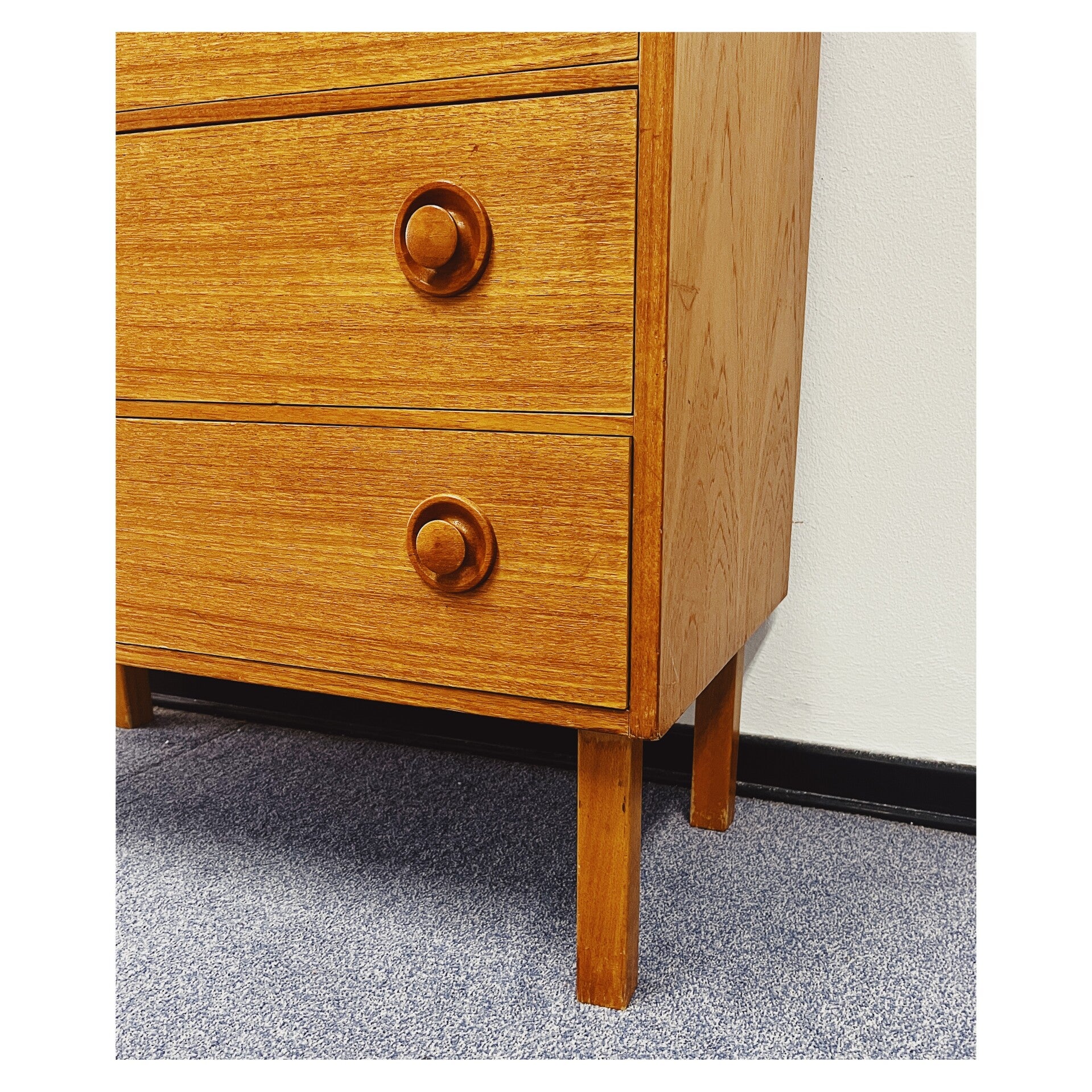 Deense ladekast vervaardigd uit teak en fineer. Het jaren 60 kastje heeft een handig model met vier laden en ronde houten handgrepen. De kast is zeer praktisch om al je spullen in op te bergen en heeft daarbij een mooi strak design. De kast is in enorm goede conditie en heeft minimale gebruikssporen.