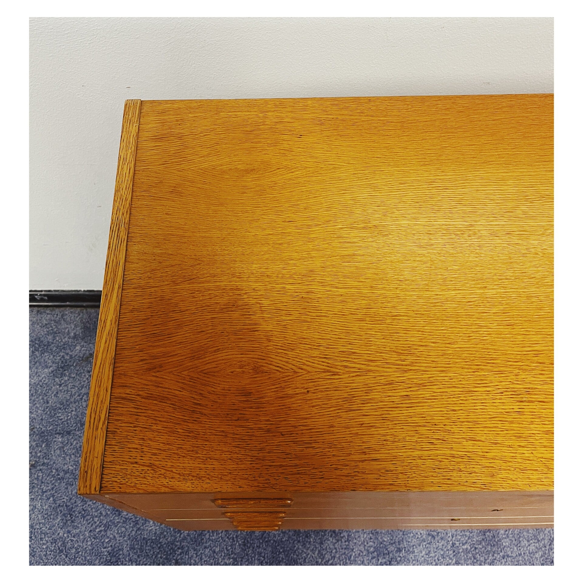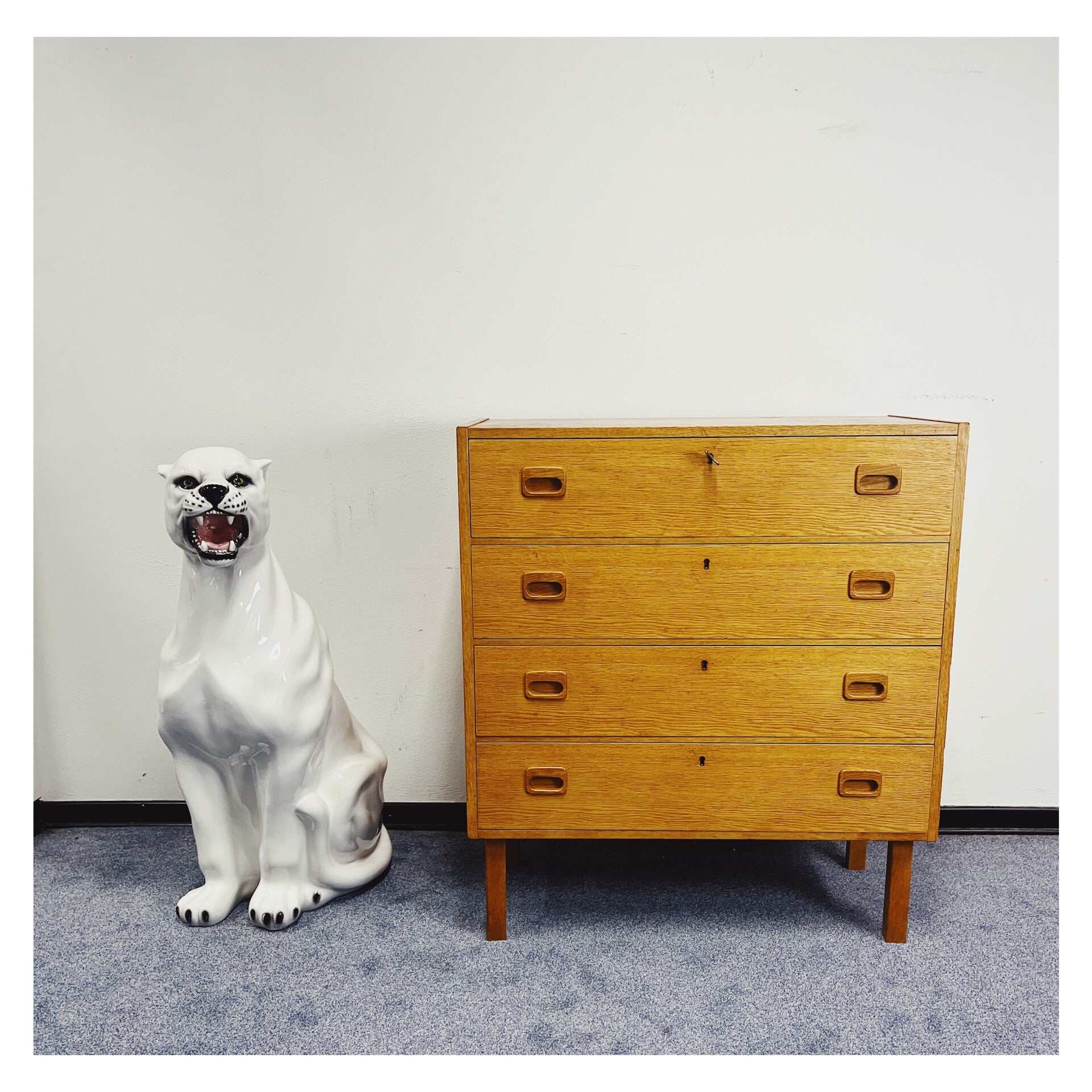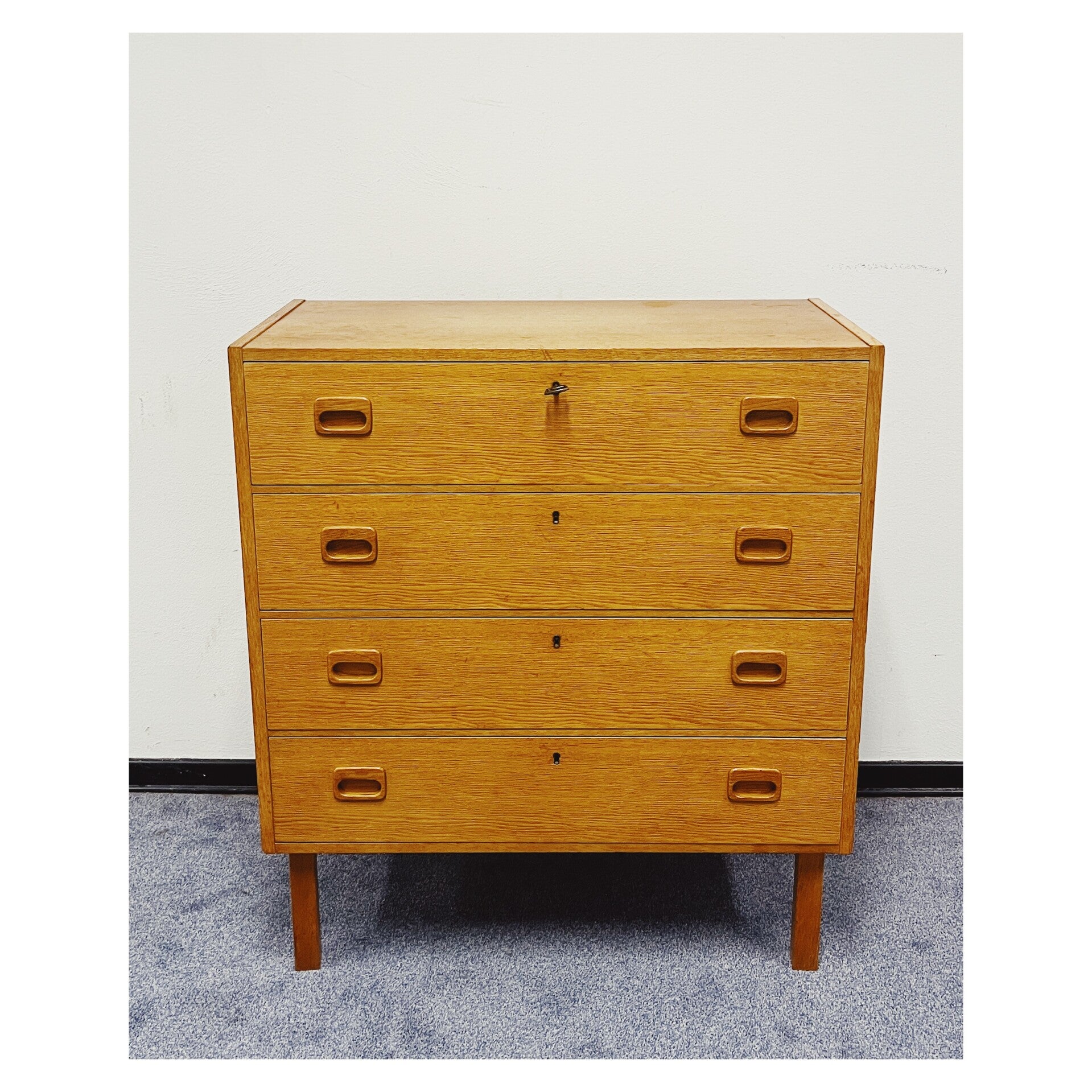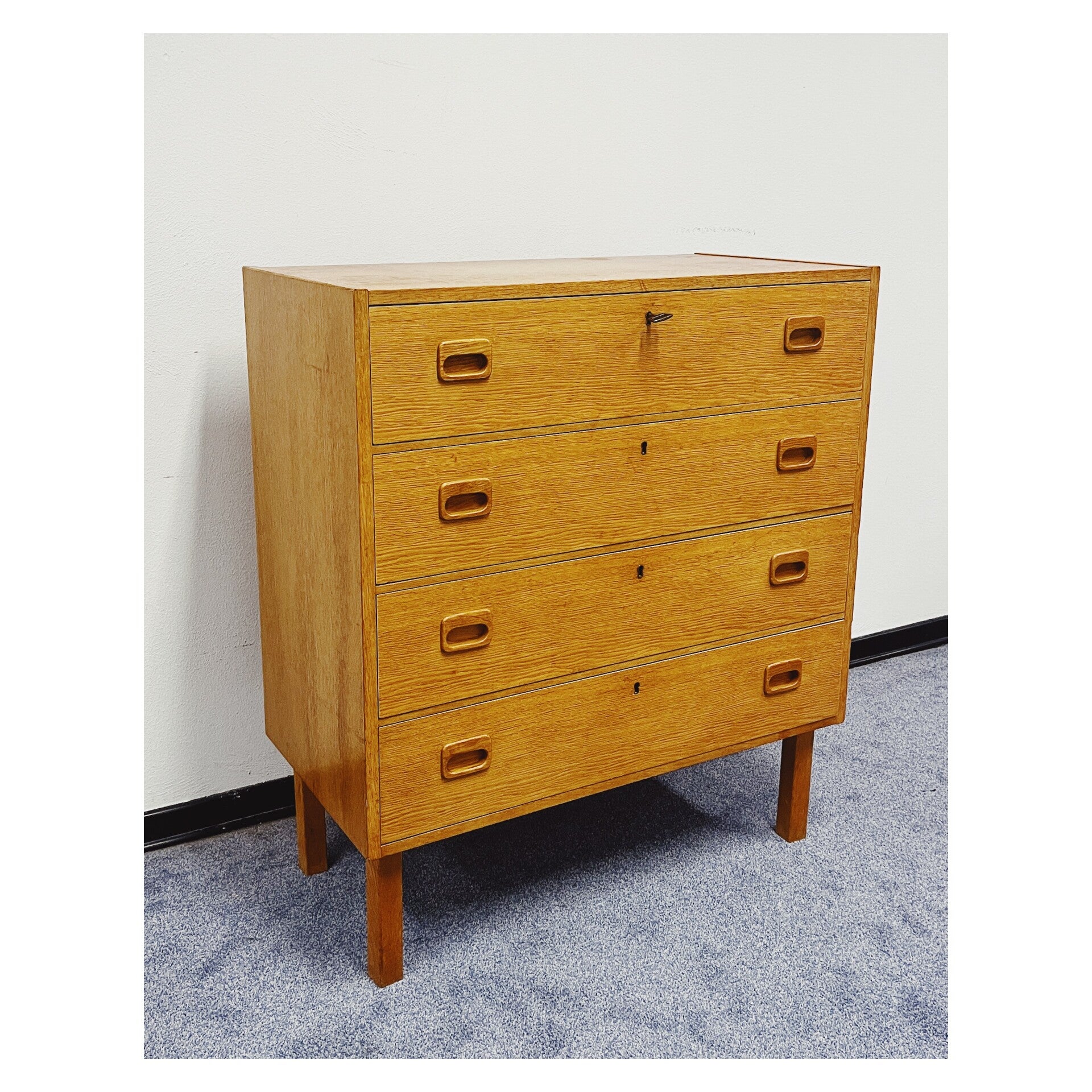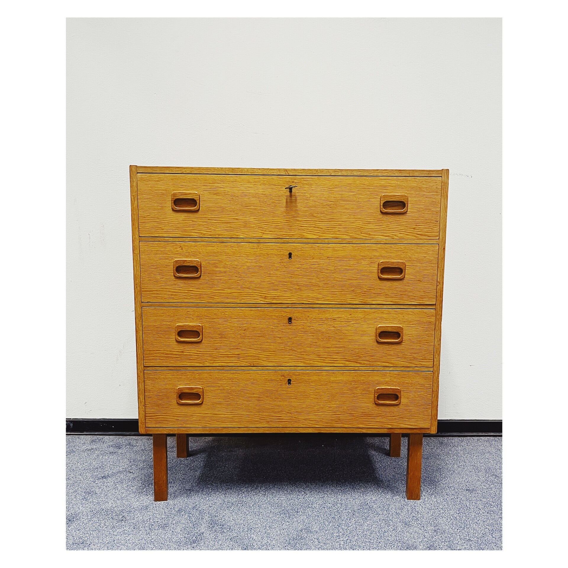 Zweedse ladekast vervaardigd uit teak en fineer. Het jaren 60 kastje heeft een handig model met vier laden en vierkante houten handgrepen. De kast is zeer praktisch om al je spullen in op te bergen en heeft daarbij een mooi strak design. De kast is in goede conditie en heeft minimale gebruikssporen. De laden zijn af te sluiten met een bijbehorende sleutel.