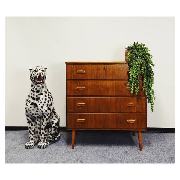 Zweedse ladekast vervaardigd uit teak en fineer. Het jaren 60 kastje heeft een hoog model met vier laden en horizontale houten handgrepen. De kast is zeer praktisch om al je spullen in op te bergen en heeft daarbij een mooi strak design. De kast is in goede conditie en heeft wat minimale gebruikssporen. De laden zijn af te sluiten met een bijbehorende sleutel.