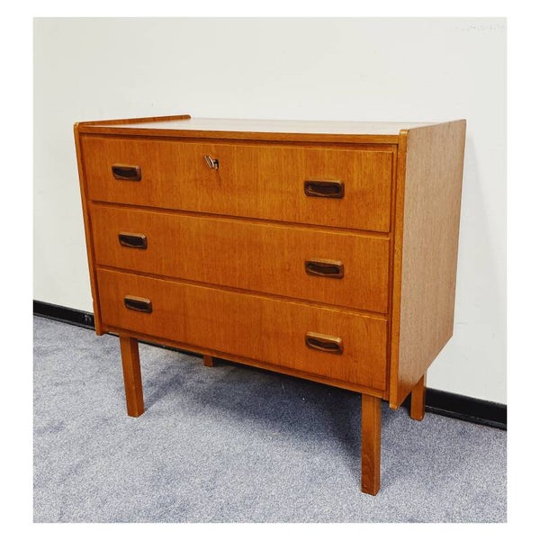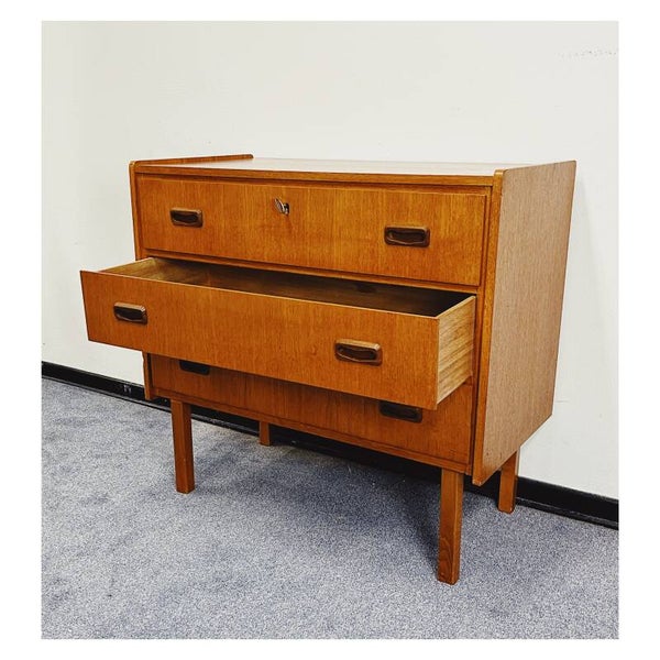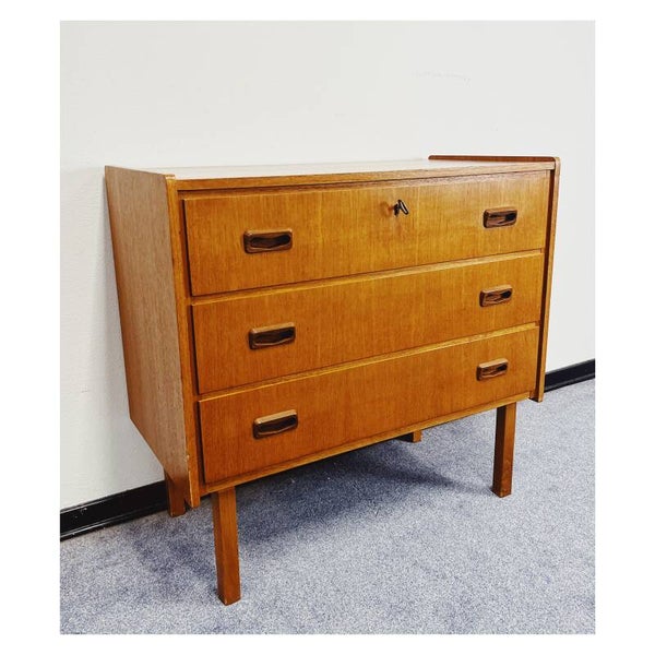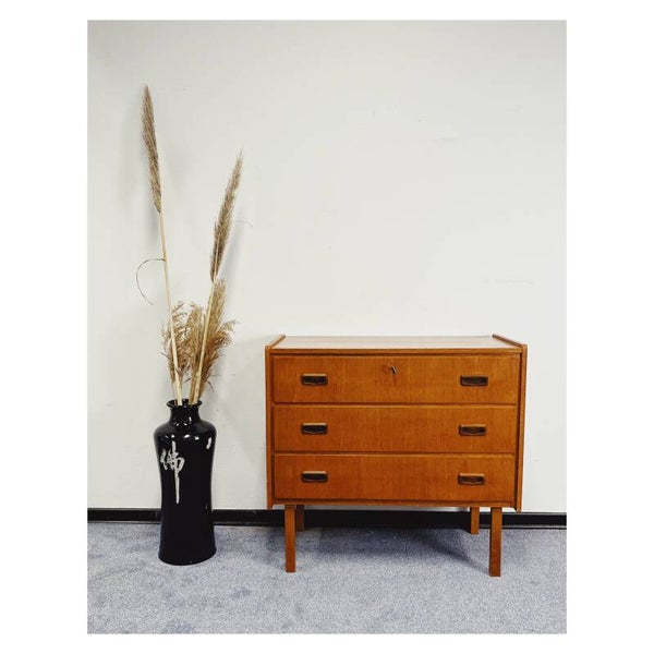 Scandinavische vintage meubels zijn op dit moment helemaal hip! Deze authentieke ladenkast past helemaal in dit straatje. De teak houten kast heeft drie ruime opbergladen met prachtige uit hout gesneden handgrepen. De kast is uitgevoerd in prachtig teakfineer. De kast is in goede vintage conditie met wel wat verkleuringen op het bovenblad.