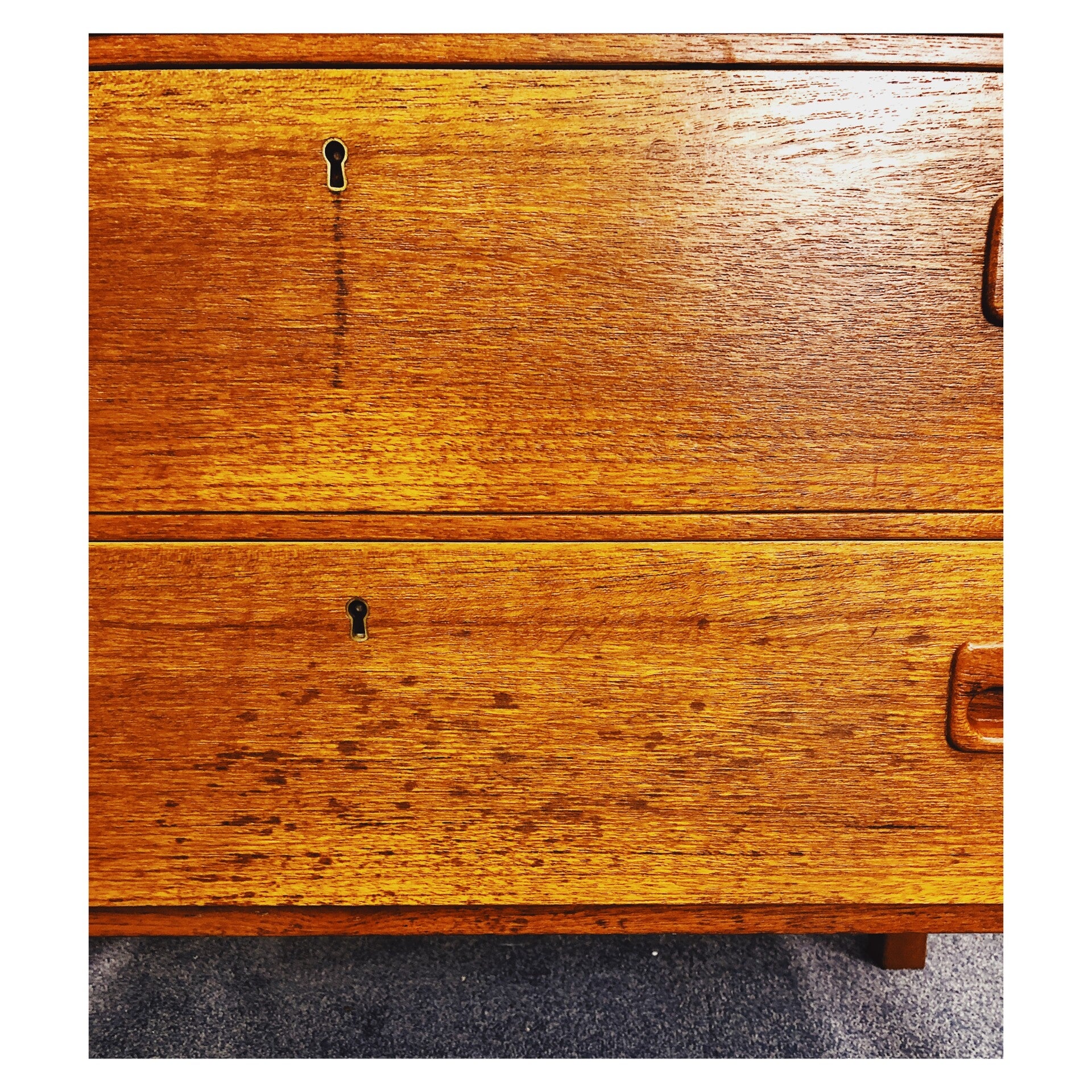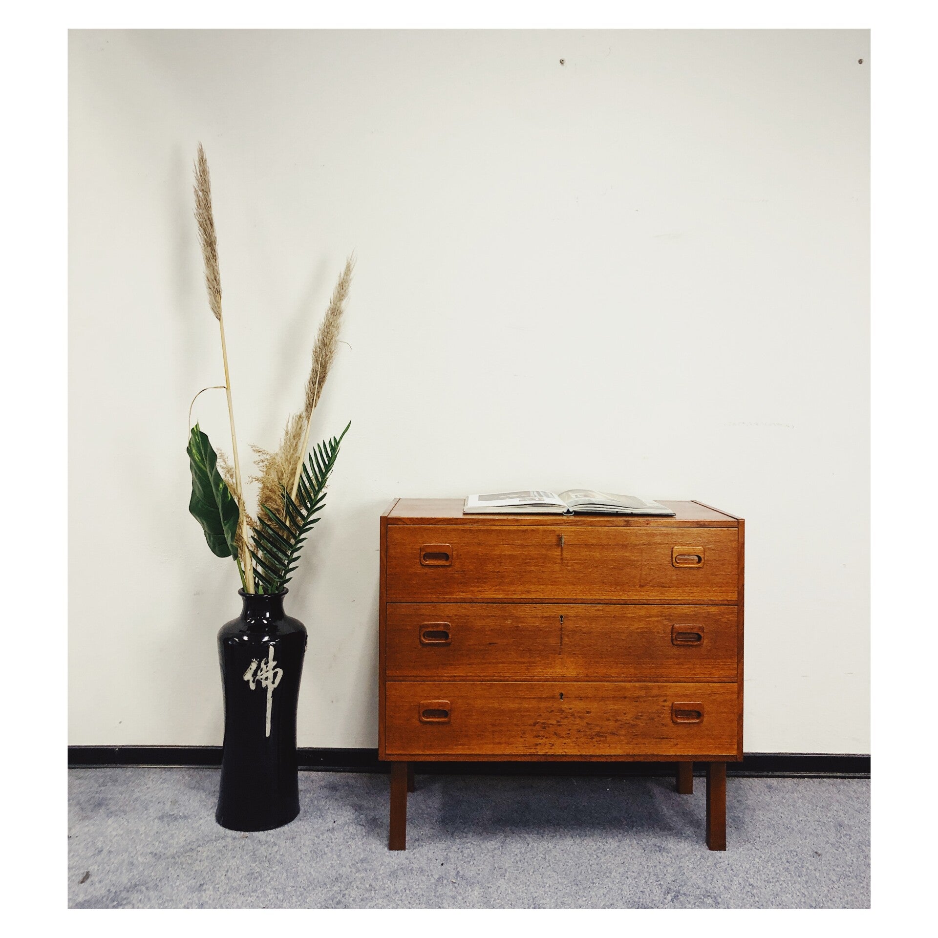 Vintage ladekastje uit Zweden. De teakhouten kast heeft drie ruime opbergladen met prachtige uit hout gesneden handgrepen en kunnen elk afzonderlijk worden afgesloten. De kast is uitgevoerd in prachtig teakfineer. De kast is in goede vintage conditie met wel wat zichtbare verkleuringen en vlekjes.