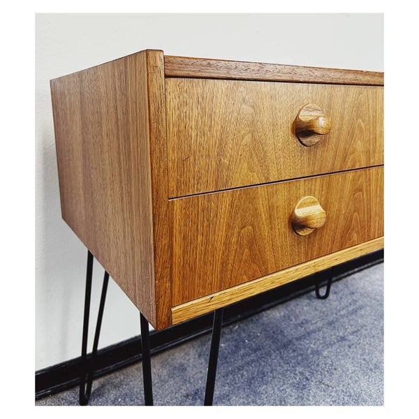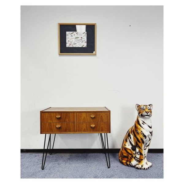 Unieke vintage sidetable met vier lades. Het teakhouten meubel staat op zwart metalen hairpin poten waardoor het geheel een strak design krijgt. De ladekast heeft vier ruime opbergladen die worden afgewerkt met houten handgrepen. De kast heeft wat kleine gebruikssporen maar is verder in hele goede conditie.
