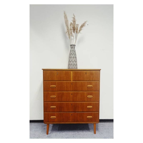 Zweedse ladekast vervaardigd uit teak en fineer. De jaren 60 kast heeft een hoog model met vier grote laden en twee kleine laden. De kast is zeer praktisch om al je spullen in op te bergen en heeft daarbij een mooi strak design. De kast is in goede conditie en heeft wat minimale gebruikssporen. De laden zijn af te sluiten met een bijbehorende sleutel.