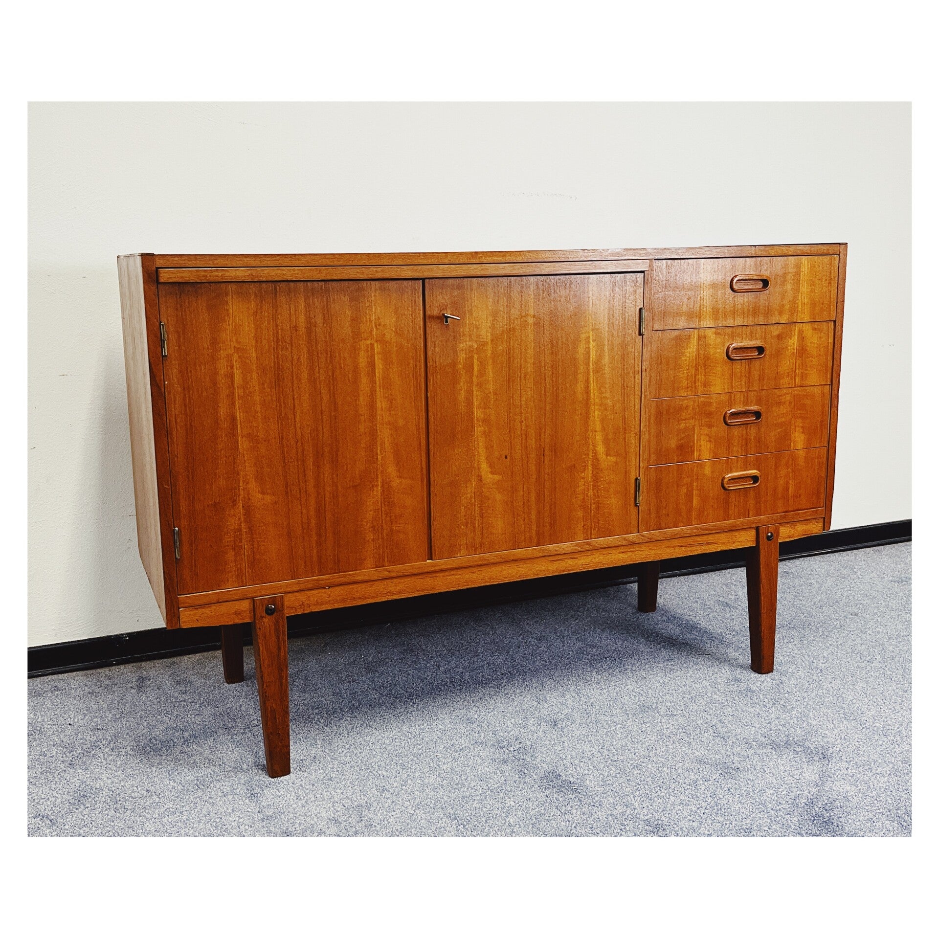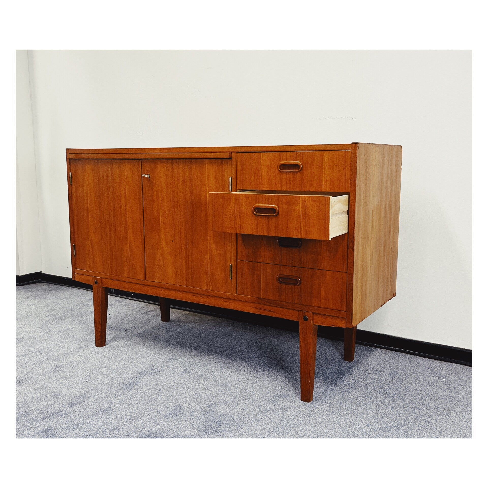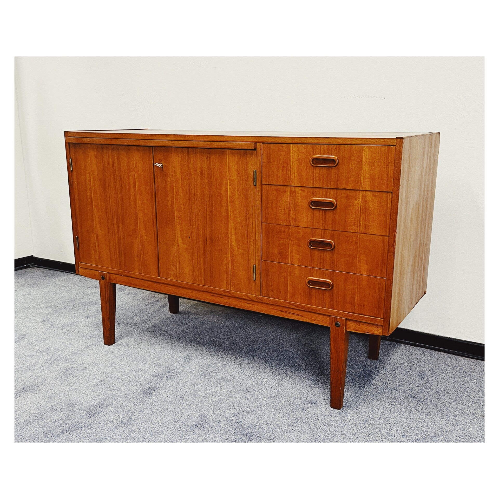 Zweeds dressoir van teakfineer. Dit Mid-century wandmeubel is ontworpen in de jaren 60. Het dressoir heeft vier lades aan de rechterzijde en twee afsluitbare deuren waarachter zich veel opbergruimte bevindt. Het meubel heeft wel wat zichtbare gebruikssporen. (zie foto's voor meer details) Gezien de gebruikssporen wordt het dressoir verkocht voor een zacht prijsje.