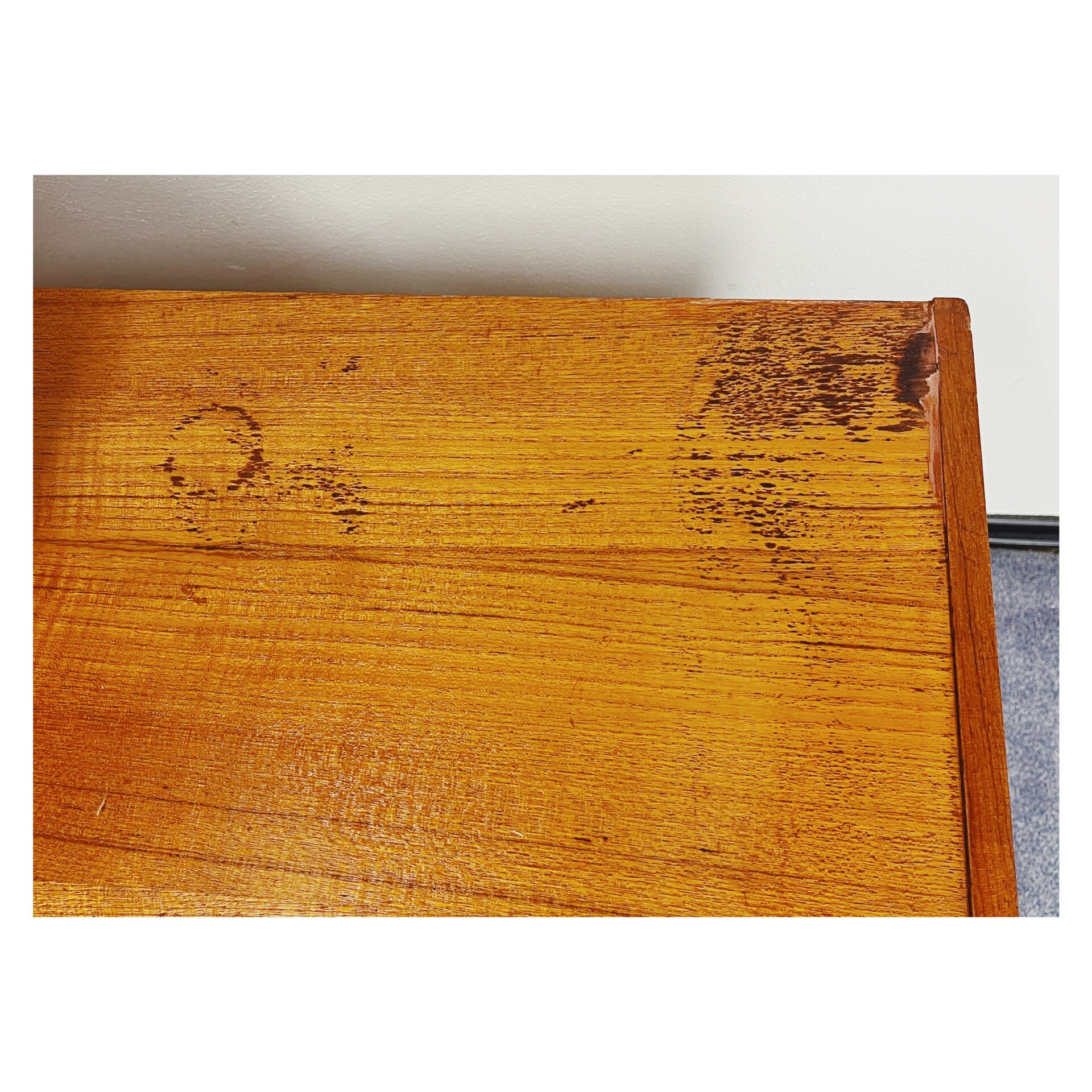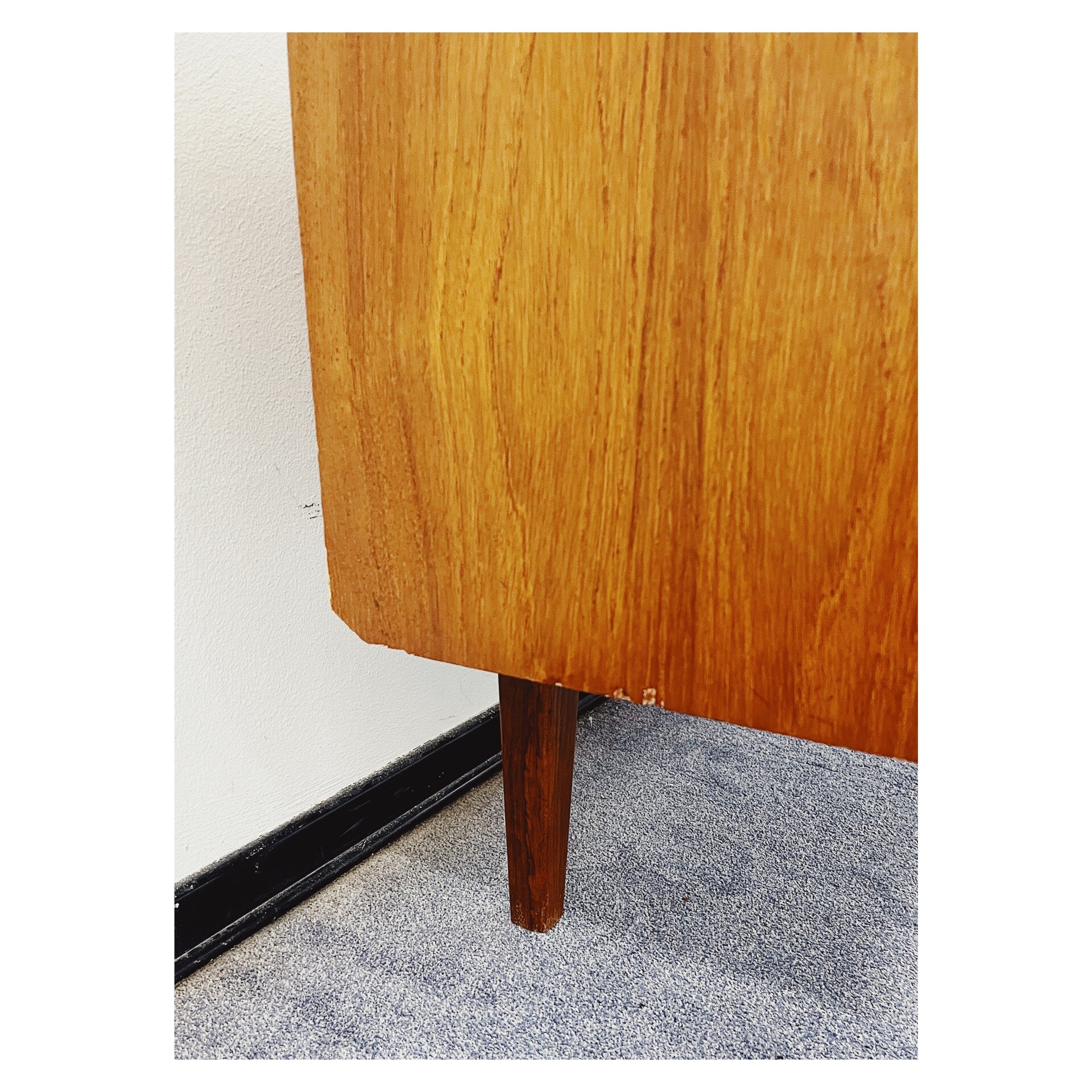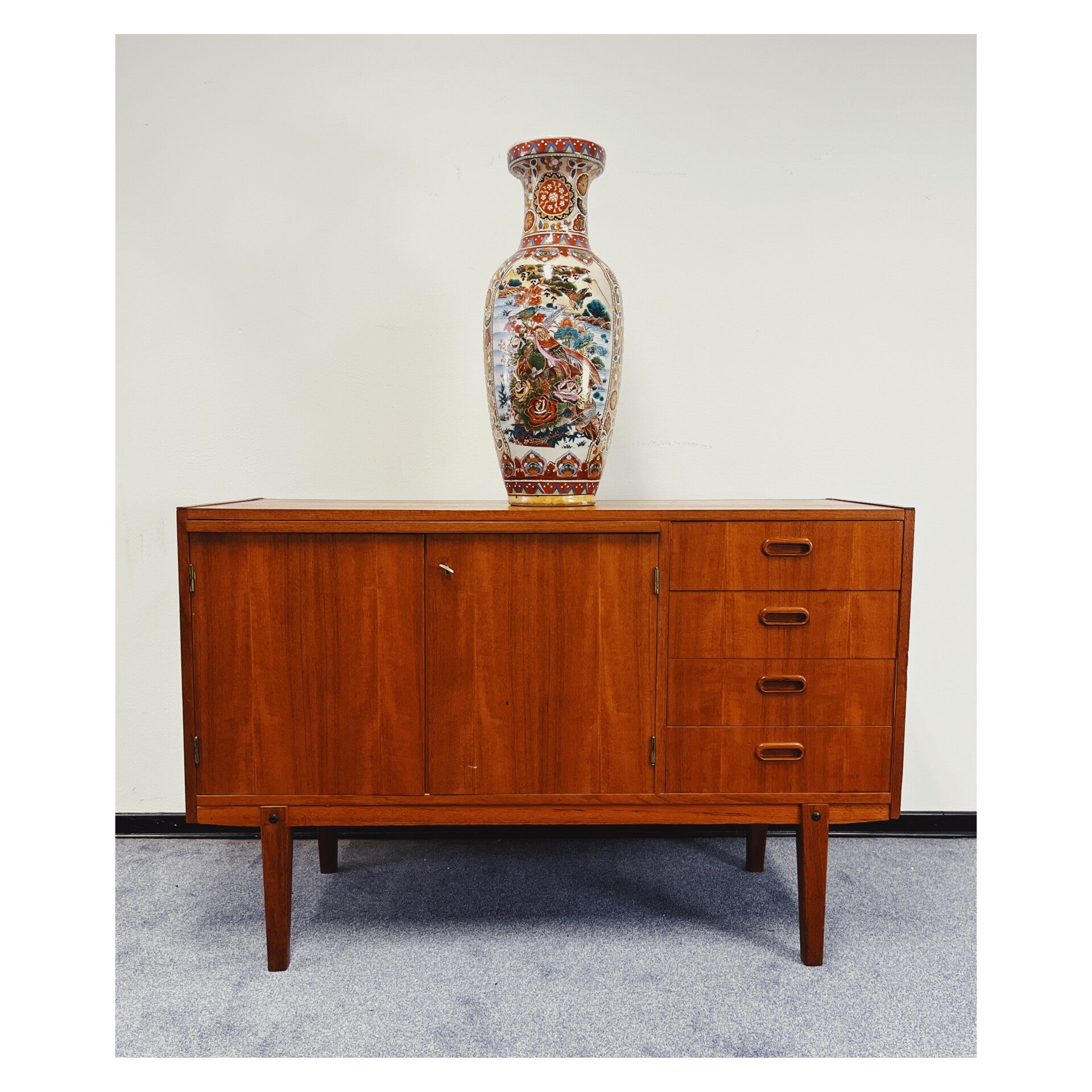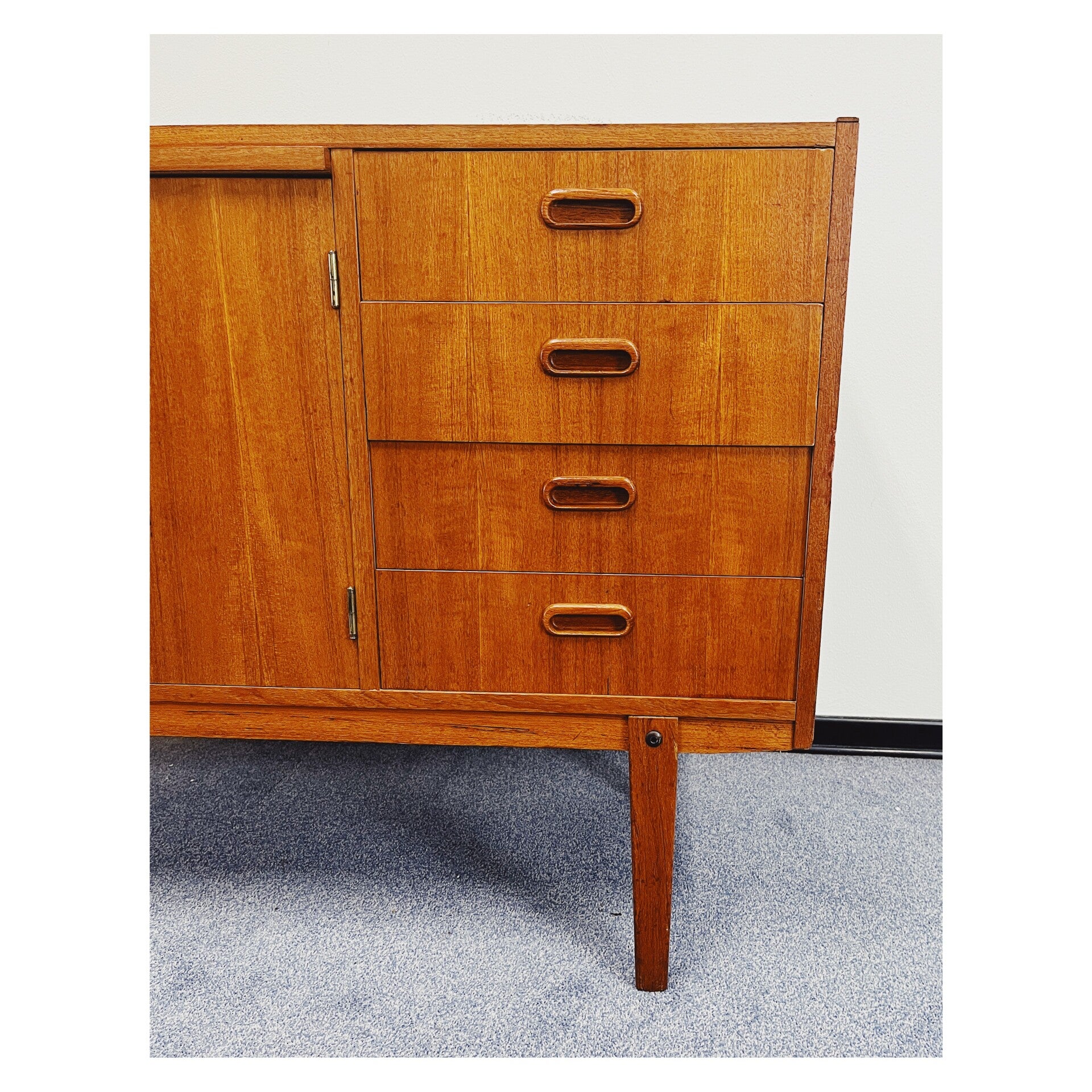 Zweeds dressoir van teakfineer. Dit Mid-century wandmeubel is ontworpen in de jaren 60. Het dressoir heeft vier lades aan de rechterzijde en twee afsluitbare deuren waarachter zich veel opbergruimte bevindt. Het meubel heeft wel wat zichtbare gebruikssporen. (zie foto's voor meer details) Gezien de gebruikssporen wordt het dressoir verkocht voor een zacht prijsje.