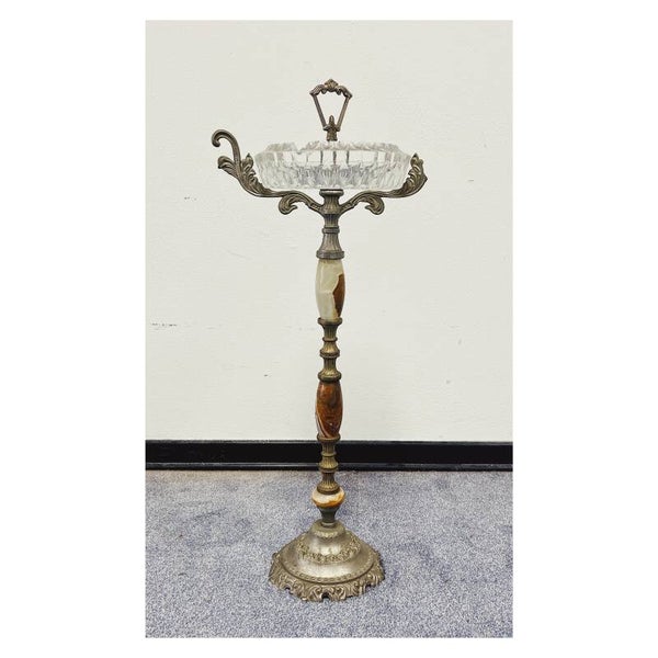 Antieke kristallen staande asbak op bronzen voet met marmeren details. De asbak heeft prachtige sierlijke messing details en is in goede vintage conditie!Afmetingen Hoogte: 65cm