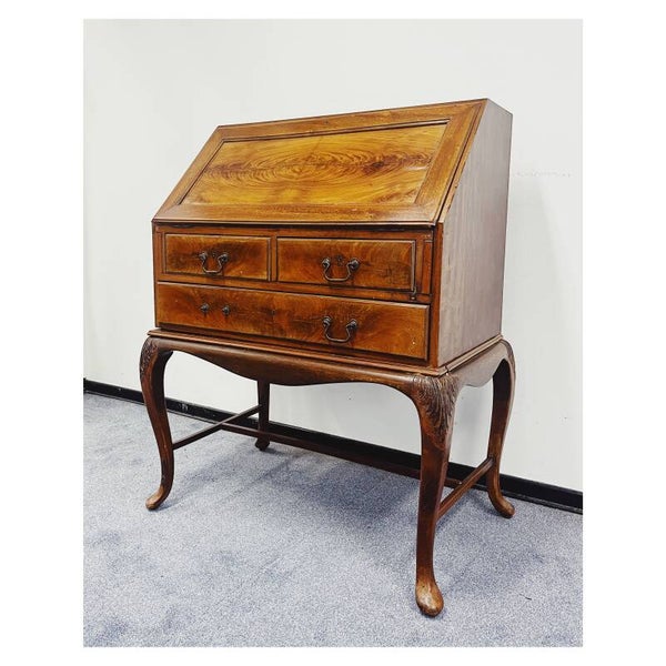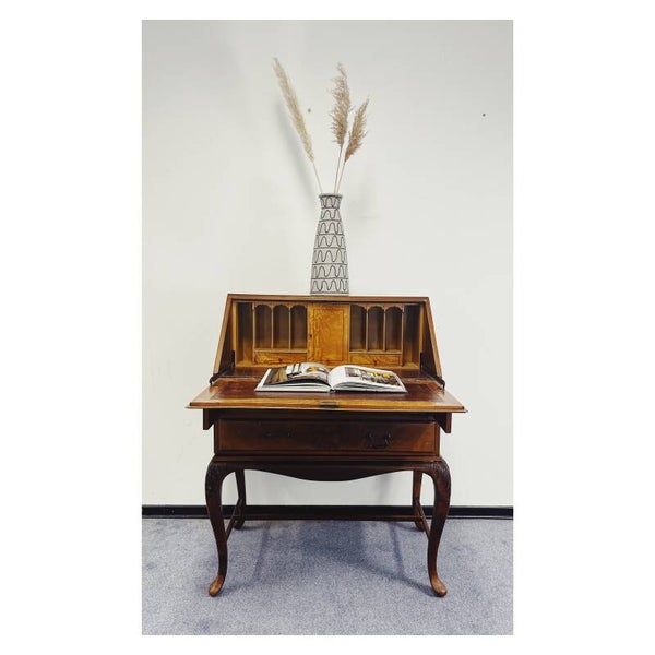 Elegante secretaire op sierlijke gebogen poten. Het bureau heeft drie ruime opbergladen met messing knopjes en een afsluitbare schrijfklep. Een van de handgrepen op de onderste brede lade mist helaas. De klep verbergt een prachtig opberg vak met kleine laden en super veel handige vakjes! Het bureau heeft wel wat zichtbare beschadigingen passend bij de leeftijd, maar kan zeker nog door voor een volgende ronde!