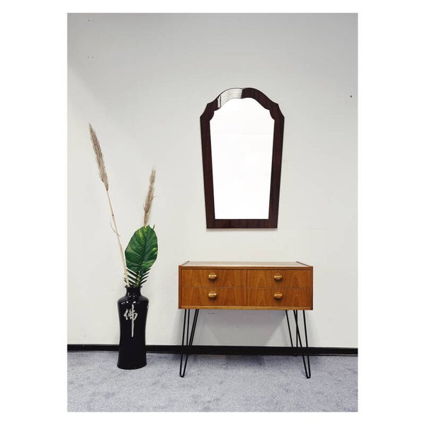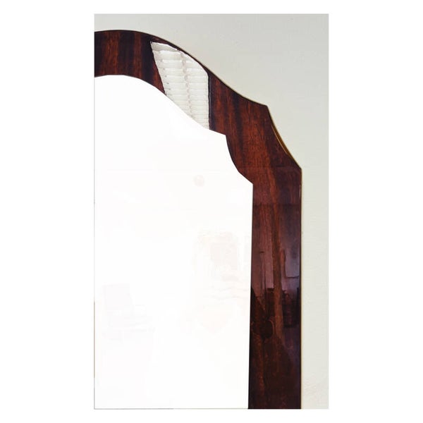 Retro spiegel met formica frame. De spiegel heeft uniek design met een donker bruin formica frame. Aan de bovenzijde zit een klein scheurtje in het formica maar is verder nog in top staat en heeft een stevig ophangsysteem.
