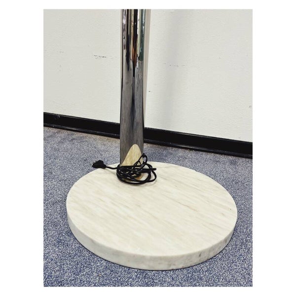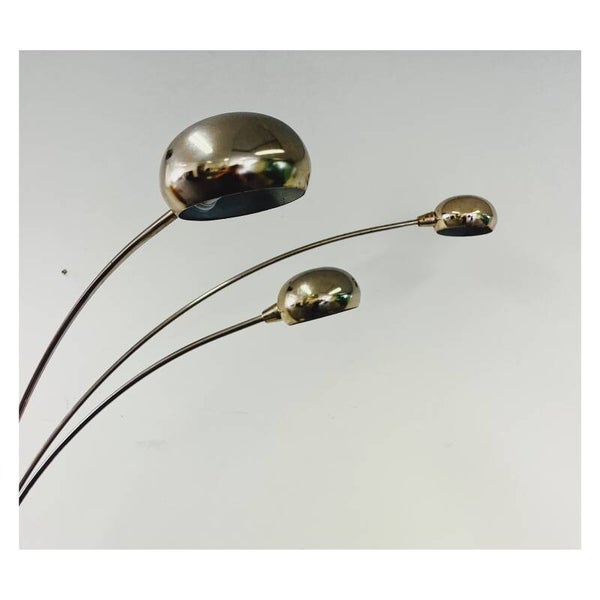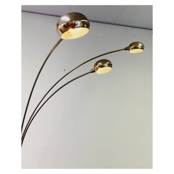 Deze drie-armige vloerlamp is toe te schrijven de Zweedse design onderneming Atelje Lyktan. De lamp is gemaakt van messing en staat op een wit marmeren voet. De stalamp is officieel gemerkt en de drie lampen werken nog naar behoren. De lampenkapjes hebben een goud/zilveren gloed maar vertonen wel wat roest plekjes. De armen zijn elk afzonderlijk verstelbaar.