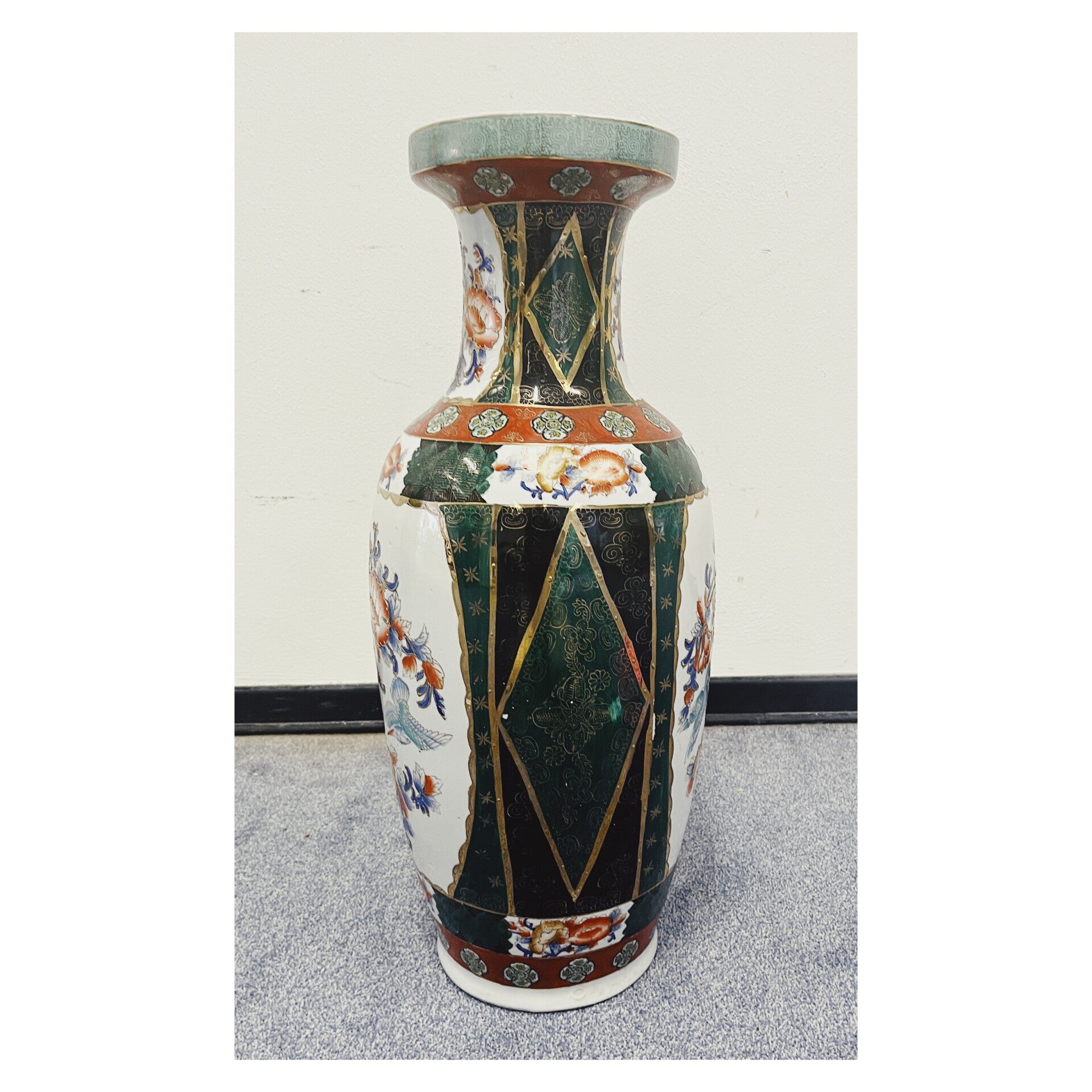 Mooie grote handgeschilderde Chinese porseleinen vaas. De vrolijke kleuren en beschilderingen maken deze vaas een aanwinst voor je interieur. De vaas verkeert in een goede gave staat! Afmetingen Hoogte: 60cm